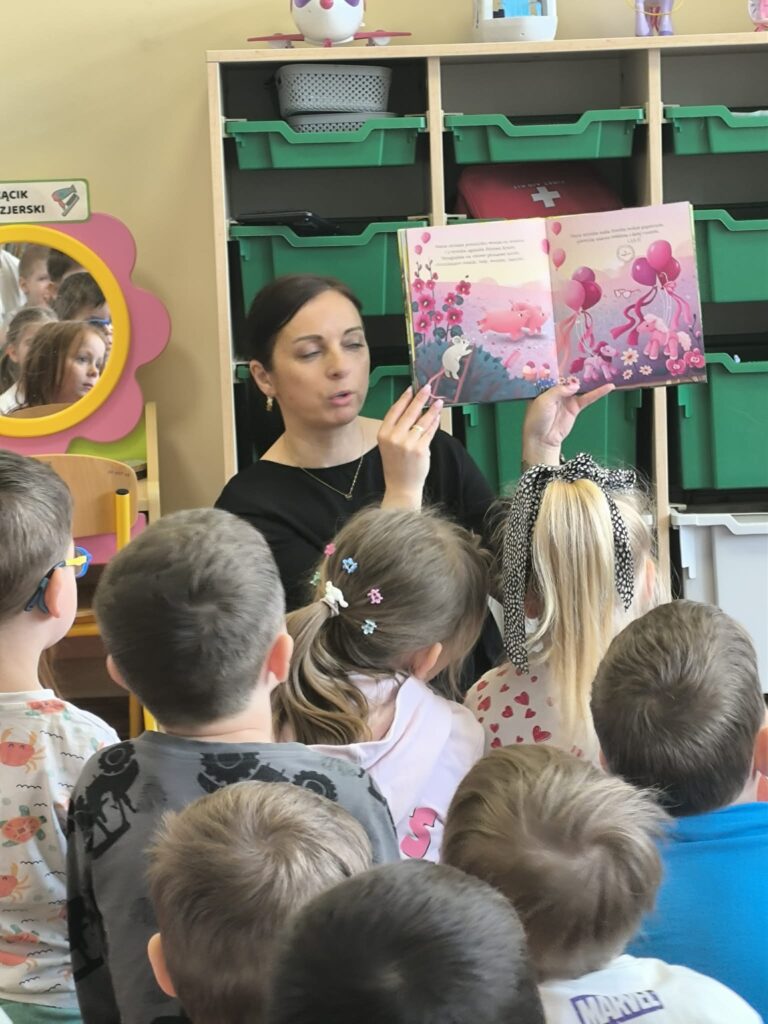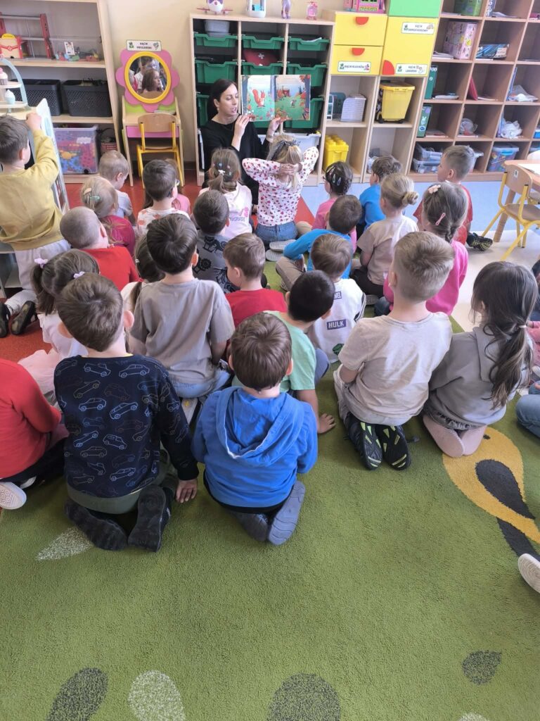 Głównym punktem spotkania w grupie „Pszczółek” było czytanie książeczek o zwierzątkach mieszkających na wsi. Dzieci z dużym skupieniem słuchały opowiadania, żywo reagując na pojawiające się w nim postacie. Już od pierwszych chwil wykazywały ogromne zainteresowanie- chętnie wskazywały ilustracje, nazywały znane im zwierzęta oraz próbowały odgadywać , jakie zwierzątko pojawi się na kolejnej stronie. Szczególną radośc sprawiło im naśladowanie odgłosów zwierząt, takich jak krowa, koń, kura czy owca, co wprowadziło element zabawy. Na zakończenie „Pszczółki” miały możliwość obejrzenia książeczki, w której znajdowały się elementy ruchome i takie ze specjalnej faktury.