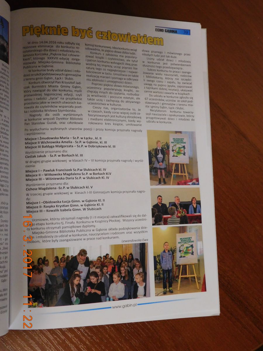 Jednocześnie miło nam, że możemy przeczytać w nim artykuł, który dotyczy naszej instytucji. Opisany został konkurs recytatorski im. Janusza Korczaka „Pięknie być człowiekiem”, którego współorganizatorem jest nasza biblioteka. Była to XXXVIII edycja a już niedługo bo 27 kwietnia nasi najmłodsi i trochę starsi mieszkańcy zaprezentują przygotowane przez siebie wiersze i fragmenty prozy. Jesteśmy pewni, że również w tym roku poziom będzie bardzo wysoki. Wszyscy uczestnicy są bardzo zdolni, wykazują chęć poznawania literatury, a obcowanie z książka sprawia im ogromna radość.