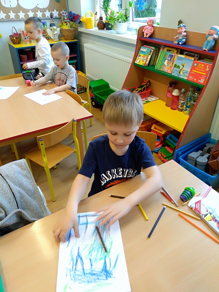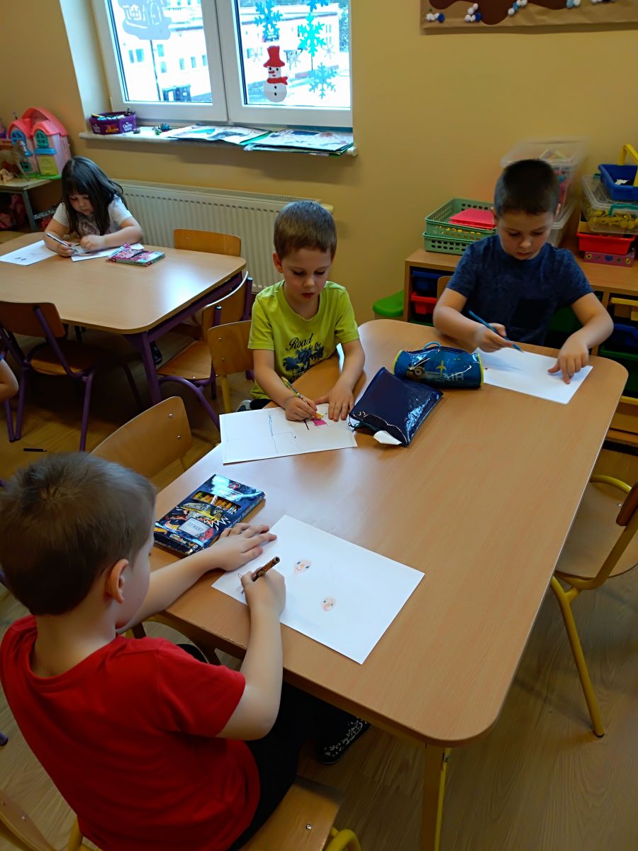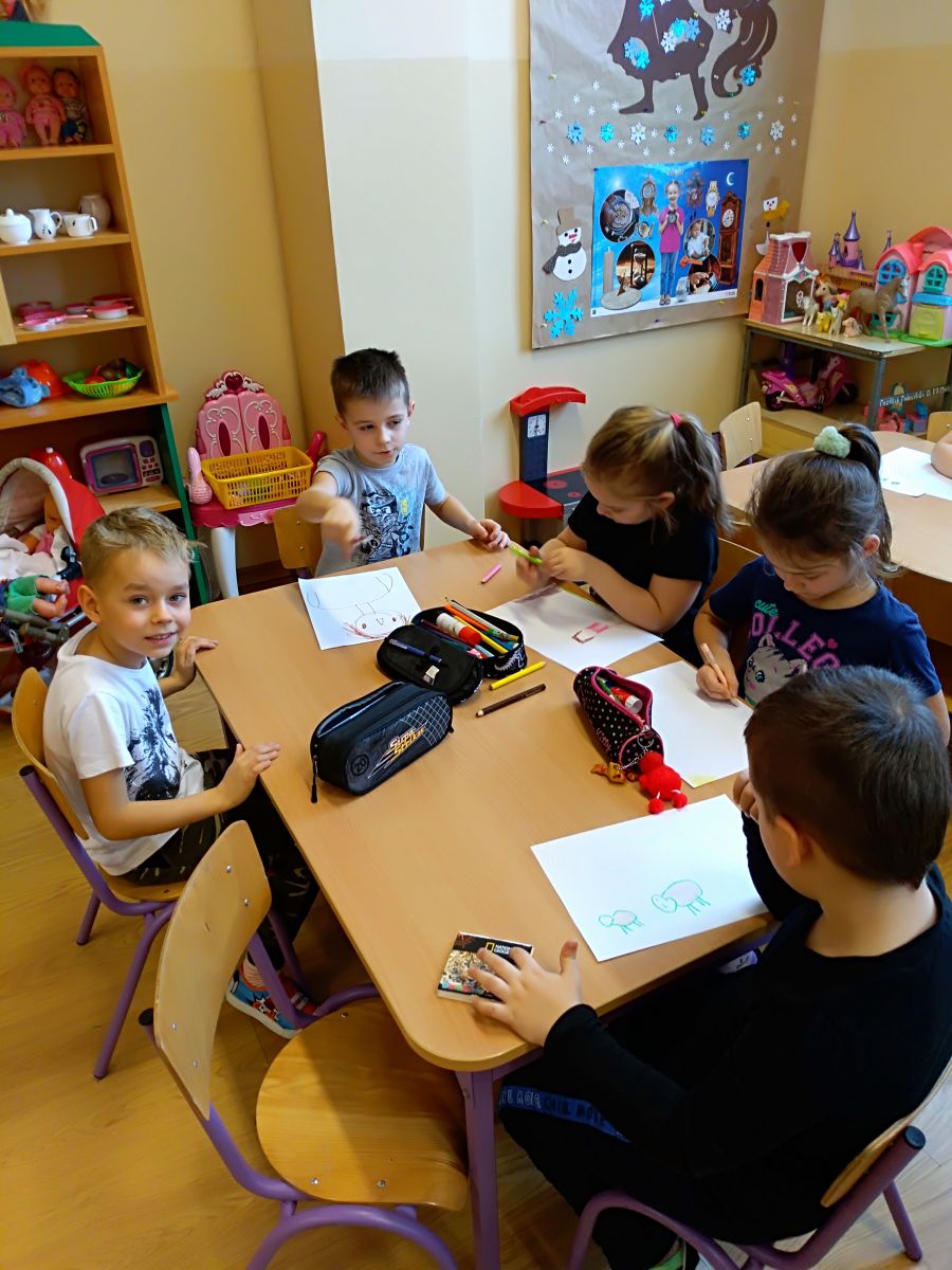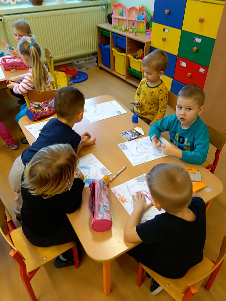 Najmłodsza grupa „Krasnali” kolorowała jednorożce umieszczone na szablonach. Dzieci bardzo się zaangażowały, wykonując swoje prace. Z pozostałą grupą „Skrzatów” i „Witaminek” rozmawiałam o przyjaźni i czytałam bajkę pt. „Dzień z Vaianną” Walta Disneya. Nawiązując do tematu spotkania dzieci narysowały na kartkach papieru swoich przyjaciół.