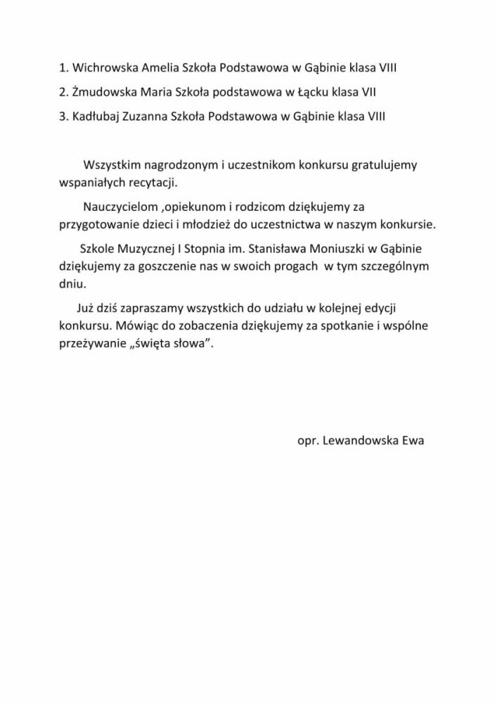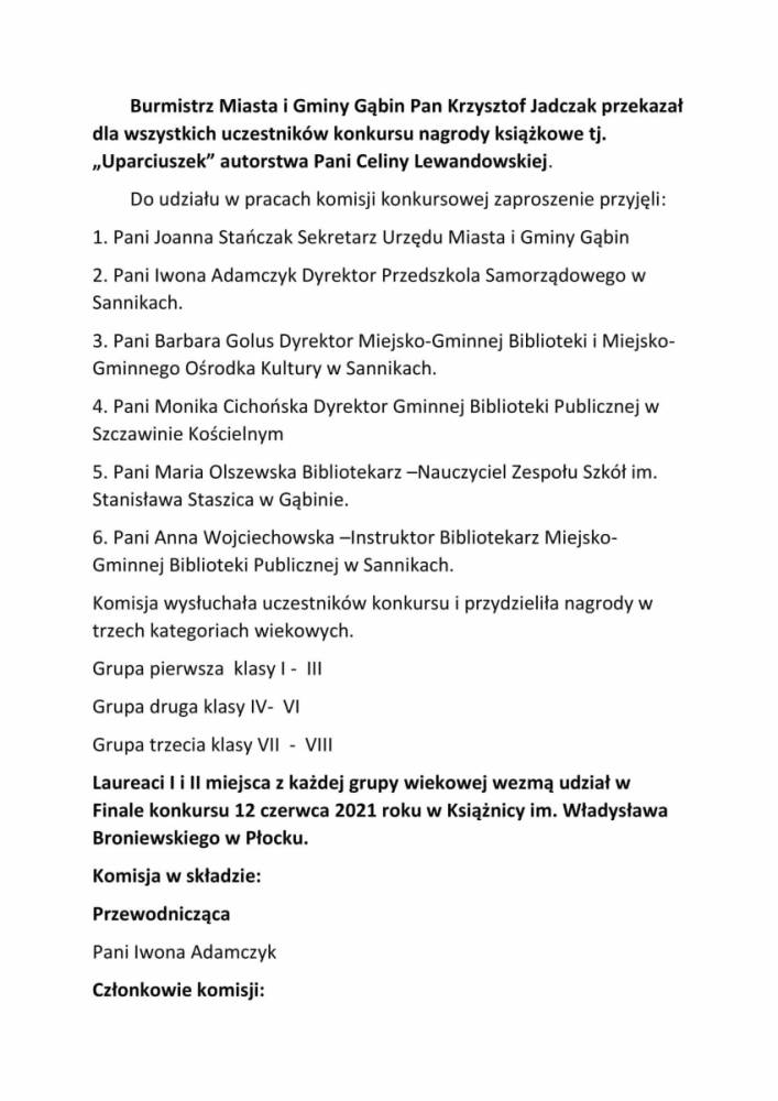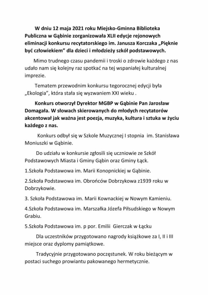 Dn. 12.05.2021 r. w Szkole Muzycznej I st. im. S. Moniuszki w Gąbinie odbyły się rejonowe eliminacje XLII Konkursu Recytatorskiego dla dzieci i młodzieży im. Janusza Korczaka „Pięknie być człowiekiem”. Umieszczamy krótką fotorelację z wydarzenia. Więcej zdjęć udostępnimy Państwu już wkrótce.