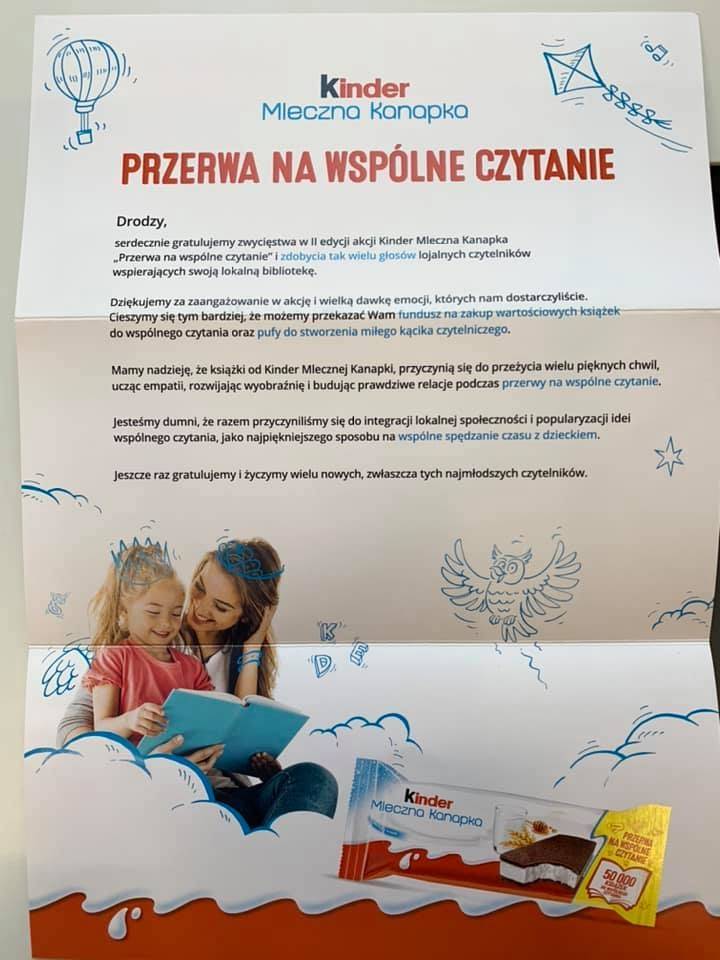 W 2019 roku przystąpiliśmy do akcji WSPÓLNE CZYTANIE Z KINDER MLECZNĄ KANAPKĄ.