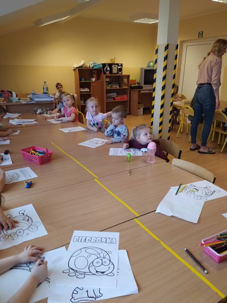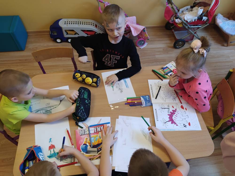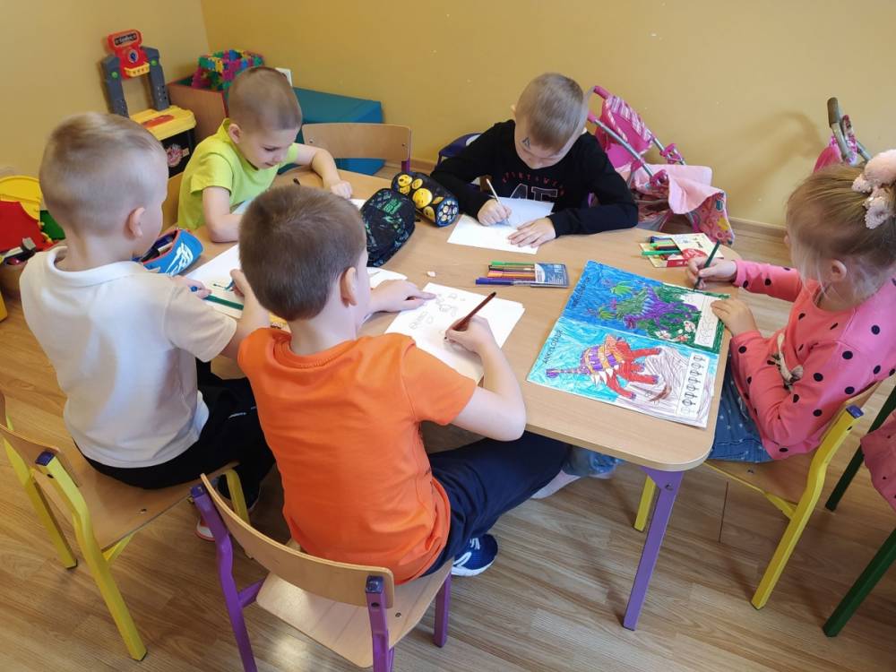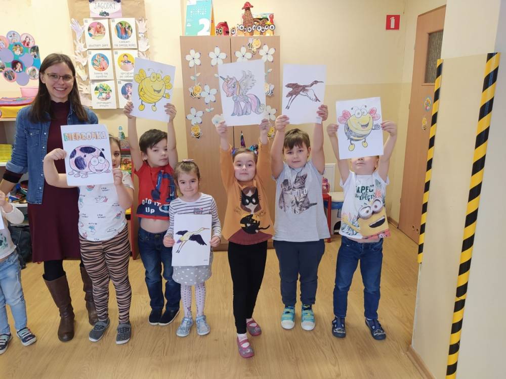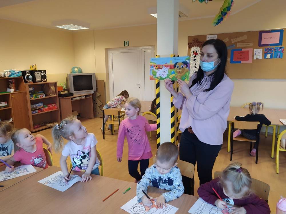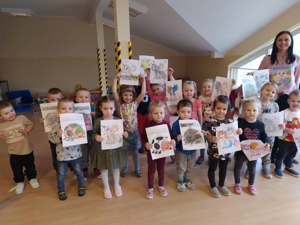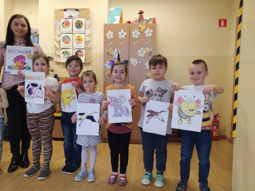 Pani Asia przeczytała „Jagódkom” bajeczkę pt. „Przytulozaur”. Mali Czytelnicy dodatkowo  pokolorowali obrazki jednorożca, pszczółki, bociana.