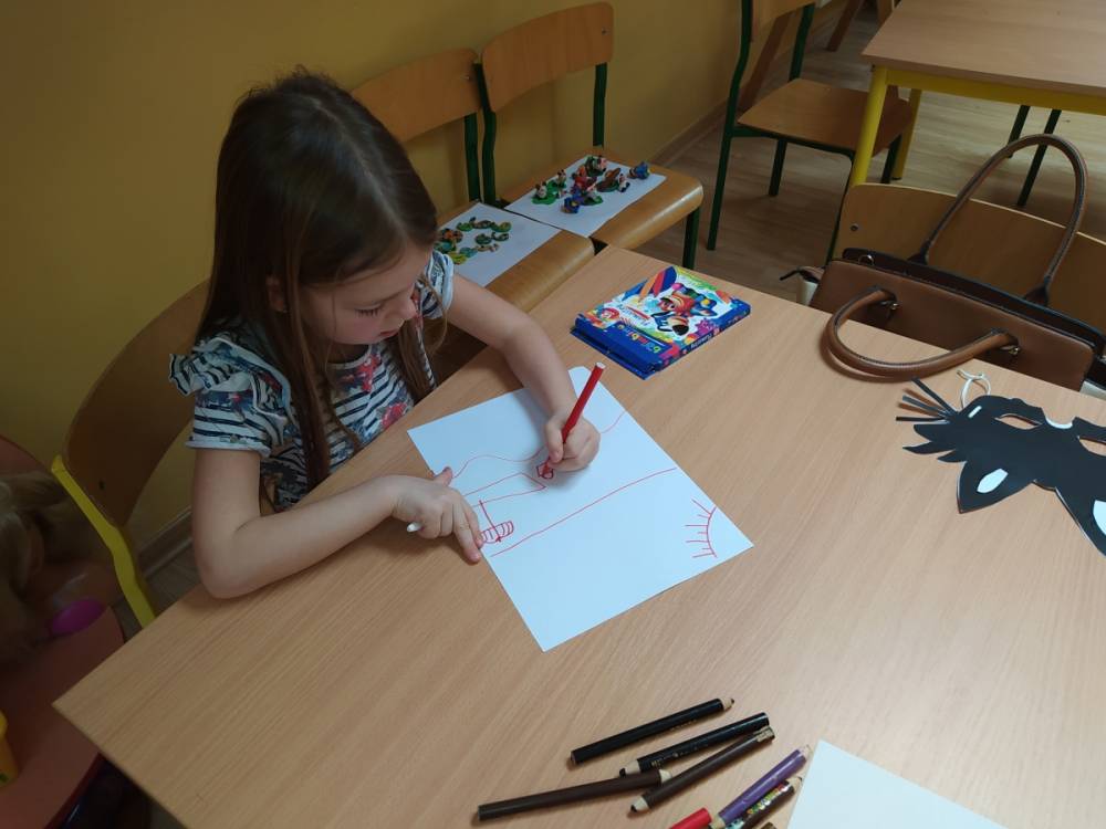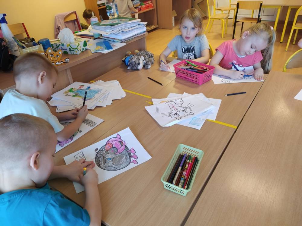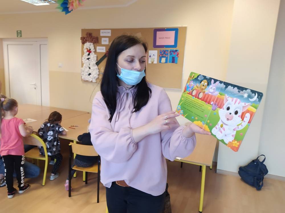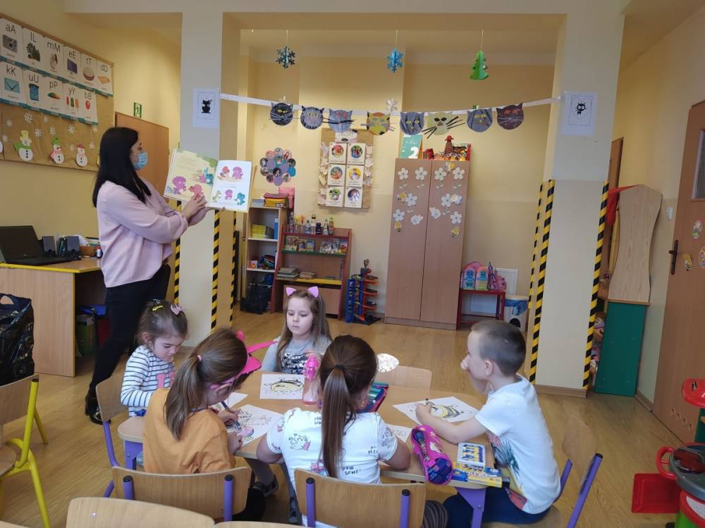 Najmłodszym grupom tj. „Smerfom” oraz „Biedronkom” zaprezentowałyśmy książeczkę pt. „Zając i żółw” oraz bajeczkę o przygodach „Małej Kotki”. Milusińscy kolorowali również szablony zwierzątek.