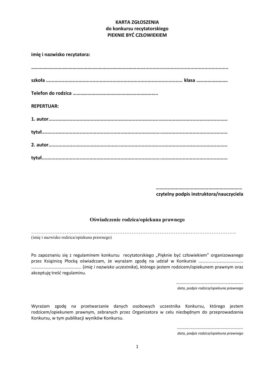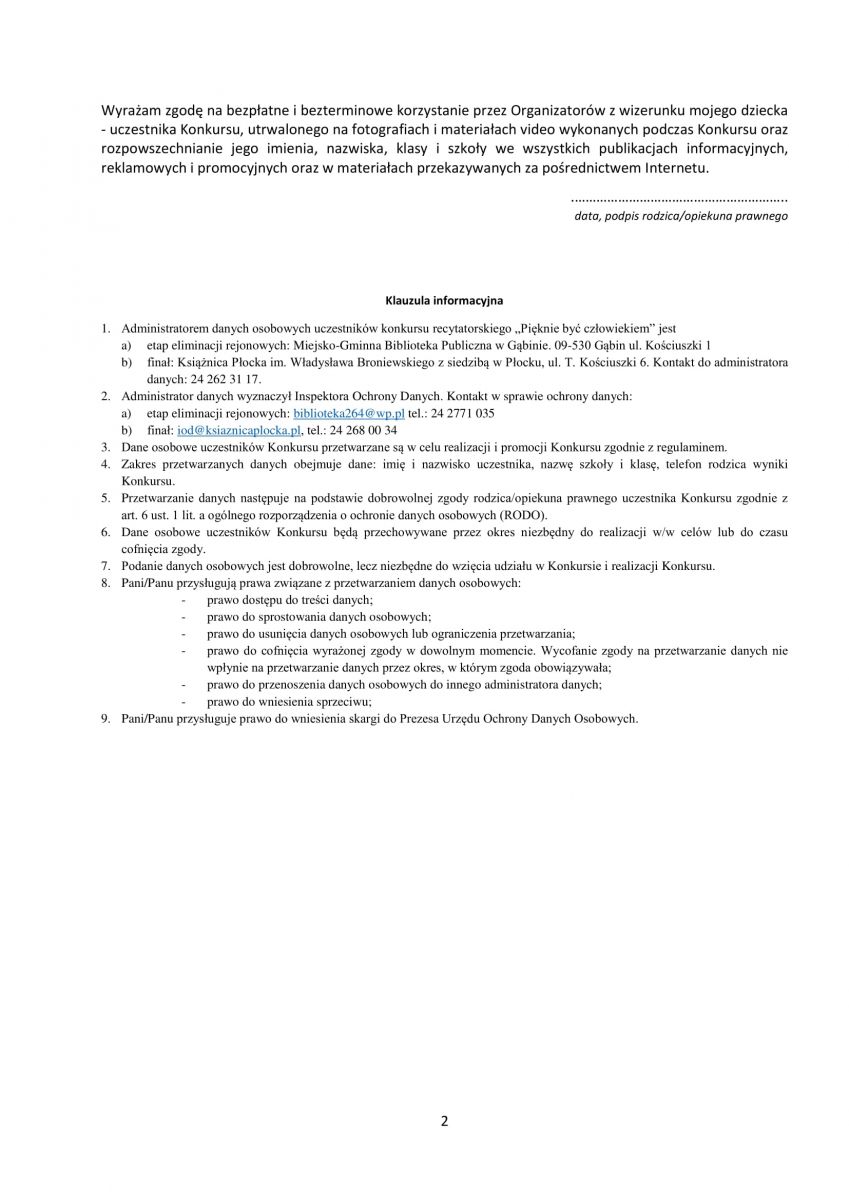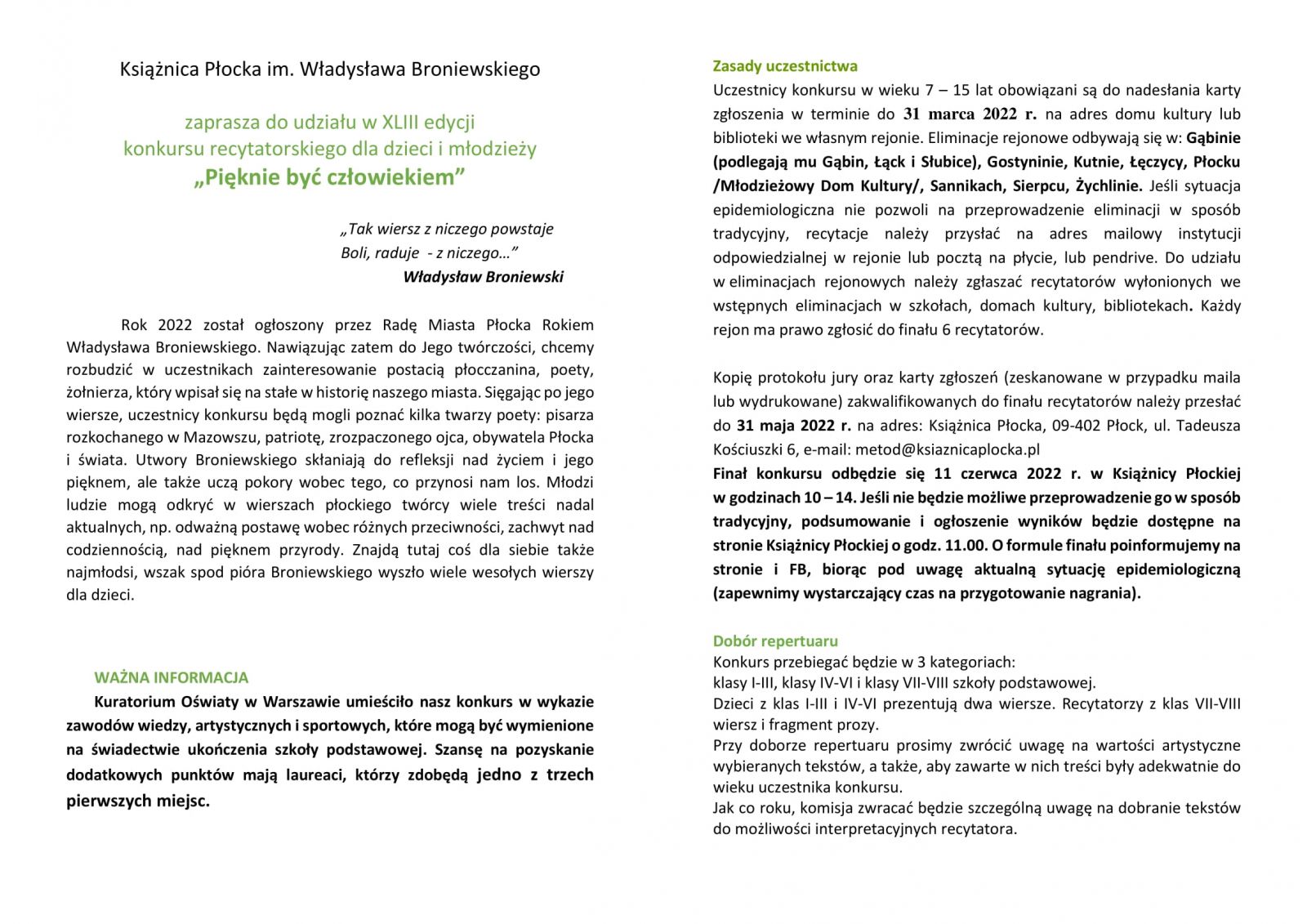Miejsko-Gminna Biblioteka Publiczna w Gąbinie, organizator eliminacji rejonowych zaprasza: dzieci, młodzież, nauczycieli, opiekunów i rodziców do udziału w XLIII edycji konkursu recytatorskiego „Pięknie być człowiekiem”.