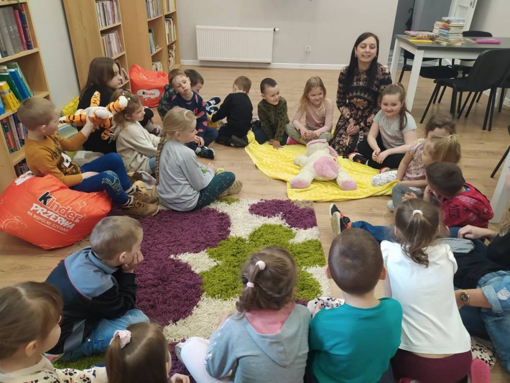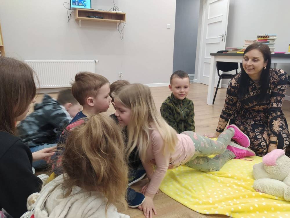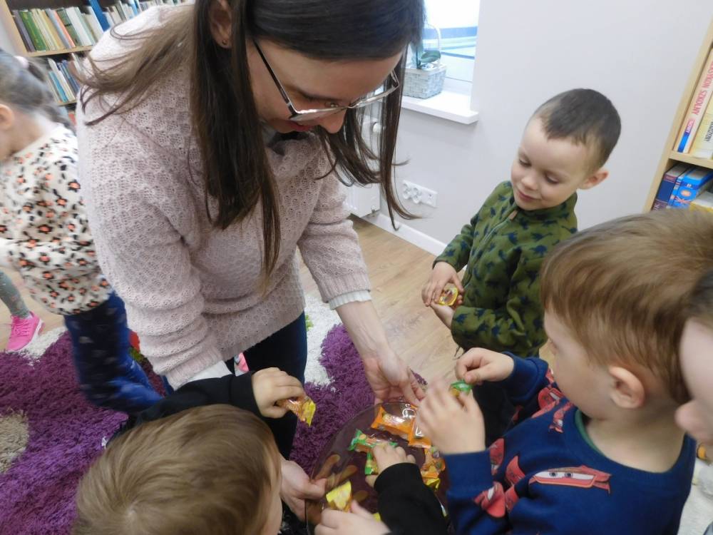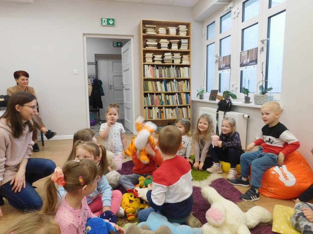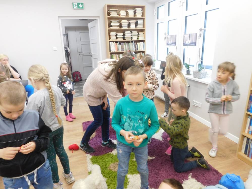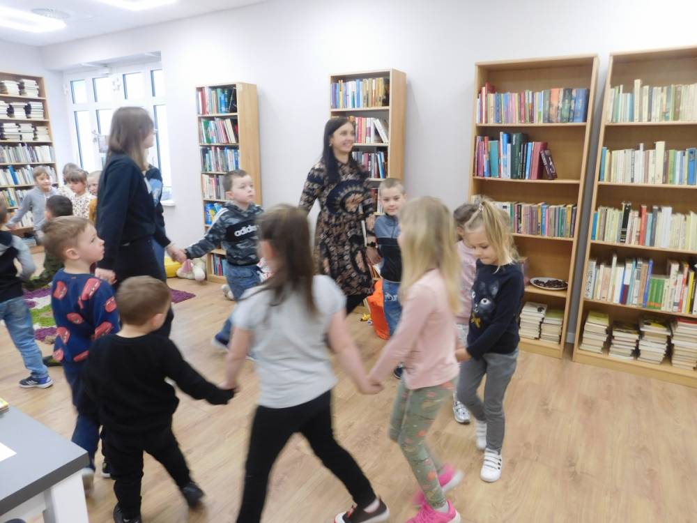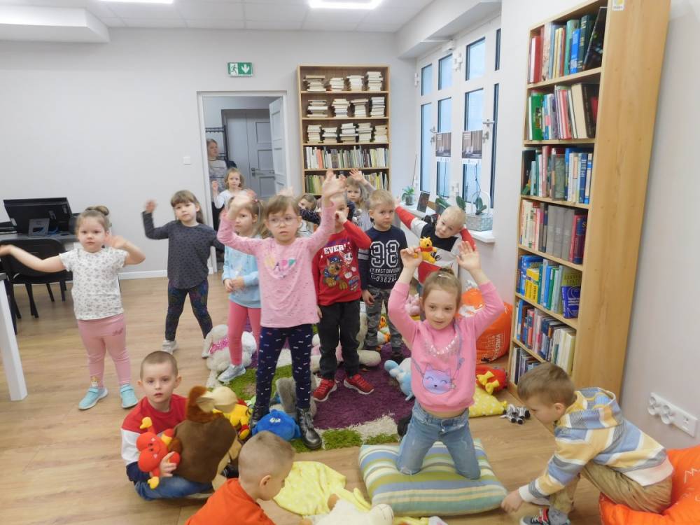 W dalszej części spotkania Pani Joanna Olejniczak i Pani Karolina Kędzia wspólnie z Milusińskimi bawili się w „Głuchy telefon”. Przy rytmach piosenki pt. „Fruzia w bibliotece” wszyscy tańczyli w kółeczku, podskakując, klaszcząc, rozdając dookoła swoje śliczne uśmiechy.