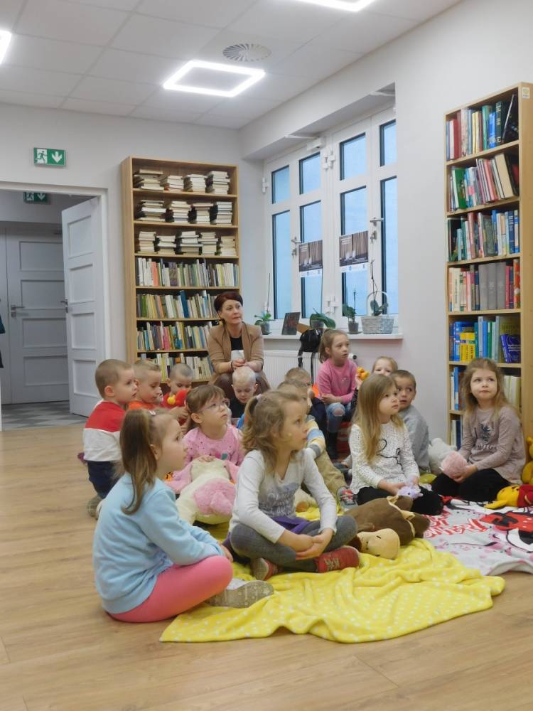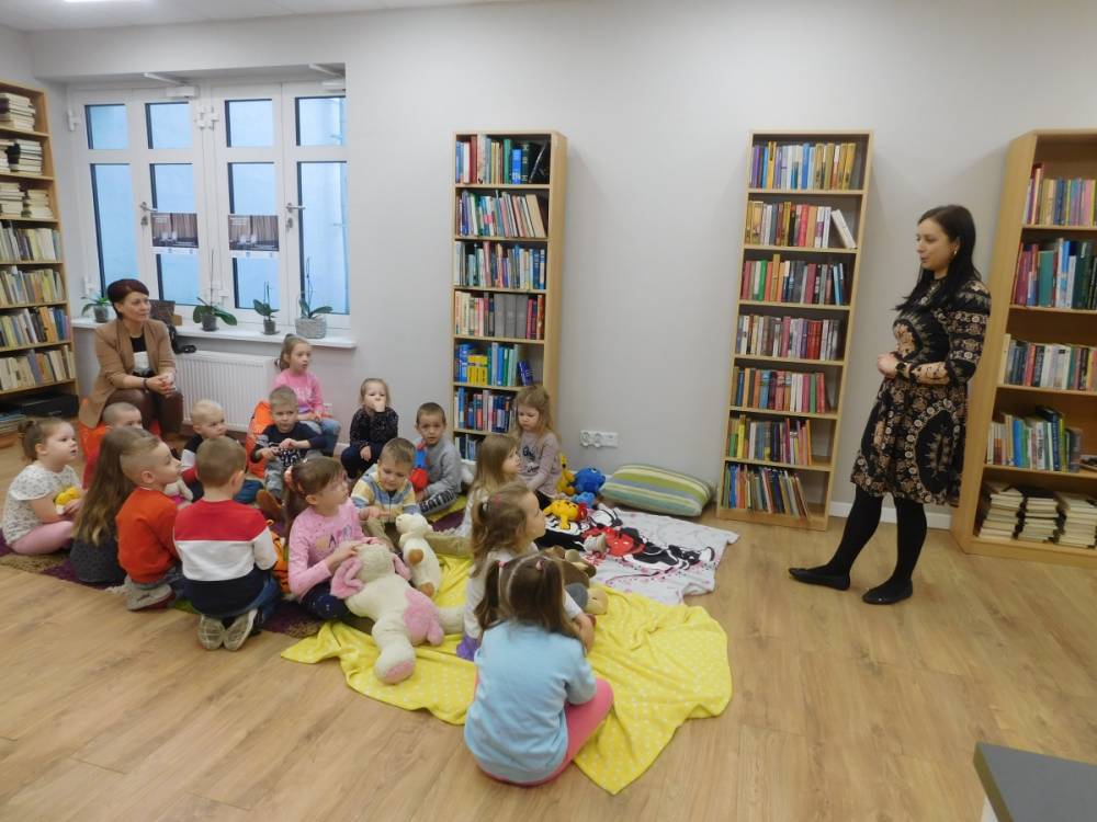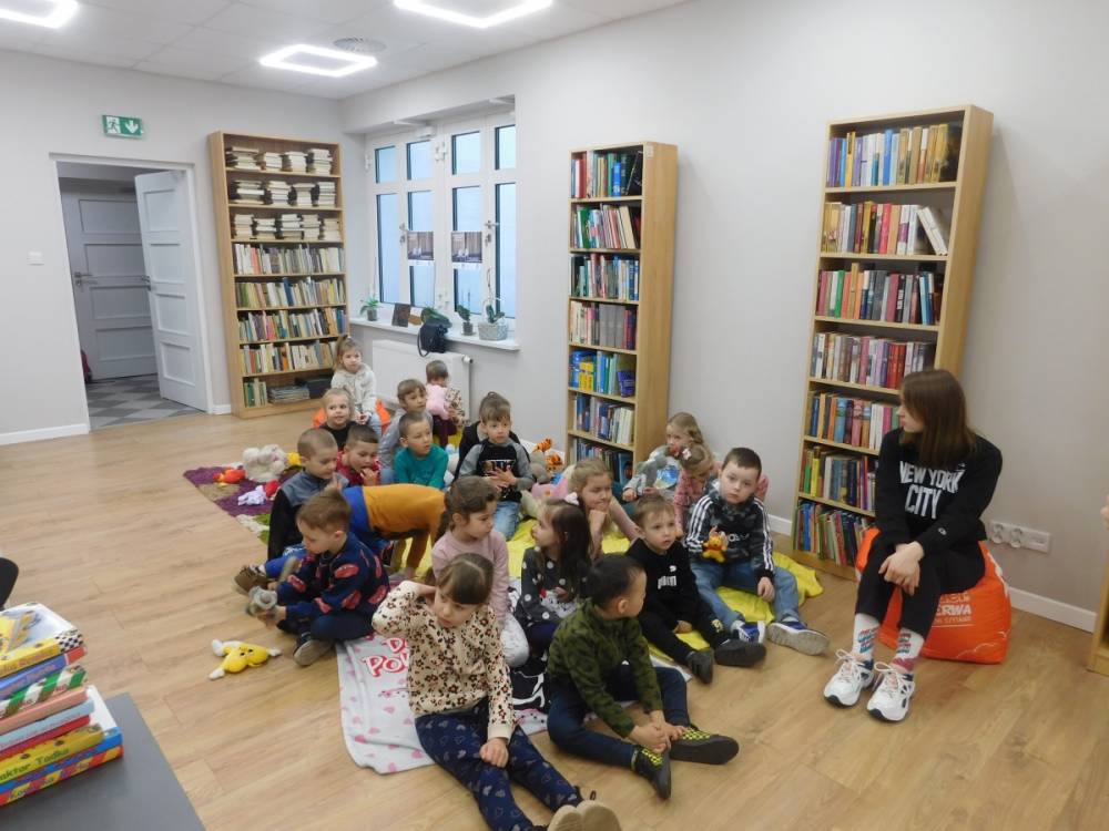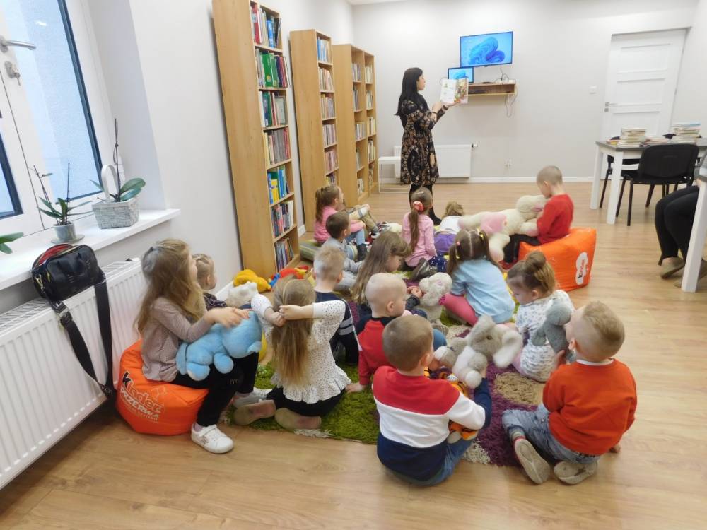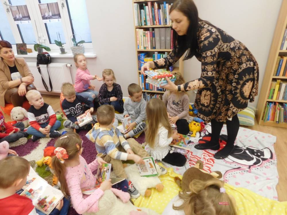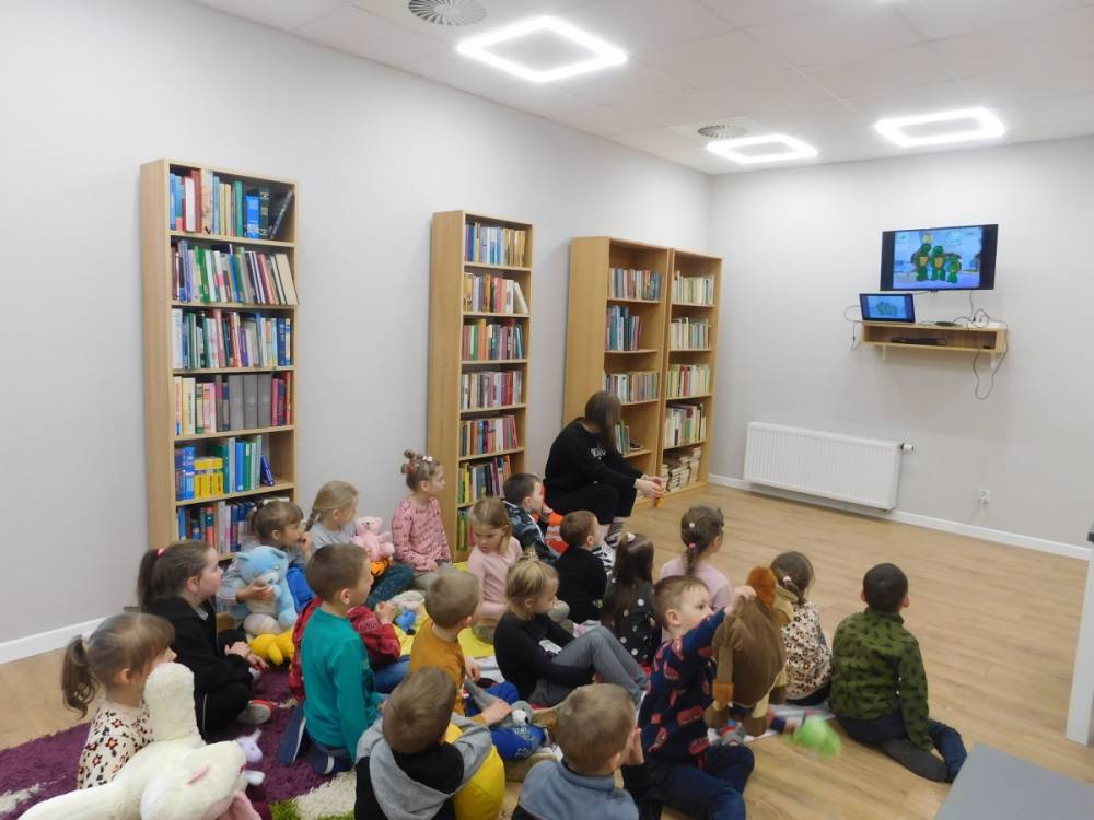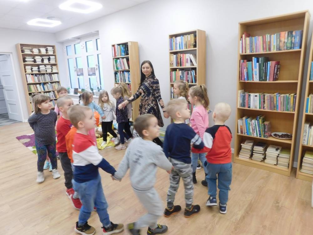 Z kolejną grupą „Biedronek” Pani Karolina również omówiła sposób zapisania się do Książnicy. Dzieci przeglądały książeczki, jakie znajdują się na półkach bibliotecznych. „Biedronki” z dużym zainteresowaniem obejrzały bajeczkę pt. „Franklin w bibliotece”. Chętnie wzięły udział w dyskusji po zakończonym filmie. Dowiedziały się, że książeczki z biblioteki należy zwracać w terminie, zapamiętały ile pozycji można wypożyczyć i na jaki okres czasu. Mali Czytelnicy chętnie poruszali się w rytm „piosenek o bibliotece”, tańcząc i bawiąc się we wspólnym kółeczku.