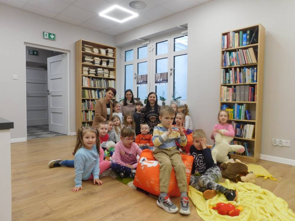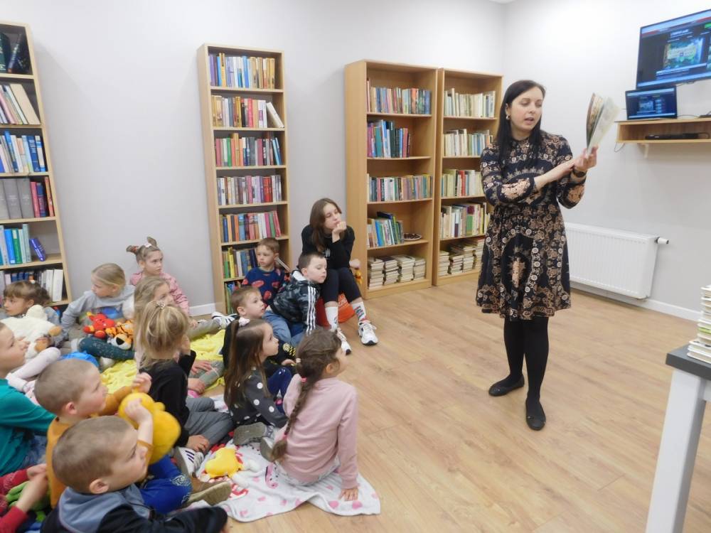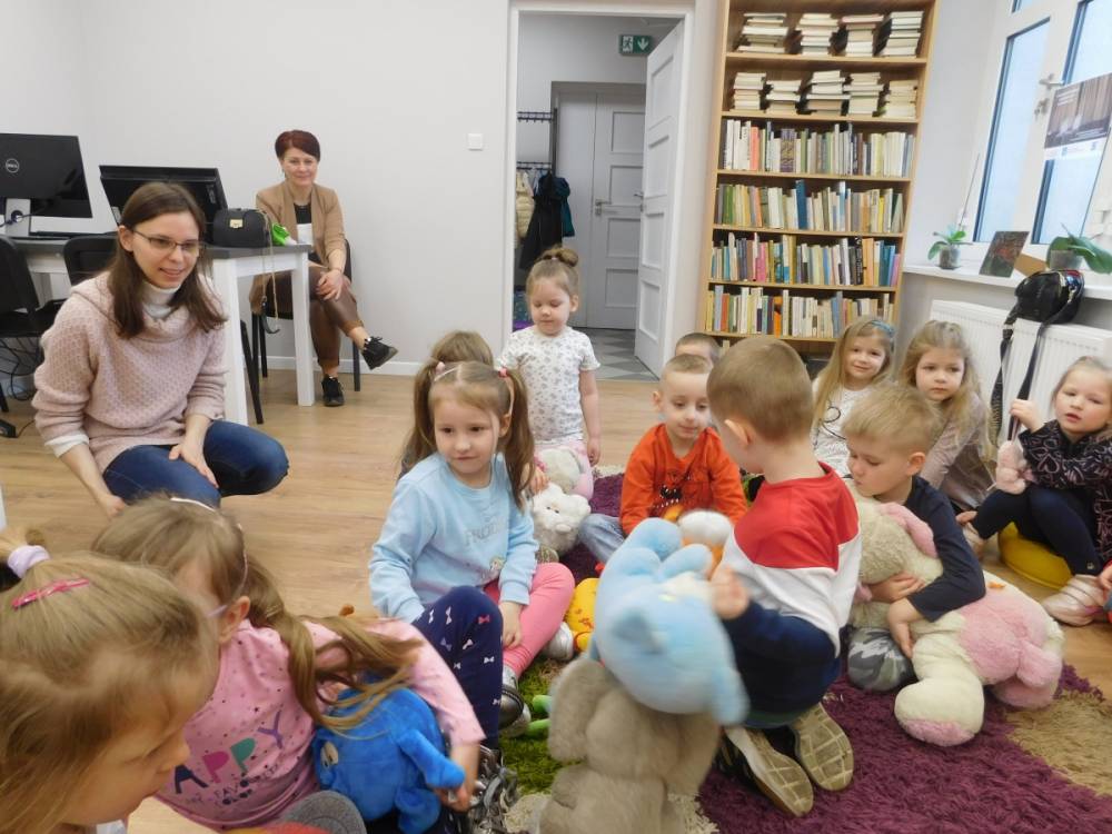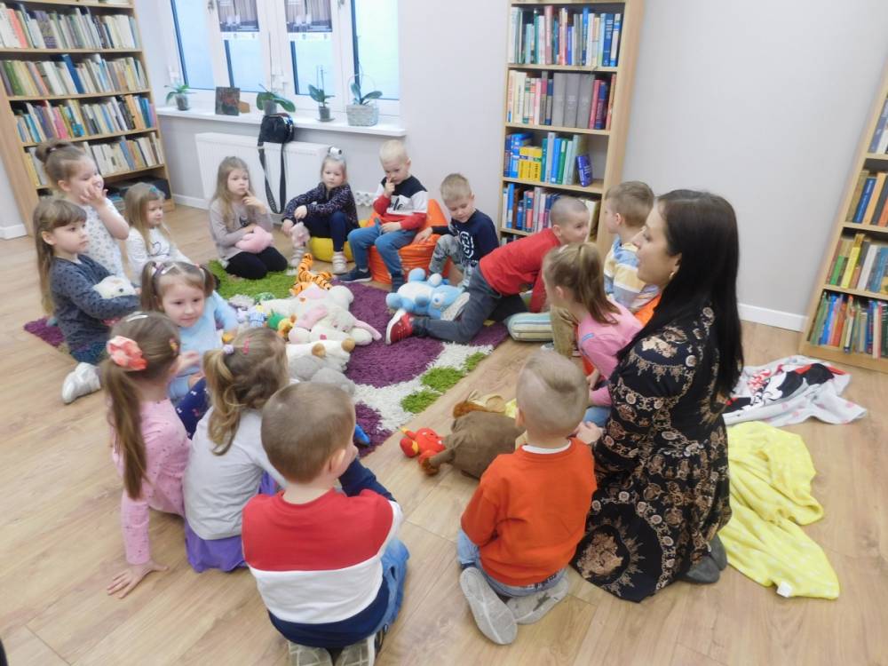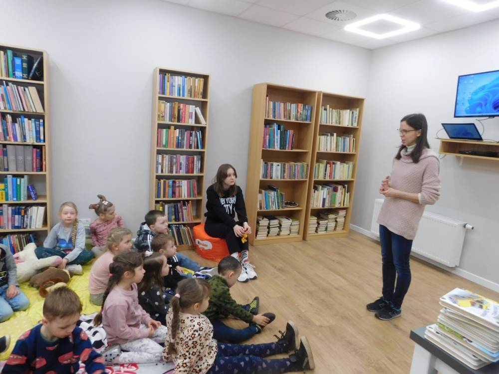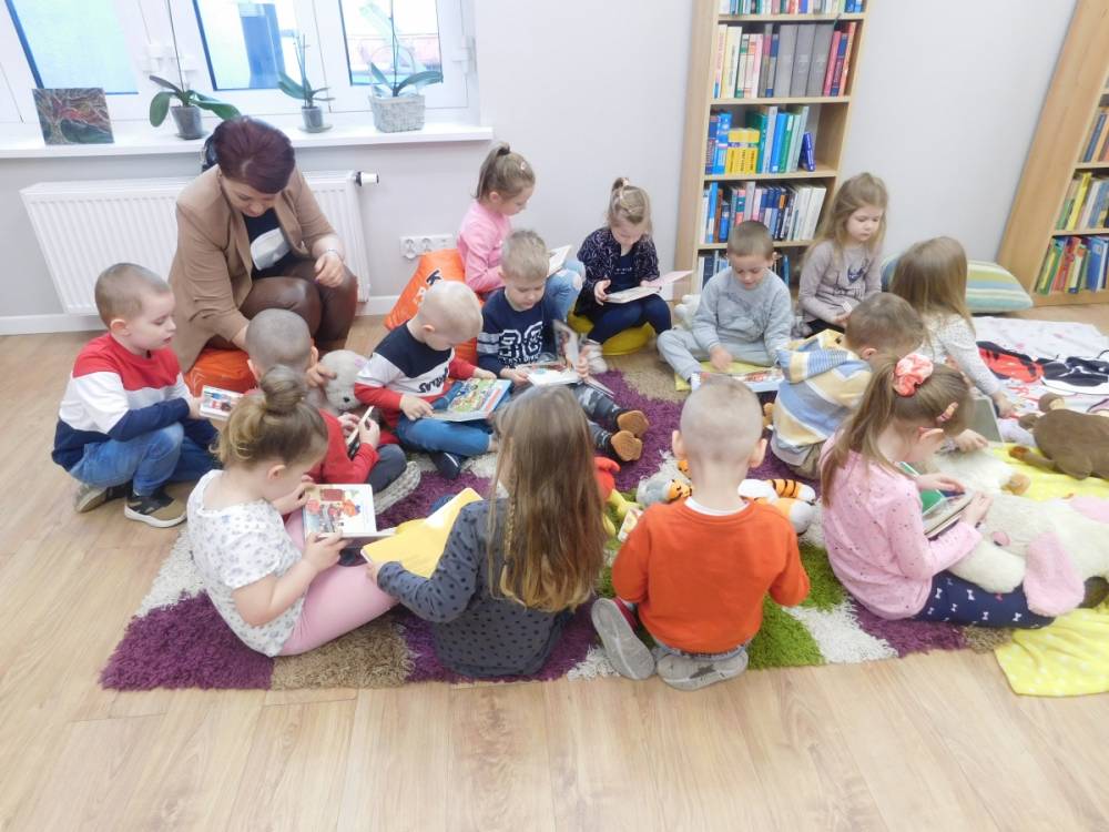 Z kolejną grupą „Biedronek” Pani Karolina również omówiła sposób zapisania się do Książnicy. Dzieci przeglądały książeczki, jakie znajdują się na półkach bibliotecznych. „Biedronki” z dużym zainteresowaniem obejrzały bajeczkę pt. „Franklin w bibliotece”. Chętnie wzięły udział w dyskusji po zakończonym filmie. Dowiedziały się, że książeczki z biblioteki należy zwracać w terminie, zapamiętały ile pozycji można wypożyczyć i na jaki okres czasu. Mali Czytelnicy chętnie poruszali się w rytm „piosenek o bibliotece”, tańcząc i bawiąc się we wspólnym kółeczku.