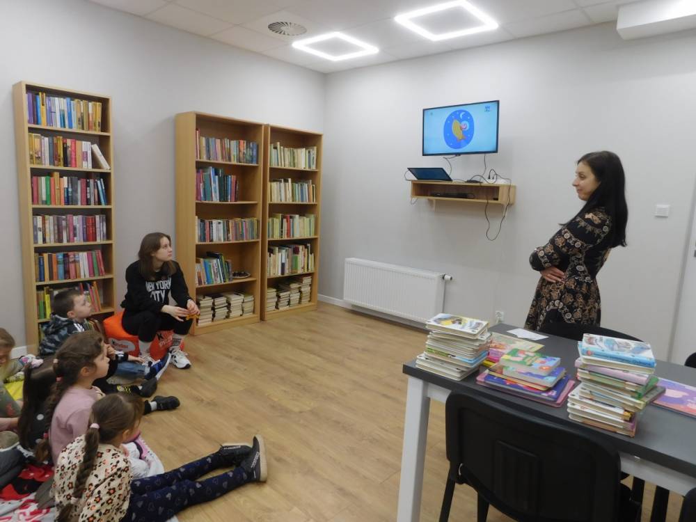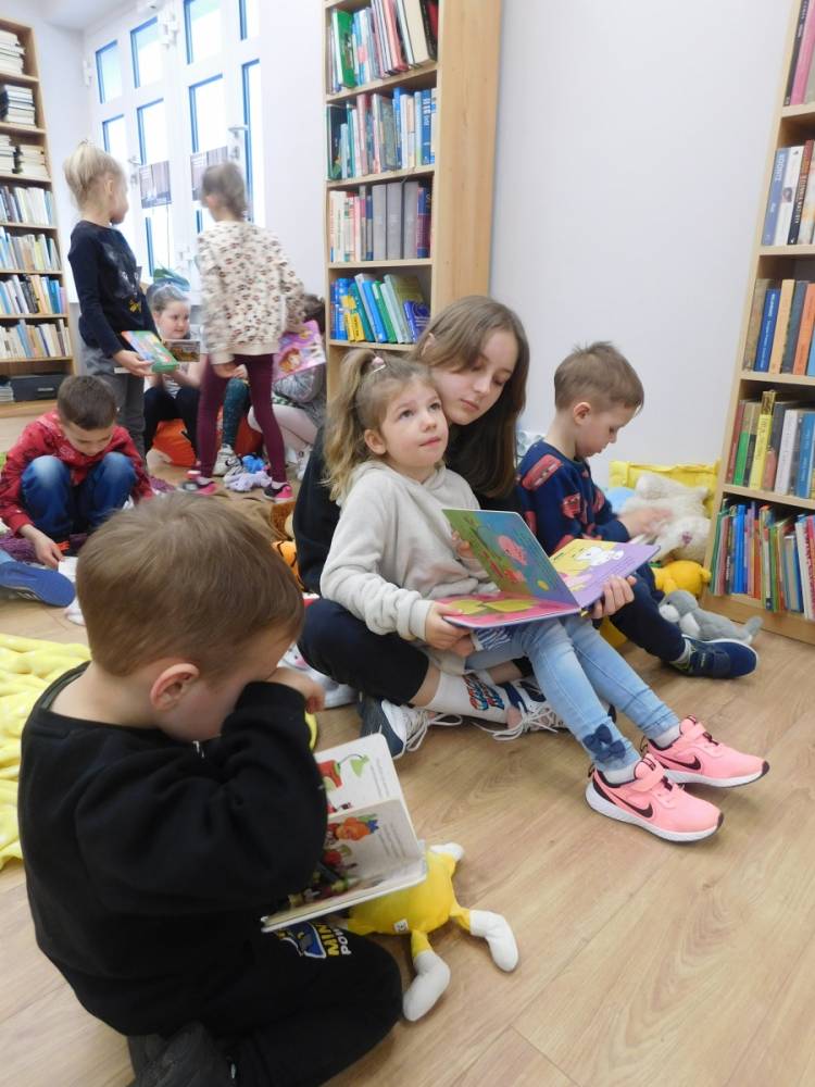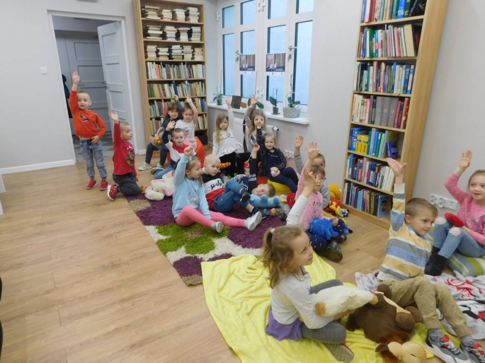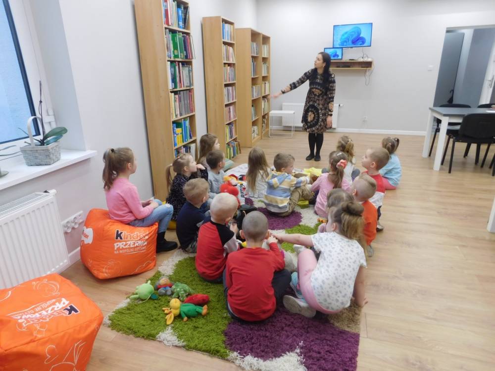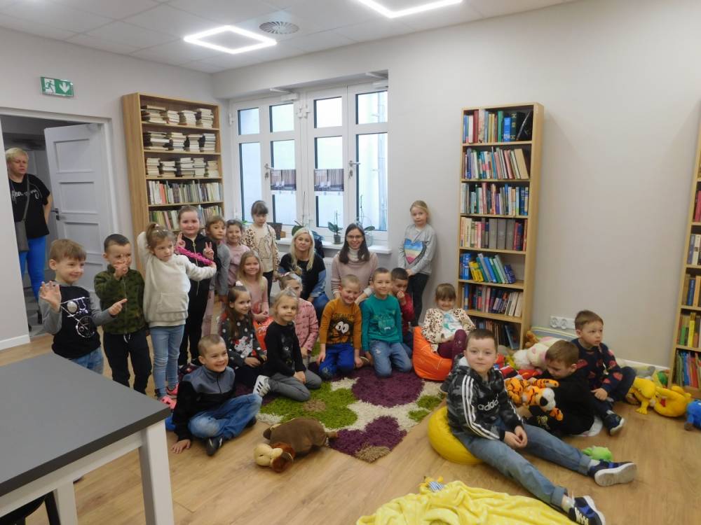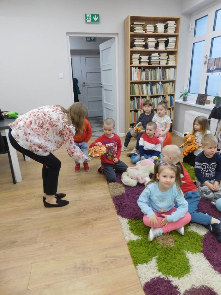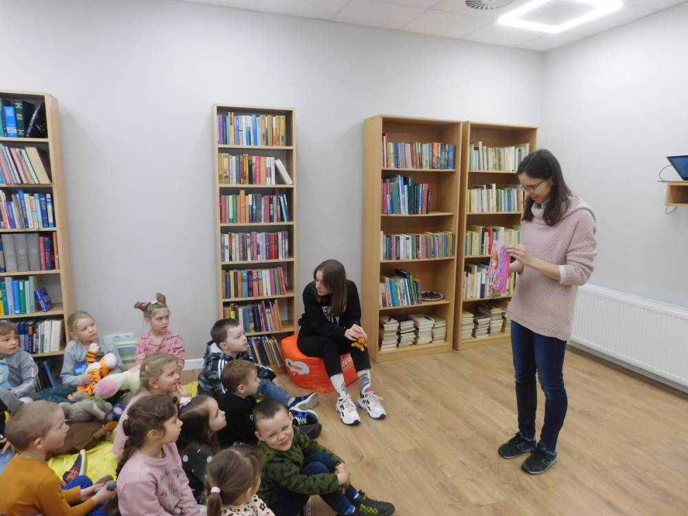 Z kolejną grupą „Biedronek” Pani Karolina również omówiła sposób zapisania się do Książnicy. Dzieci przeglądały książeczki, jakie znajdują się na półkach bibliotecznych. „Biedronki” z dużym zainteresowaniem obejrzały bajeczkę pt. „Franklin w bibliotece”. Chętnie wzięły udział w dyskusji po zakończonym filmie. Dowiedziały się, że książeczki z biblioteki należy zwracać w terminie, zapamiętały ile pozycji można wypożyczyć i na jaki okres czasu. Mali Czytelnicy chętnie poruszali się w rytm „piosenek o bibliotece”, tańcząc i bawiąc się we wspólnym kółeczku.