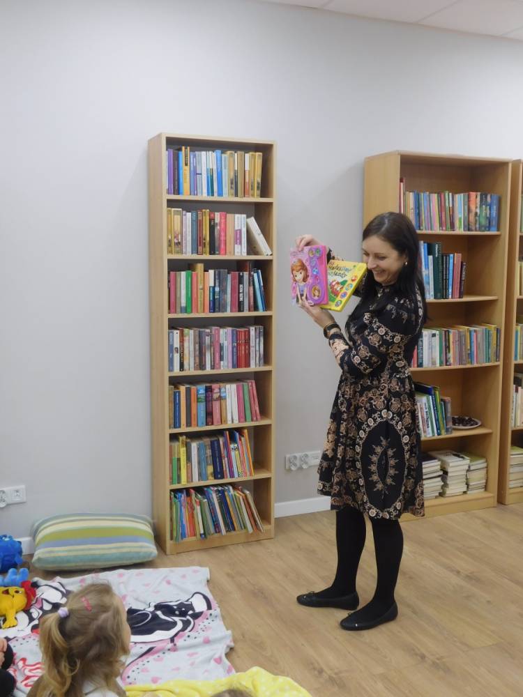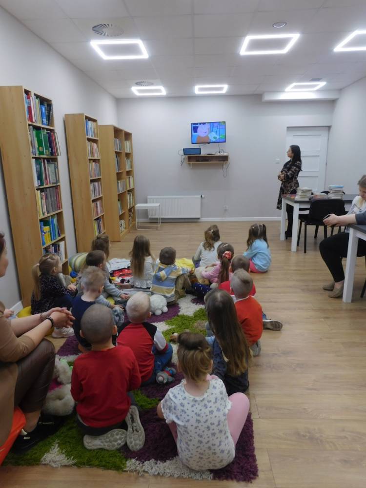 Pierwsza grupa „Motyli” dowiedziała się w jaki sposób zapisać się do biblioteki, poznała zasady jak należy dbać o książeczkę. Dzieci zasiadając przed telewizorem obejrzały bajeczkę pt. „Świnka Peppa w bibliotece” oraz „Kicia Kocia w bibliotece”. Wysłuchały również bajki pt. „Franklin i książeczka z biblioteki”.