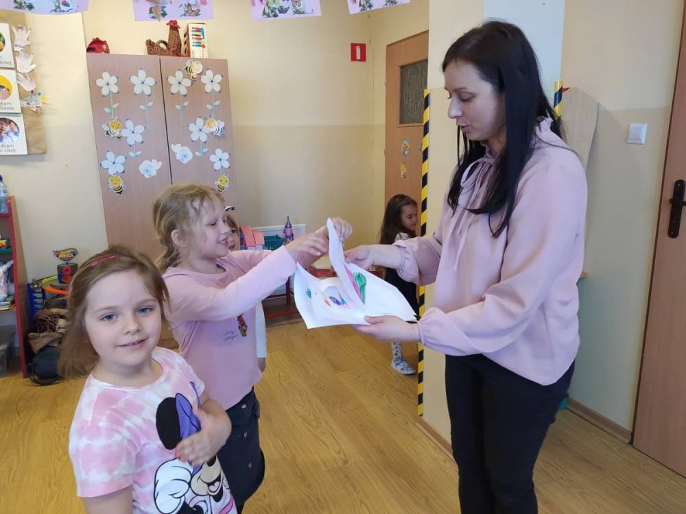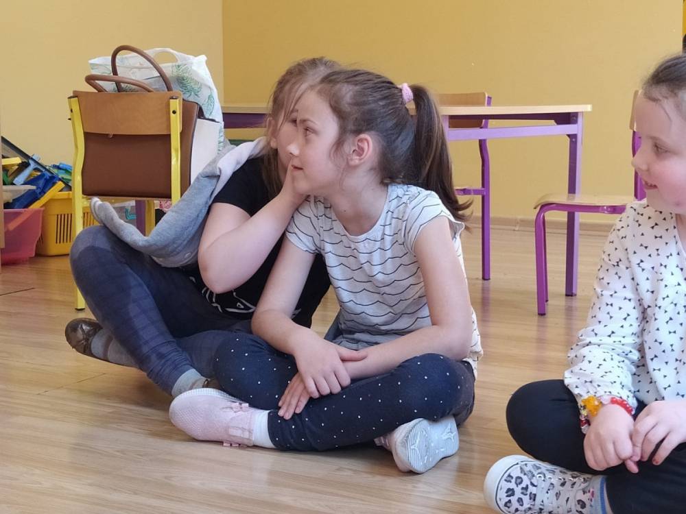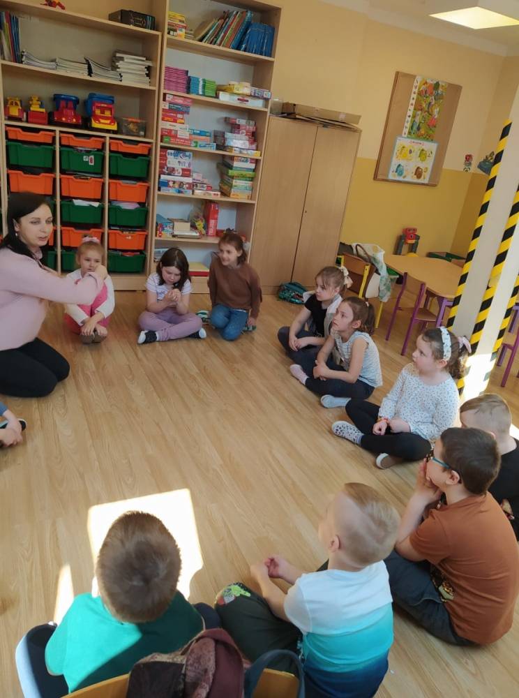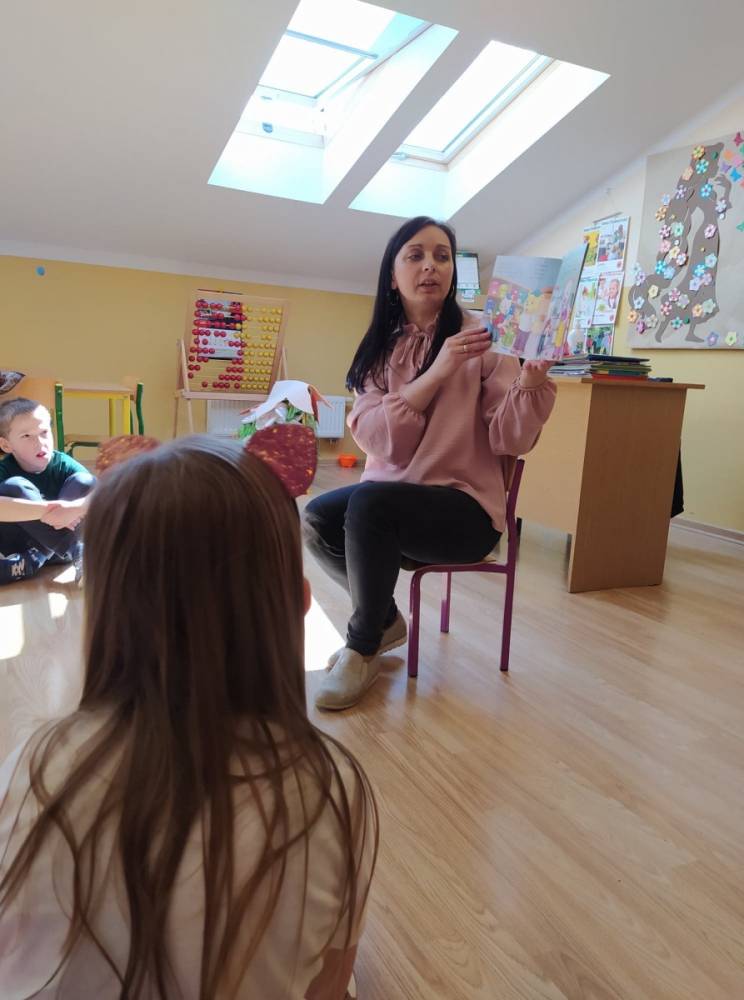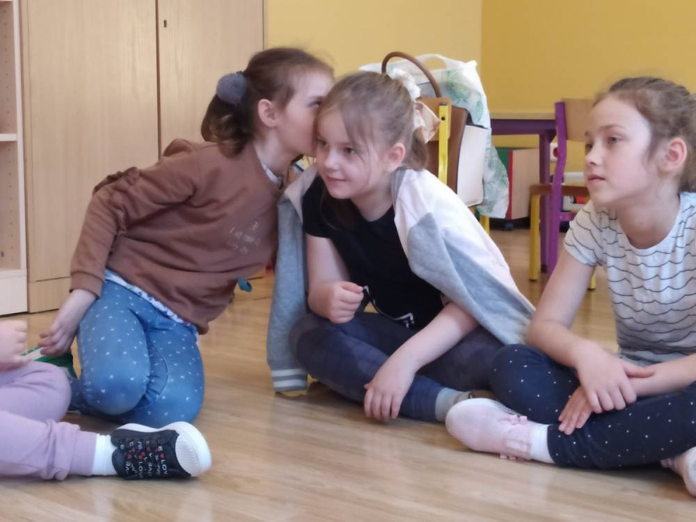 Po krótkiej przerwie znów gościły w czterech grupach tj. „Sowy”, „Jagódki”, „Biedronki” i „Smerfy”. Najstarsza z nich „Sowy” z dużym zainteresowaniem wysłuchała przygód kotka w bajce pt. „Wybacz mi. Magiczne słowa Leopolda”. W dalszej części spotkania Panie wspólnie z dziećmi bawiły się w „Głuchy telefon”. Przedszkolakom ta gra bardzo przypadła do gustu, wywołała wiele uśmiechów i radości.