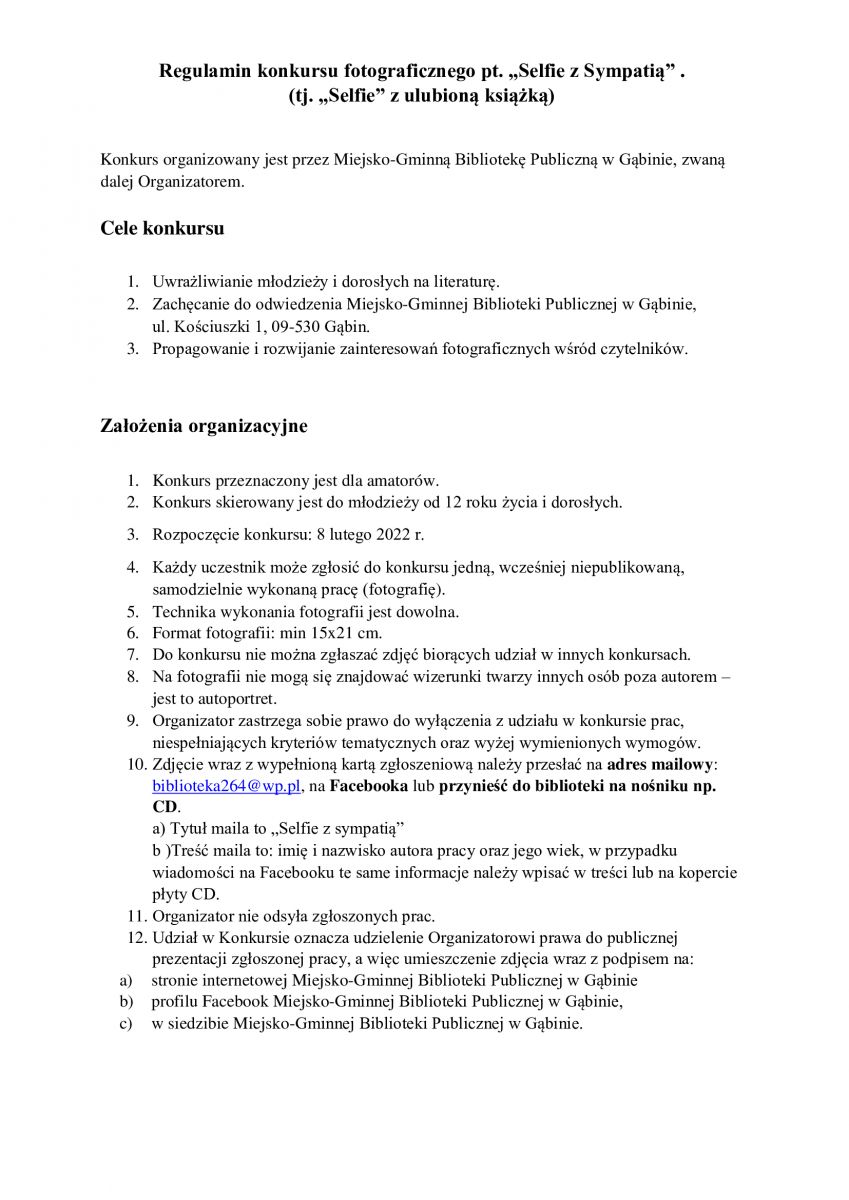Miejsko-Gminna Biblioteka Publiczna w Gąbinie zaprasza młodzież i dorosłych (bez ograniczeń wiekowych) do udziału w konkursie pt. „Selfie z sympatią”.