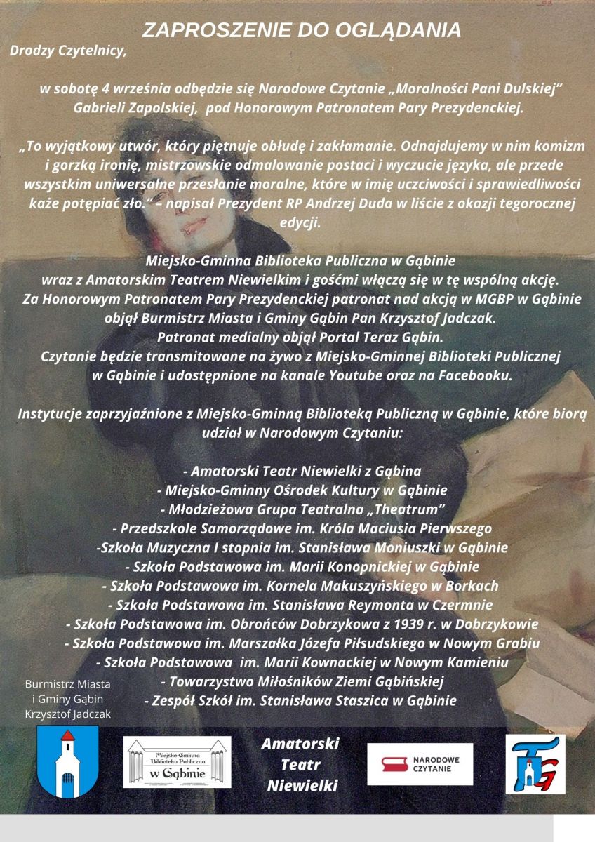 Miejsko-Gminna Biblioteka Publiczna w Gąbinie, organizator eliminacji rejonowych zaprasza: dzieci, młodzież, nauczycieli, opiekunów i rodziców do udziału w XLIII edycji konkursu recytatorskiego „Pięknie być człowiekiem”.
