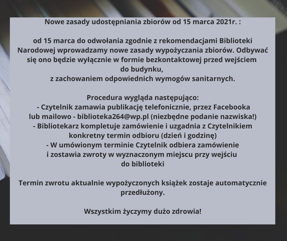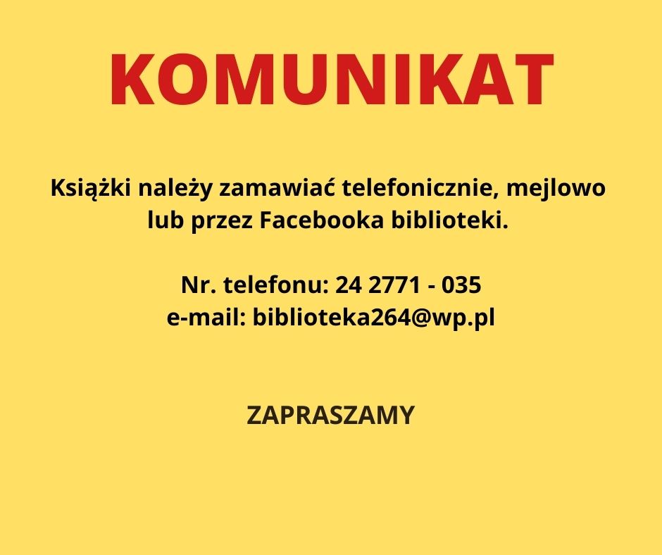 Kontakt biblioteka264@wp.pl  tel. 24 2771 035 , facebook biblioteki.
