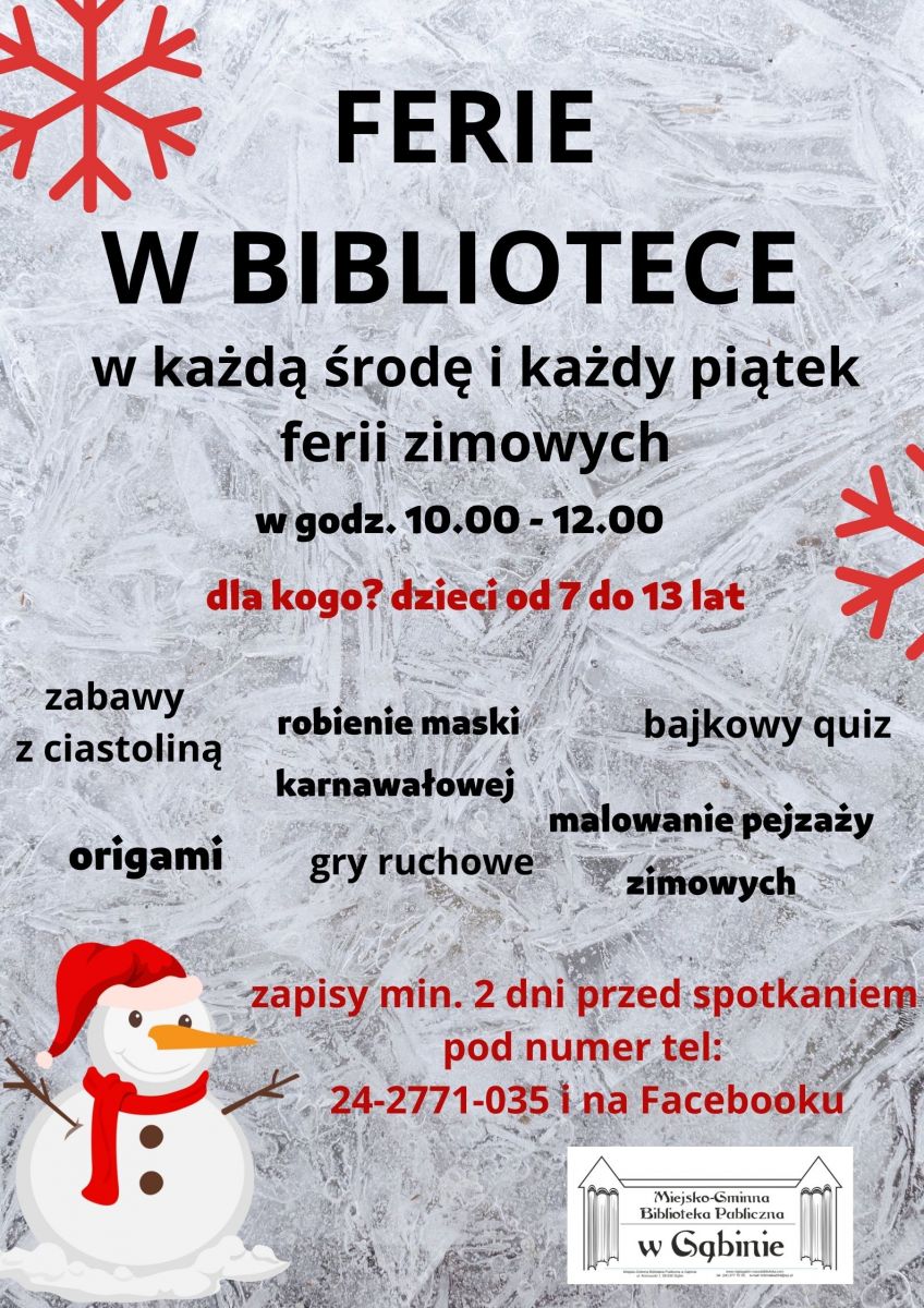 Serdecznie zapraszamy wszystkie chętne dzieci w wieku 7-13 lat na ferie w bibliotece. Na spotkania w każdą środę i piątek ferii, w godz. 10.00 – 12.00  przygotowaliśmy wiele ciekawych atrakcji, zabaw, niespodzianek i gier. Zapisów należy dokonywać na 2 dni przed wyznaczonym terminem zajęc: na środy przyjmujemy zgłoszenia w pon. i wt, a na piątek w śr. i czw.