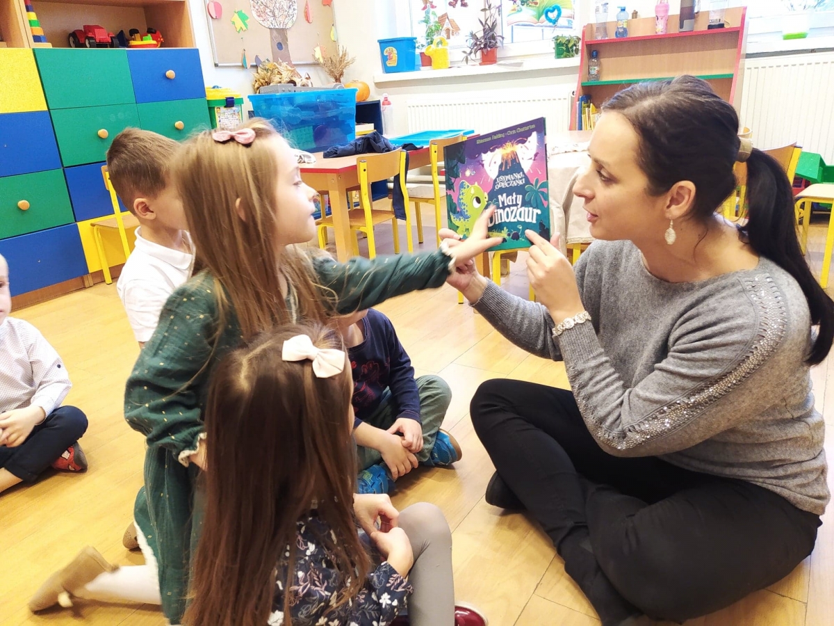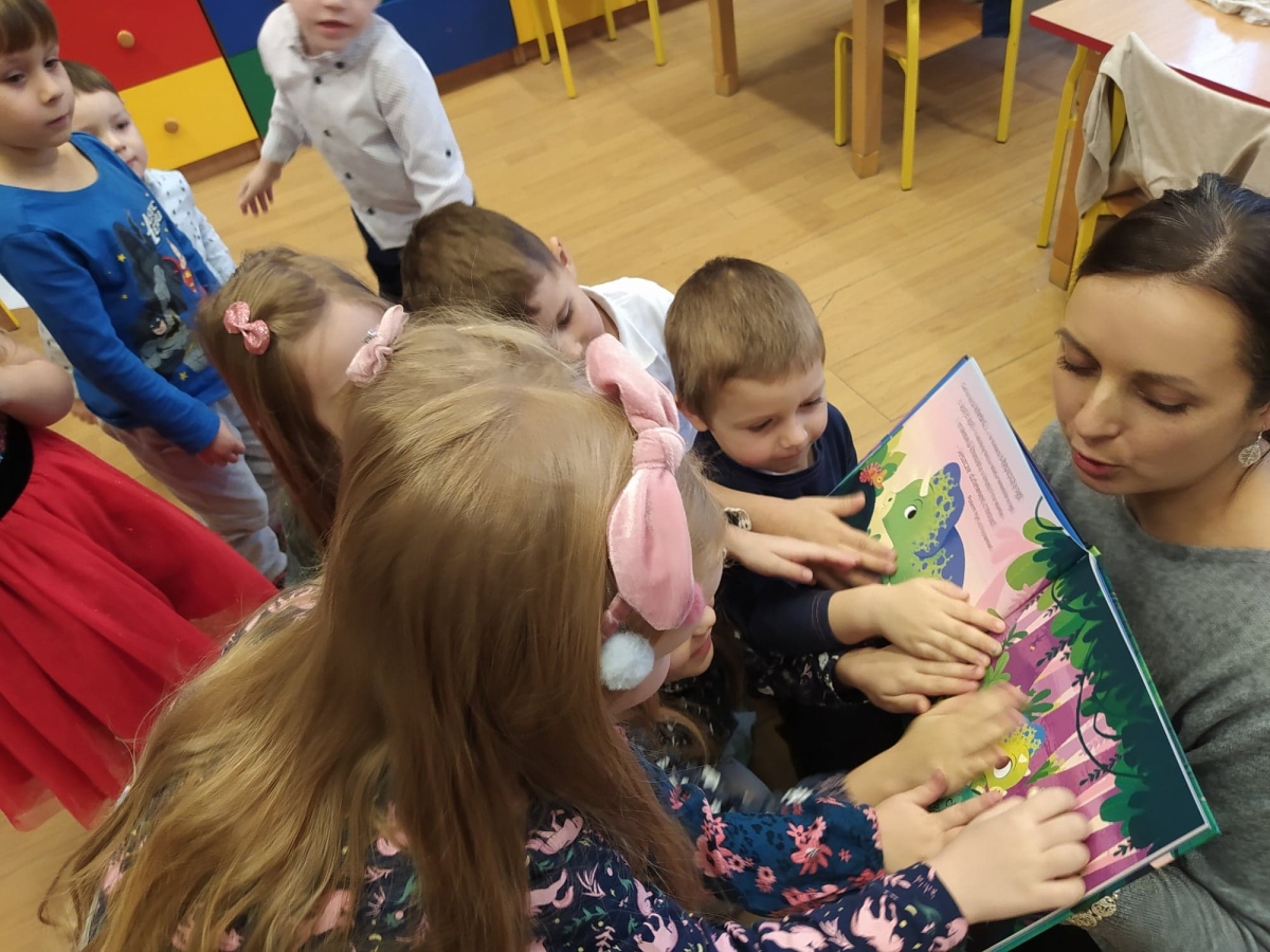 ,,Dawno dawno temu w zielonej krainie, która z dinozaurów najróżniejszych słynie, echo niosło z wiatrem wesołe wołanie” – brzmiał fragment z książki pt. ,,Mały Dinozaur” z serii Usypianki Odliczanki R. Fielding i C. Chatterona, którą czytała Pani Asia kolejnej grupie. Po jej wysłuchaniu ,,Biedronki” chętnie ,,głaskały” dinozaura, który znajdował się na ilustracjach.