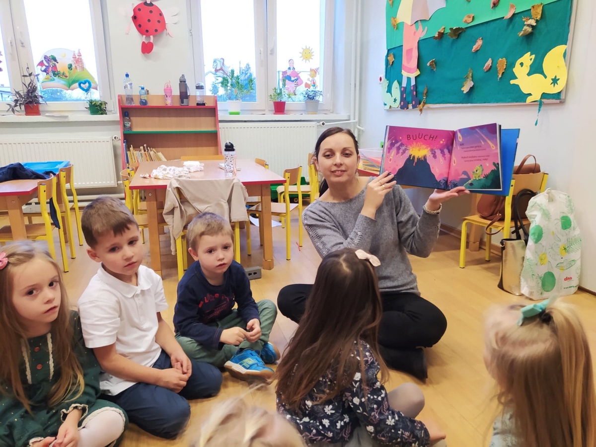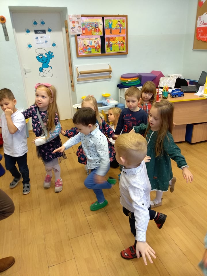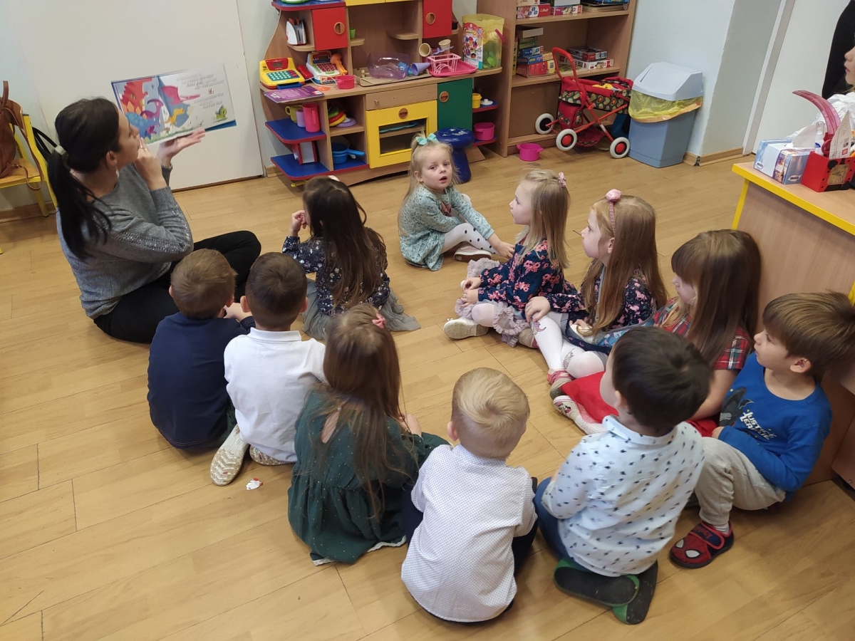 ,,Dinozaury są super!” – wykrzyknęły dzieci, gdy pani Karolina czytała książkę pt. ,,Miki spotyka dinozaura” z serii Moje Pierwsze Opowiastki. Następnie ,,Jagódki”, w trakcie czytania książki pt. ,,Żabki grają w łapki. Maluszki ćwiczą rączki, nóżki i paluszki” E. i W. Szwajkowskich udawały bociana, kota i kaczkę.