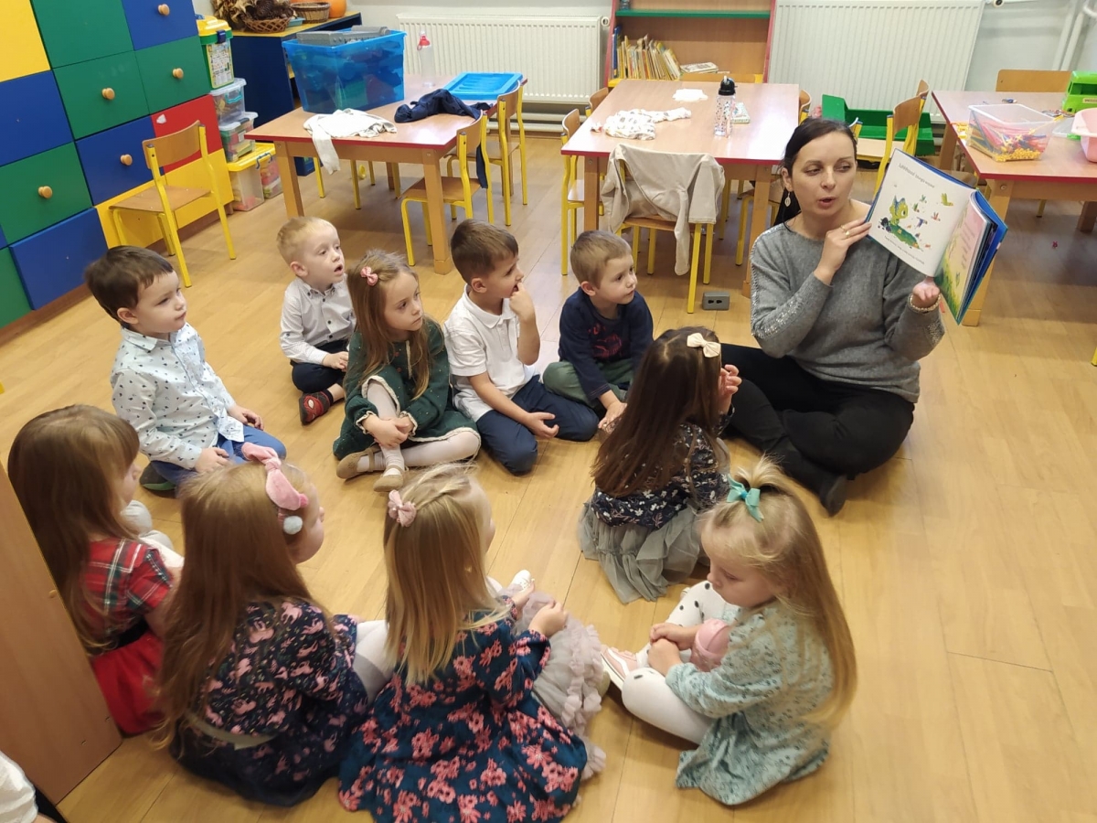 Dodatkowo Pani Karolina przeczytała książkę pt. ,,Żabki grają w łapki. Maluszki ćwiczą rączki, nóżki i paluszki” – E. i W. Szwajkowskich.