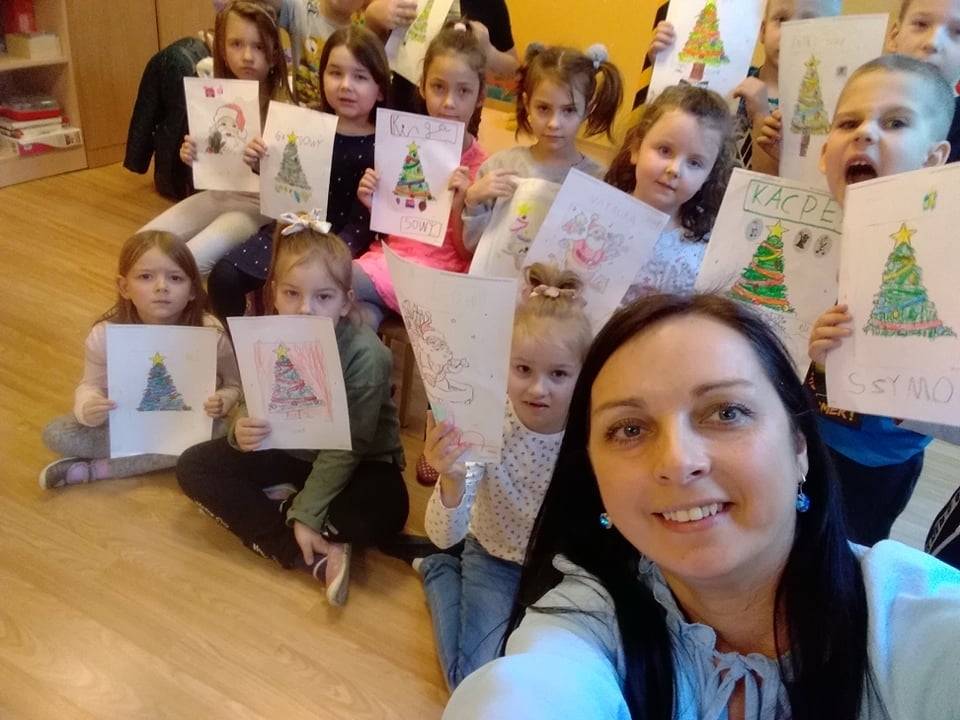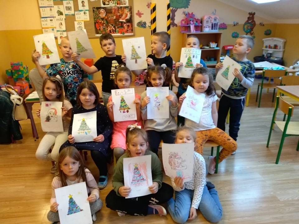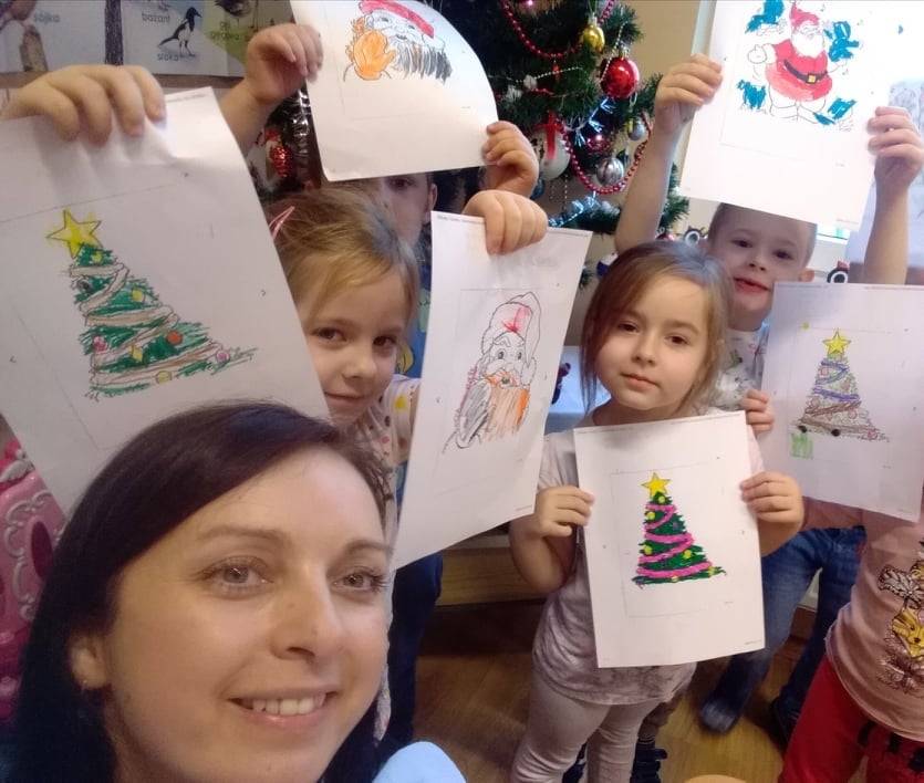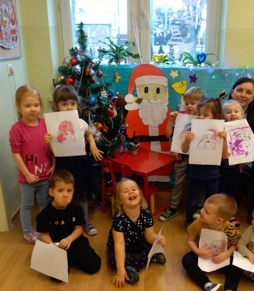 W związku ze zbliżającymi się Świętami Bożego Narodzenia pozostałe grupy: „Sowy”, „Jagódki” i „Smerfy” pokolorowały świąteczne obrazki przedstawiające Świętego Mikołaja i choinkę.