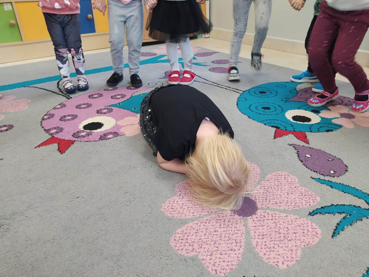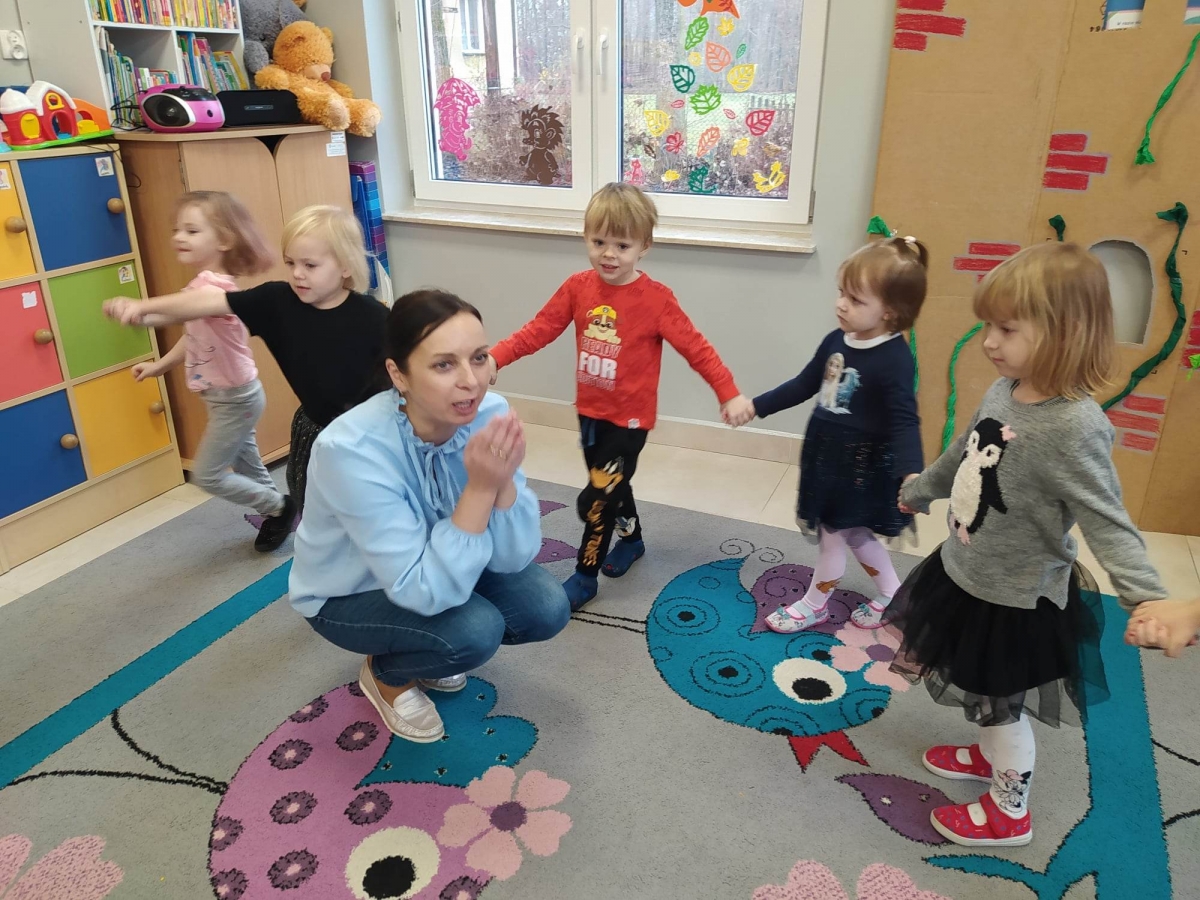 „Pszczółki” odkryły radość w zabawie „Stary niedźwiedź mocno śpi…”. Bibliotekarka Asia wcieliła się w postać groźnego misia, który łapał dzieci podczas wspólnej zabawy. Miło było widzieć ile uśmiechu i frajdy wywołała ta zabawa.