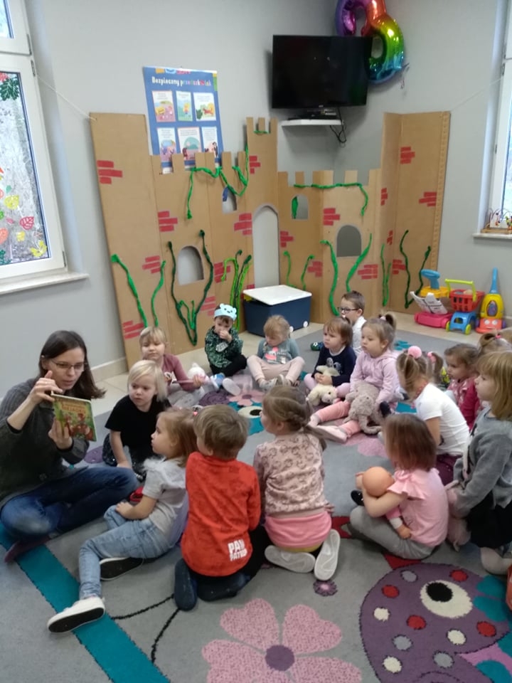 Nawiązując do święta Pluszowego Misia, bibliotekarka Karolina przeczytała „Pszczółkom” bajeczkę pt. „O niedźwiadku niejadku” oraz rozkładaną książeczkę pt. ”Przytul mnie na dobranoc”.