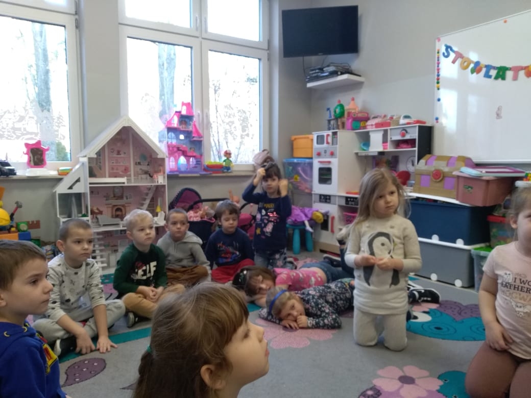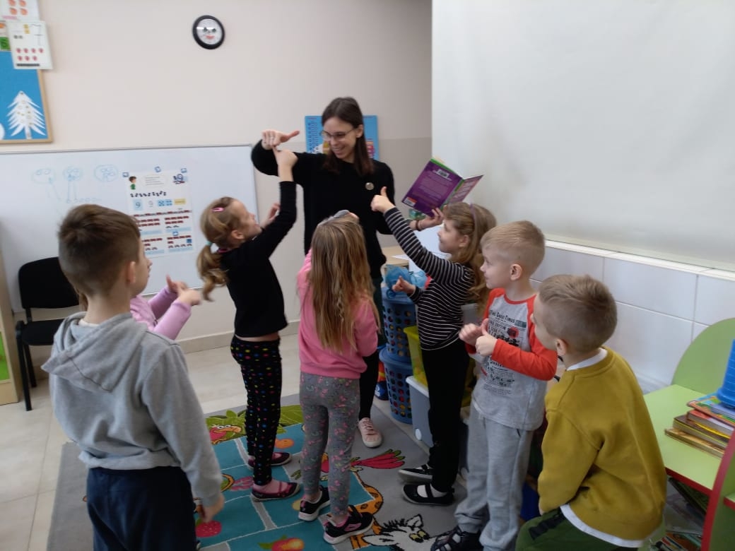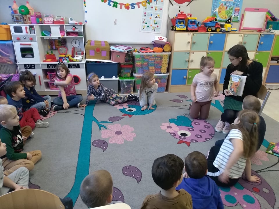 ,,Naśladować chcesz pingwina? Jego chód to dreptanina!”. – przeczytała fragment wiersza z książki pt. ,,Żabki grają w łapki” autorstwa Elżbiety i Witolda Szwajkowskich w grupie ,,Motyli”. Po usłyszeniu tych słów dzieci naśladowały ptaka a następnie inne zwierzęta.