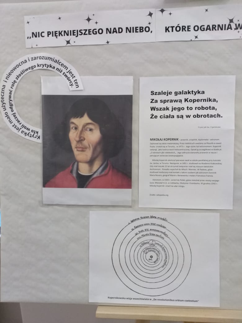 MIKOŁAJ KOPERNIK – prawnik, urzędnik, dyplomata i astronom. Zajmował się także matematyką. Przez niektórych uważany za filozofa a nawet fizyka. Urodził się w Toruniu, w 1473 r. Jego ojciec był astronomem. Kopernik zasłynął, jako twórca teorii heliocentrycznej. Opisał ją szczegółowo w dziele pt. ,,O obrotach sfer niebieskich„. Jego odkrycia stanowiły przewrót w nauce i panującym wówczas światopoglądzie.