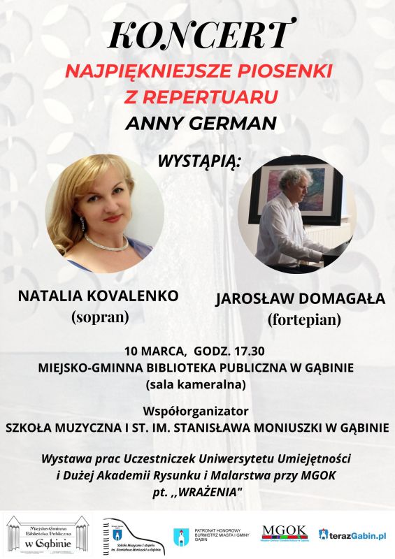 Serdecznie zapraszamy na koncert ,,Napiękniejsze piosenki z repertuaru Anny German”, w którym wystąpią Natalia Kovalenko i Jarosław Domagała a także wystawę prac Uczestniczek Dużej Akademii Rysunku i Malarstwa oraz Uniwersytetu Umiejętności.