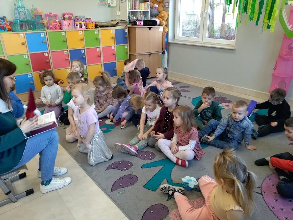 Nawiązując do wypchanego krasnala Pani bibliotekarka przeczytała fragment książki pt. ,,Opowieść o niesfornej czapce” W. Widłaka. Zbiór dziesięciu opowieści dla dzieci został wydany z okazji projektu ,,Mała książka wielki człowiek” Instytutu Książki z siedzibą w Krakowie. Specjalna wyprawka, w tym naklejki, dyplom i Karta Małego Czytelnika czekają na najmłodszych w bibliotece, którzy zapiszą się do akcji.