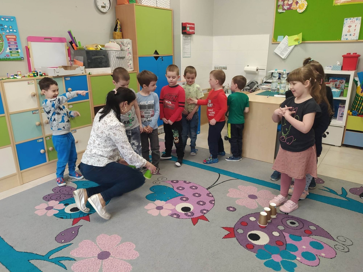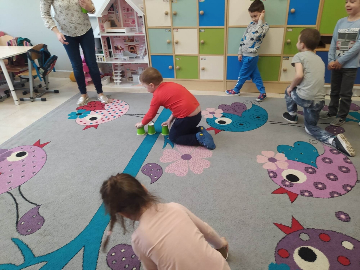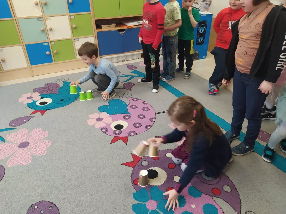 Z grupą „Biedronek” urządziłam dziś zawody sportowe. Podzieliłam grupę na dwie drużyny, dziewcząt i chłopców. Każdy uczestnik miał do pokonania pewien dystans polegający na przekładaniu kolorowych kubków jeden za drugim. Wszyscy uczestnicy chętnie przystąpili do zadania, ciesząc się , kibicując innym. Poznali czym jest gra zespołowa, zabawa była świetna.