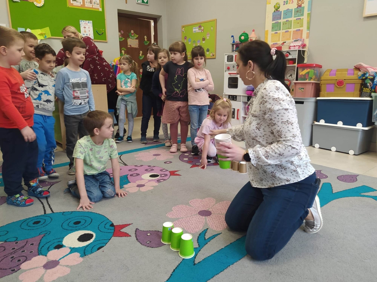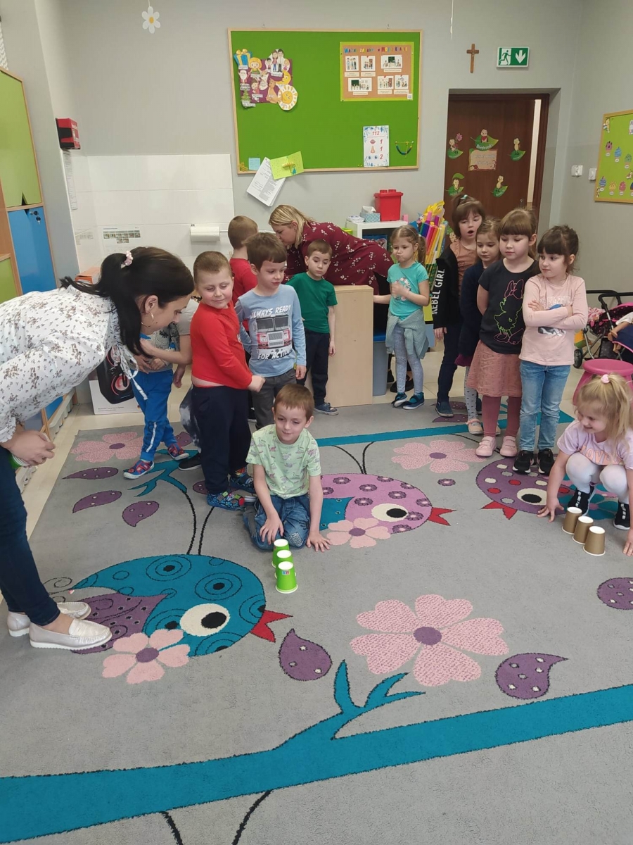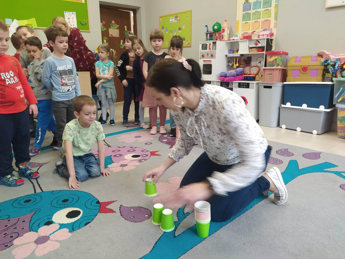 Z grupą „Biedronek” urządziłam dziś zawody sportowe. Podzieliłam grupę na dwie drużyny, dziewcząt i chłopców. Każdy uczestnik miał do pokonania pewien dystans polegający na przekładaniu kolorowych kubków jeden za drugim. Wszyscy uczestnicy chętnie przystąpili do zadania, ciesząc się , kibicując innym. Poznali czym jest gra zespołowa, zabawa była świetna.