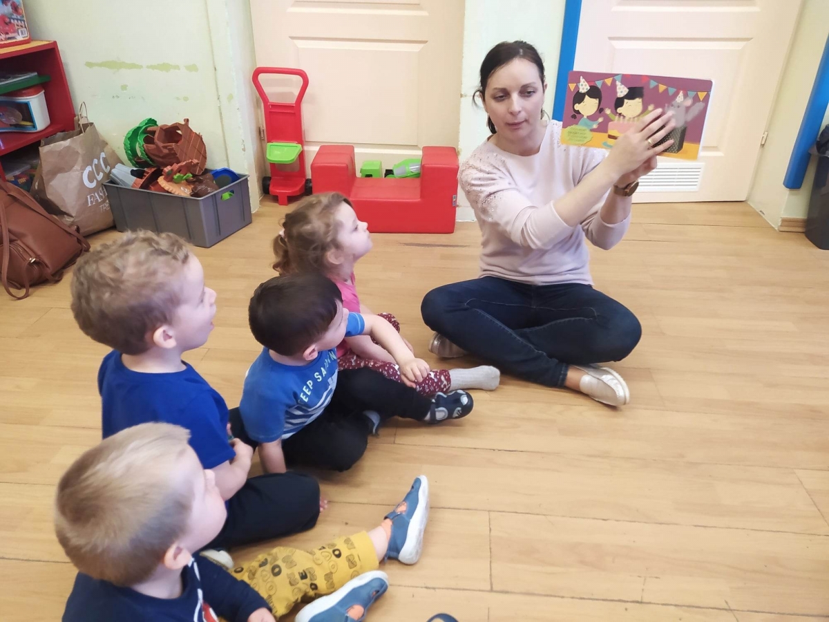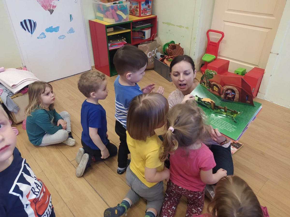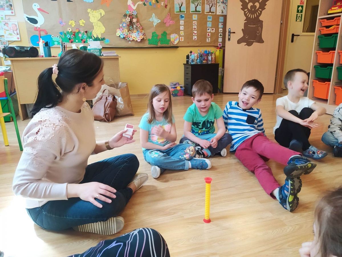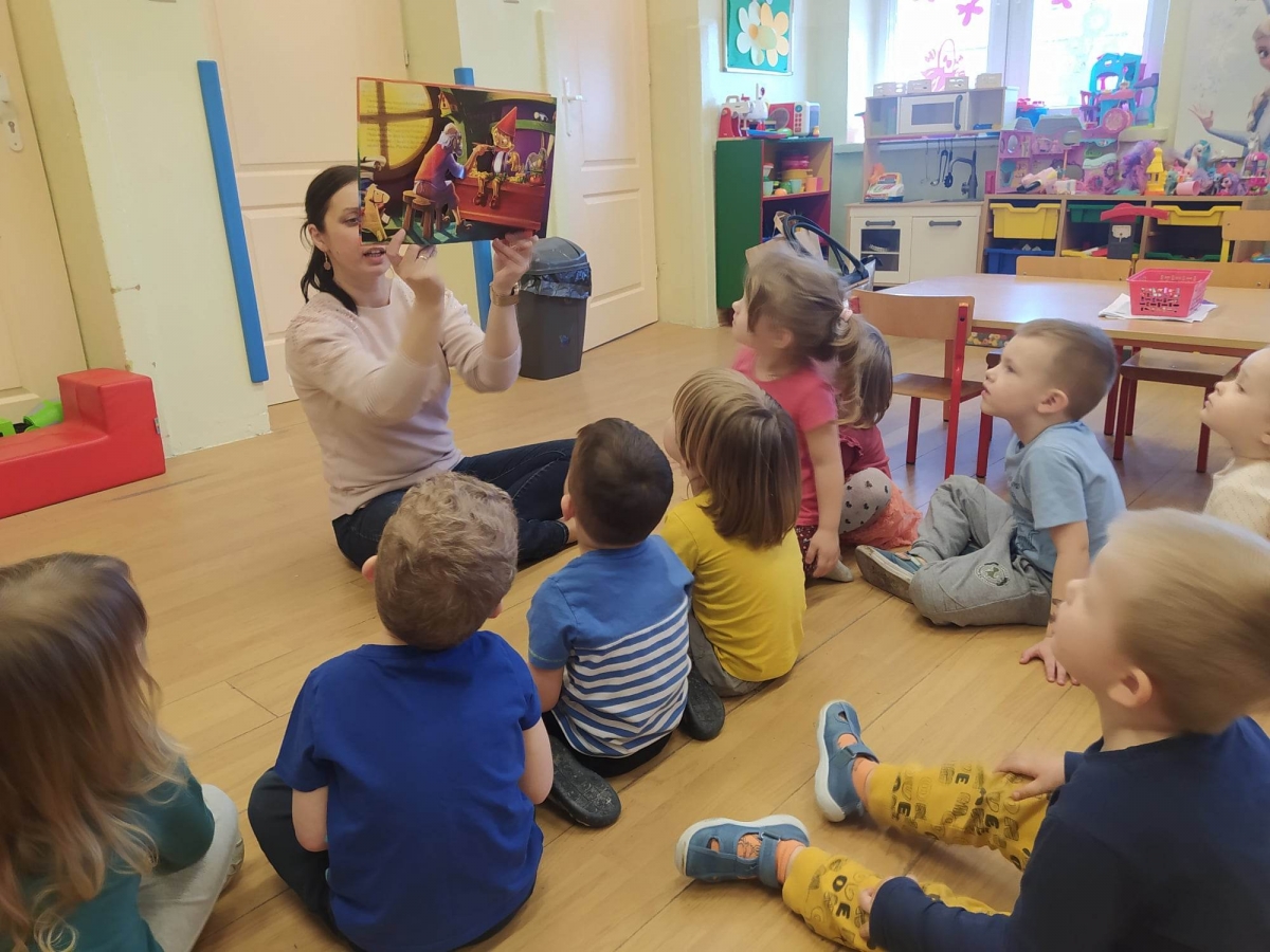 Dodatkowo przywiozłam ze sobą bajeczkę pt. „Odgłosy pupili”. Zawierała ona dźwięki, które wzbogaciły jej zawartość. „Smerfy” wspólnie naśladowały odgłosy odzywających się zwierzątek.
