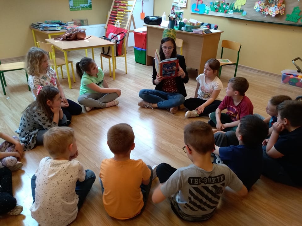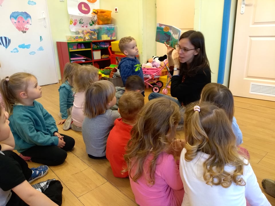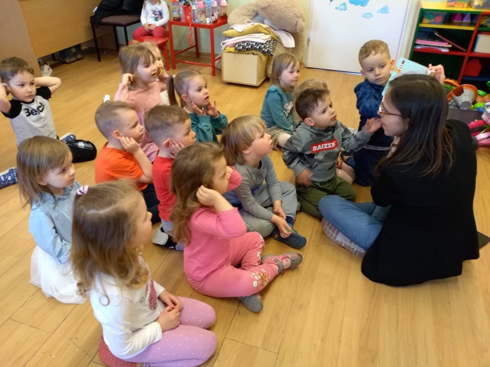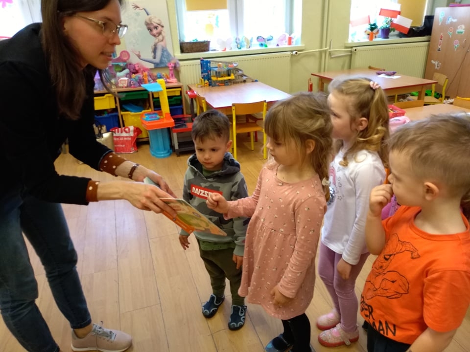 Odnosząc się do obchodzonego w dniach 8 -15 maja Tygodnia Bibliotek dzieci poznały specjalnie przygotowaną zabawę w podawanie książki z wykonywaniem poleceń takich jak: ,,Ukucnij i podaj książkę dalej!”, ,,Wykonaj obrót!” i ,,Zmiana kierunku”.
