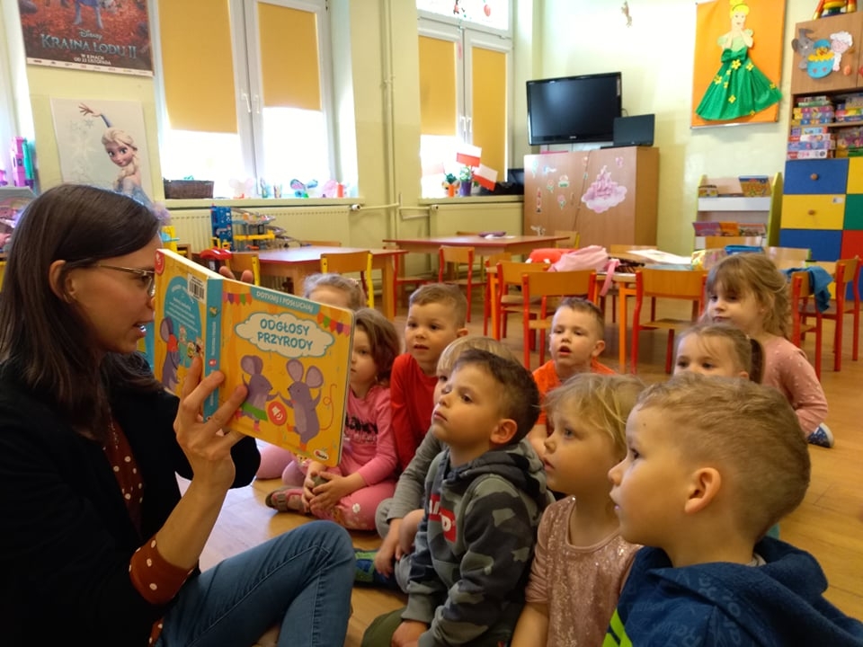 Następnie Smerfy, najmłodsza grupa ustawiała się w kolejce do dźwiękowej książki, żeby dotykając w niej wyjątkowego przycisku poznać odgłosy przyrody i zwierząt.  ,,Woda”, ,,piasek”, ,,krokodyl” , ,,hipcio” – wymieniały dzieci podczas odsłuchiwania bajki.