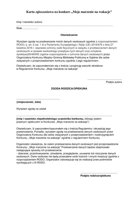 Obowiązkowe wypełnienie karty zgłoszeniowej i zapoznanie się z regulaminem.