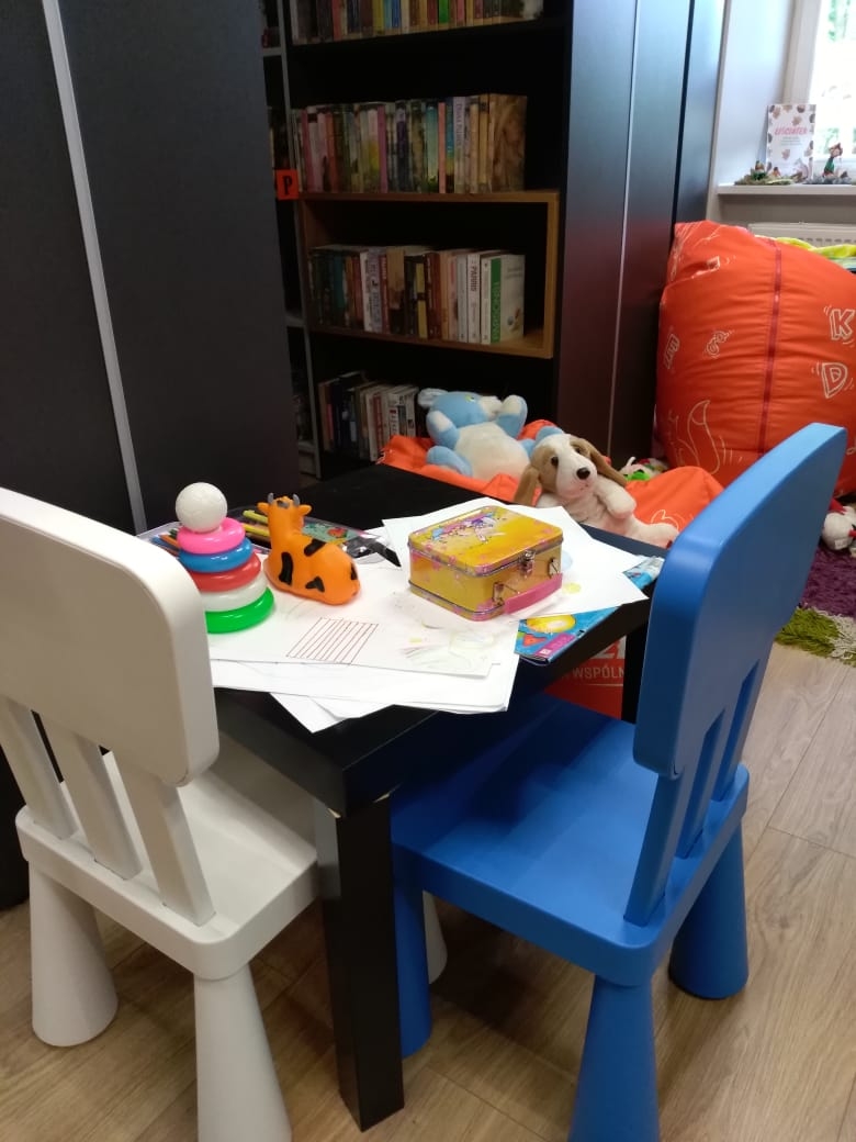 Czeka również stolik z kredkami. Chętnie zobaczymy prace, które narysujecie dla nas.