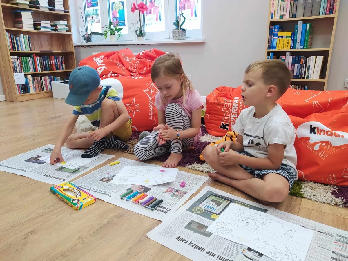 Lato z książkami? Dlaczego nie? Z naszej propozycji, czyli spotkań w okresie wakacyjnym skorzystały dzieci od 6 do 10 roku życia. Uczestnicy ,,Bibliolata” wykonywali obrazki z plasteliny, przedstawiające plaże, uzupełniali ilustracje skrawkami papieru, bawili się w Klasy i rysowali kredą na świeżym powietrzu.