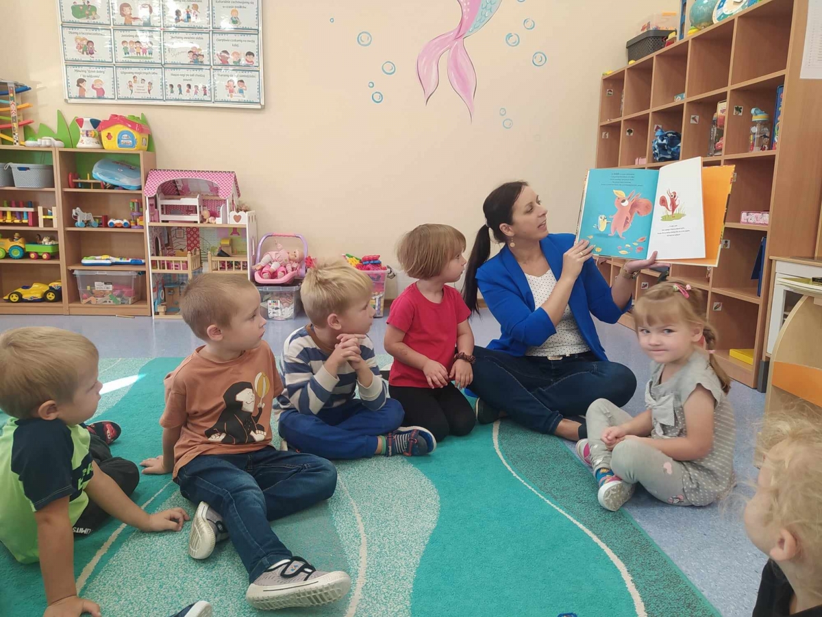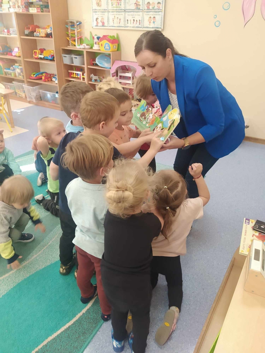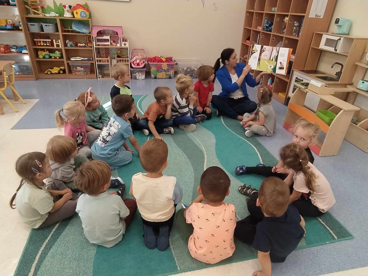 Przedszkolaki wysłuchały wybranych przez bibliotekarki opowieści. „Żabkom”- starszej grupie- zaprezentowana została legenda M. Orłonia pt. „Książę Popiel i myszy” z cyklu Baśnie polskie. „Rybki” wysłuchały historii jesiennej wiewiórki w bajce A. Hemming pt.”Złodziej liści” oraz dźwiękowej książeczki „Zwierzaczki z głośnej paczki”.