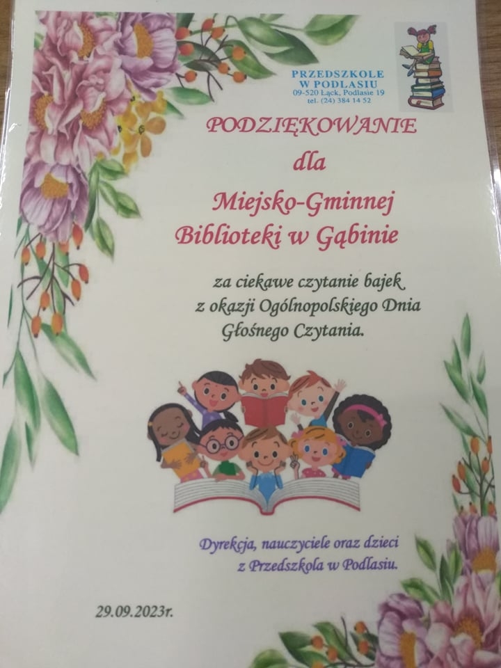 29 września obchodzimy Ogólnopolski Dzień Głośnego Czytania, wpisuje się on w kalendarz świąt nietypowych. Bibliotekarki z MGBP w Gąbinie spotkały się z dziećmi z grup: „Żabki” i „Rybki” z Przedszkola w Podlasiu.