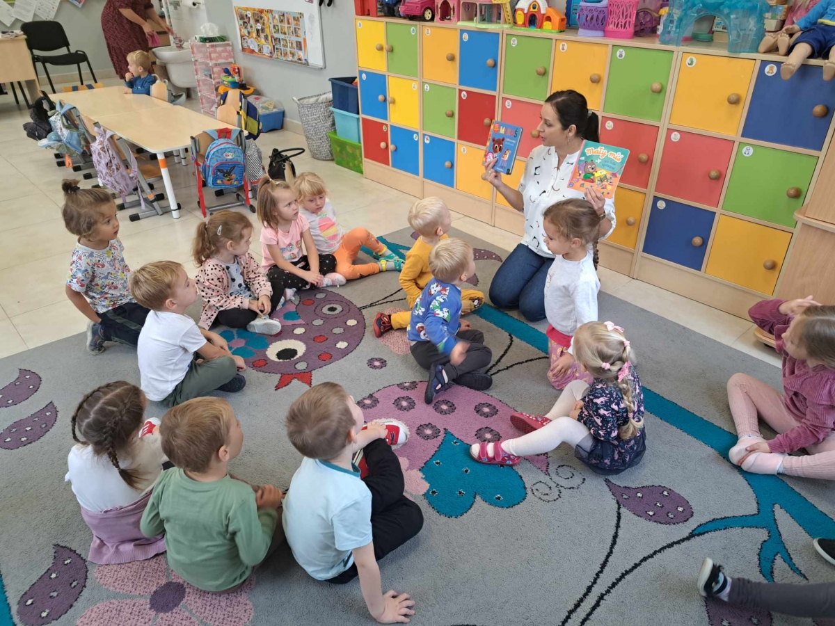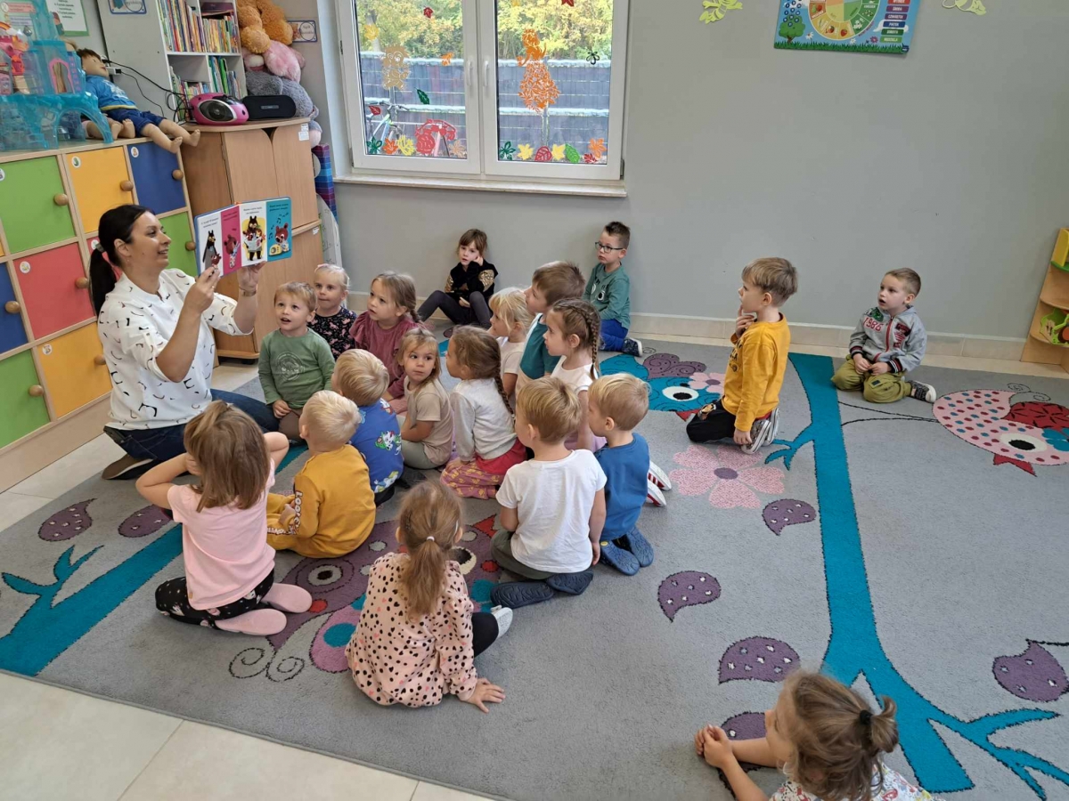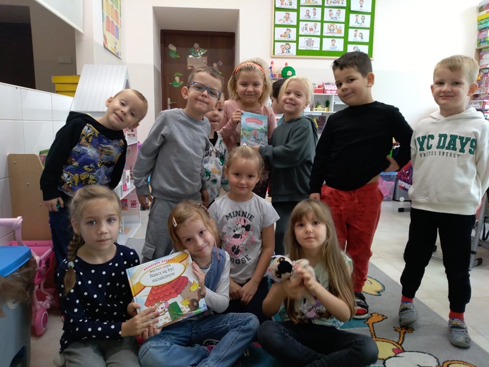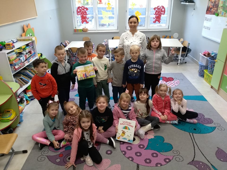 W tymże dniu spotkałam się z dziećmi z Oddziału i Punktu Przedszkolnego w Nowym Grabiu. Trzy grupy tj. „Biedronki”, „Pszczółki” i „Motyle” czekały w swych salach by poznać nowe historie w książeczkach, które im przywiozłam.