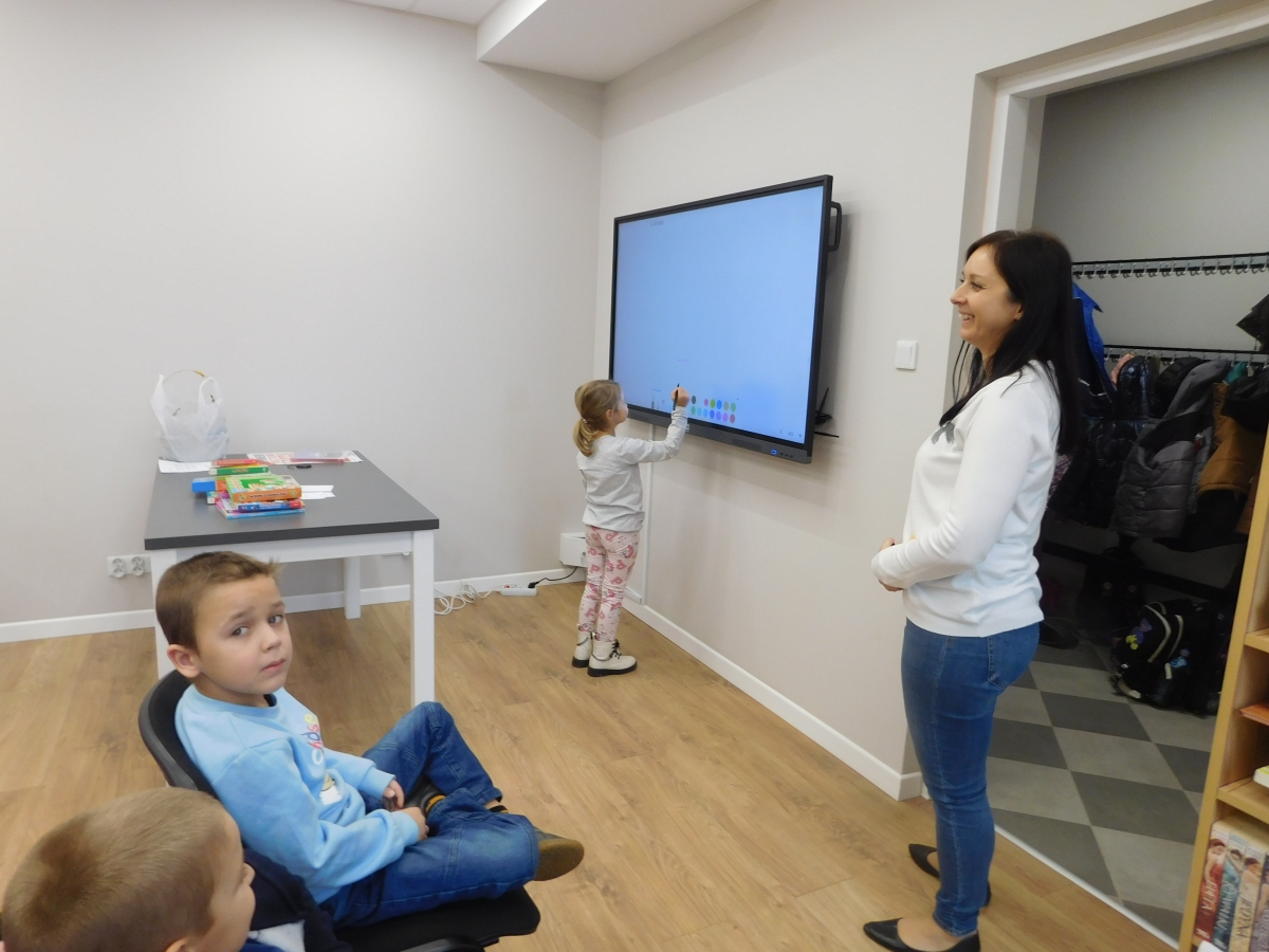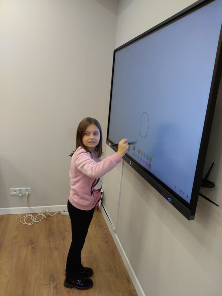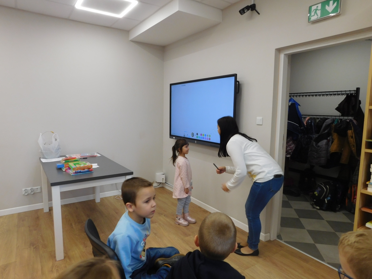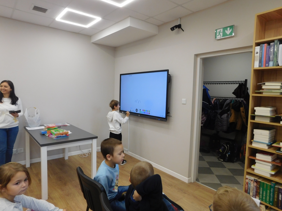 Nie mogło zabraknąć krótkiej przerwy na coś słodkiego i na wspólną zabawę. Świetnie sprawdziła się tablica multimedialna, która posłużyła nam do gry w rysowanie i odgadywanie haseł czyli zabawę w „Kalambury”. Wszyscy mogli wykazać się swoimi talentami podczas rysowania, śmiechu było co nie miara.