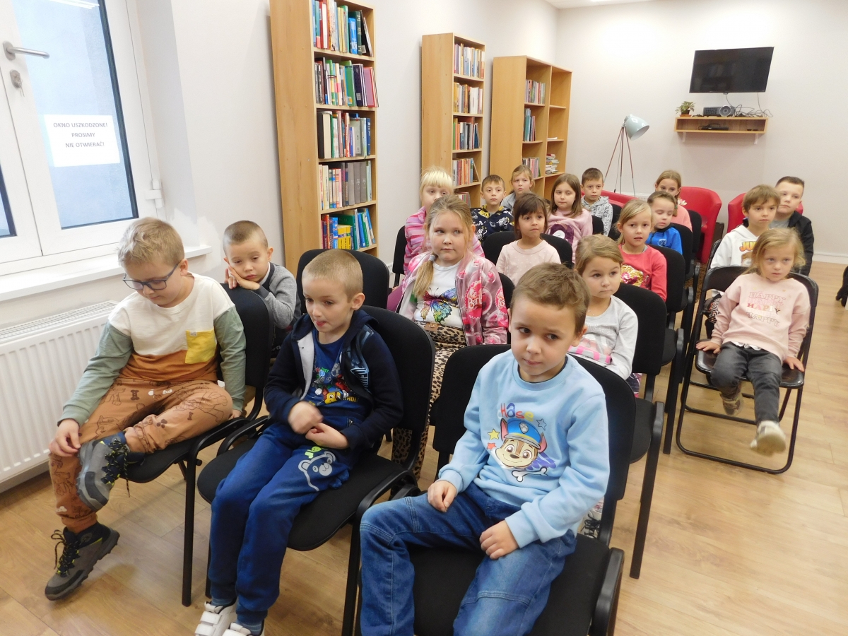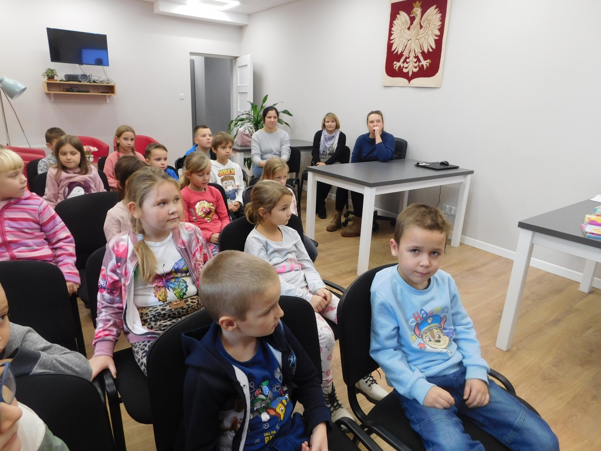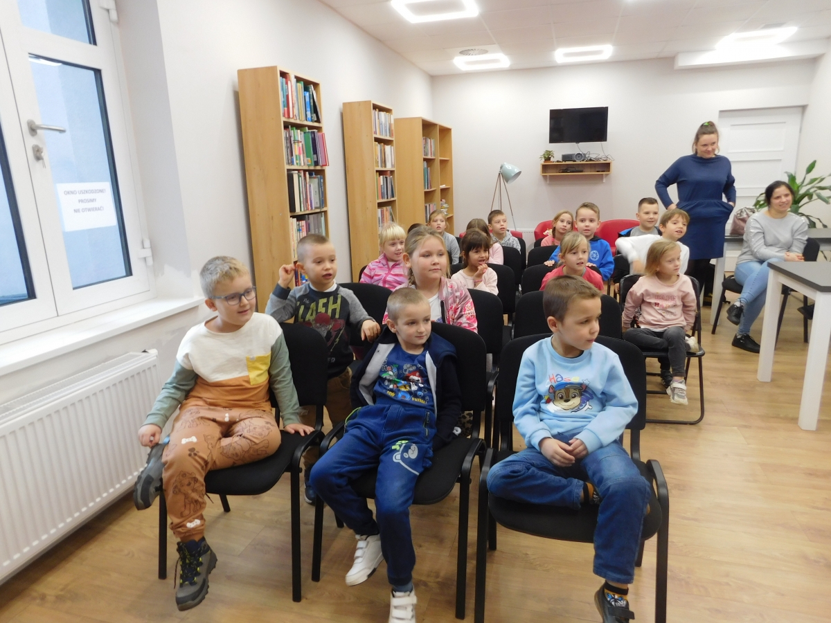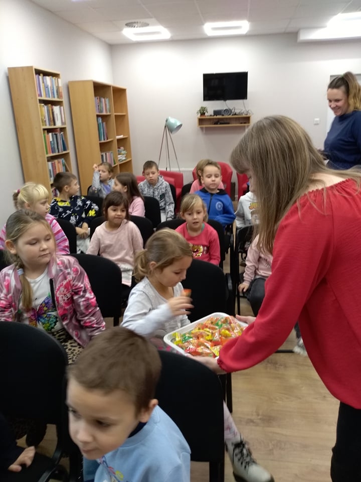 Dzieci dowiedziały się co należy zrobić, żeby stać się czytelnikiem, poznały kartę biblioteczną. Najmłodszym opowiedziałam o projekcie „Mała książka, wielki człowiek”, jaki trwa w naszej Bibliotece, którego głównym organizatorem jest Instytut Książki z siedzibą w Krakowie. Poinformowałam o prezencie – książce, jaką dzieci otrzymują wraz z Kartą małego Czytelnika, na którą zbierają naklejki za każde odwiedziny w Bibliotece.