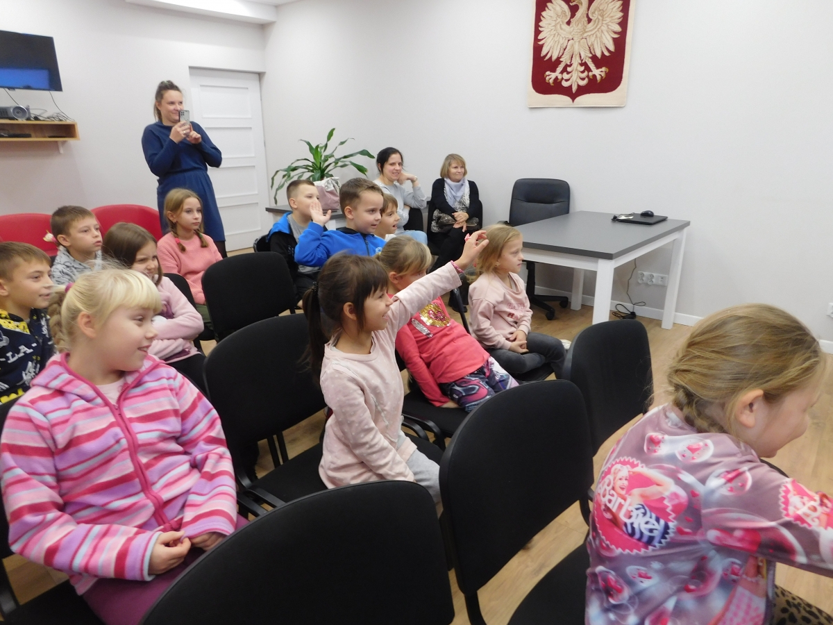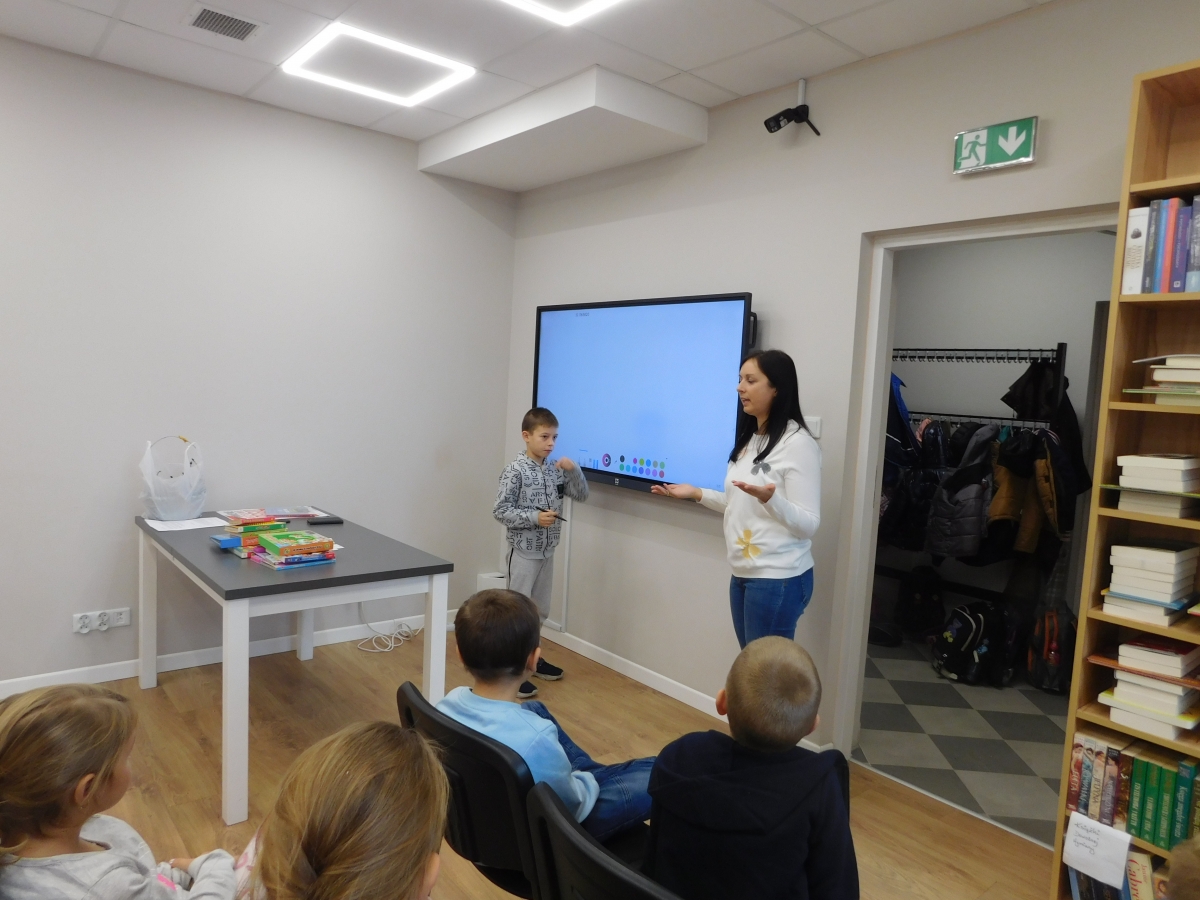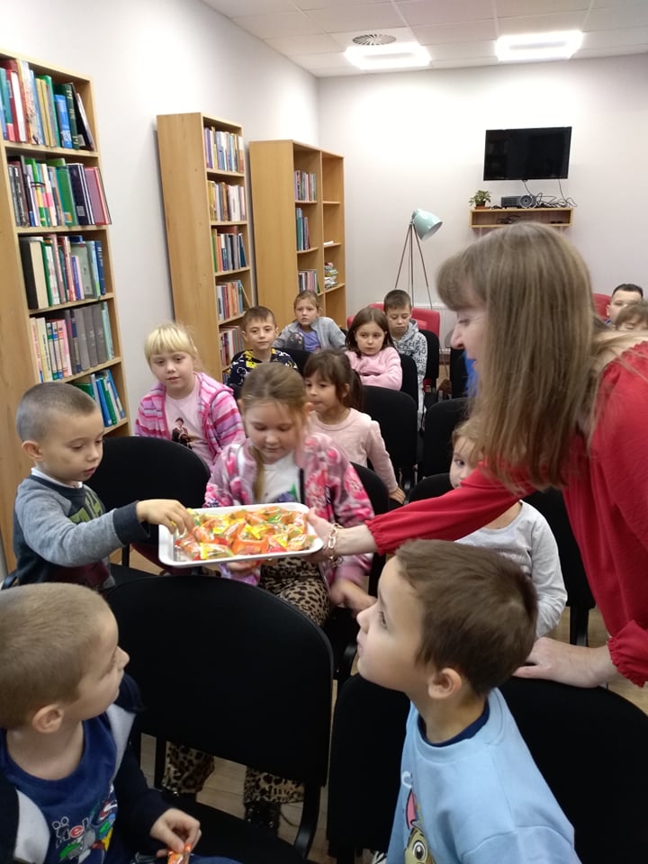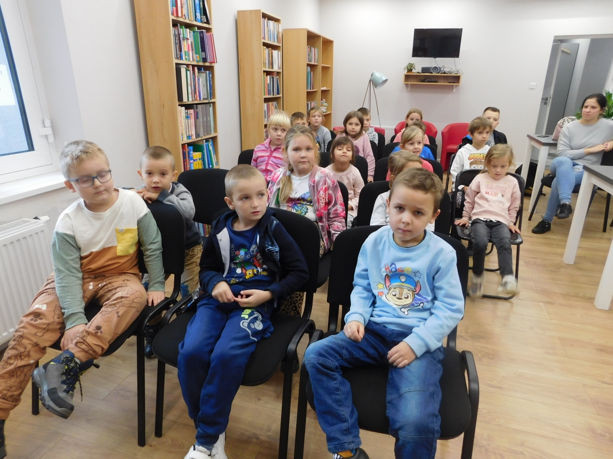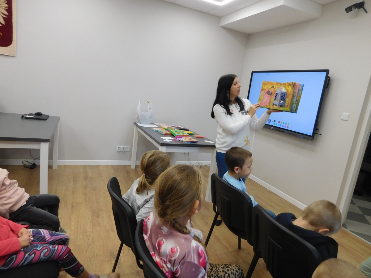 Dzieci dowiedziały się co należy zrobić, żeby stać się czytelnikiem, poznały kartę biblioteczną. Najmłodszym opowiedziałam o projekcie „Mała książka, wielki człowiek”, jaki trwa w naszej Bibliotece, którego głównym organizatorem jest Instytut Książki z siedzibą w Krakowie. Poinformowałam o prezencie – książce, jaką dzieci otrzymują wraz z Kartą małego Czytelnika, na którą zbierają naklejki za każde odwiedziny w Bibliotece.