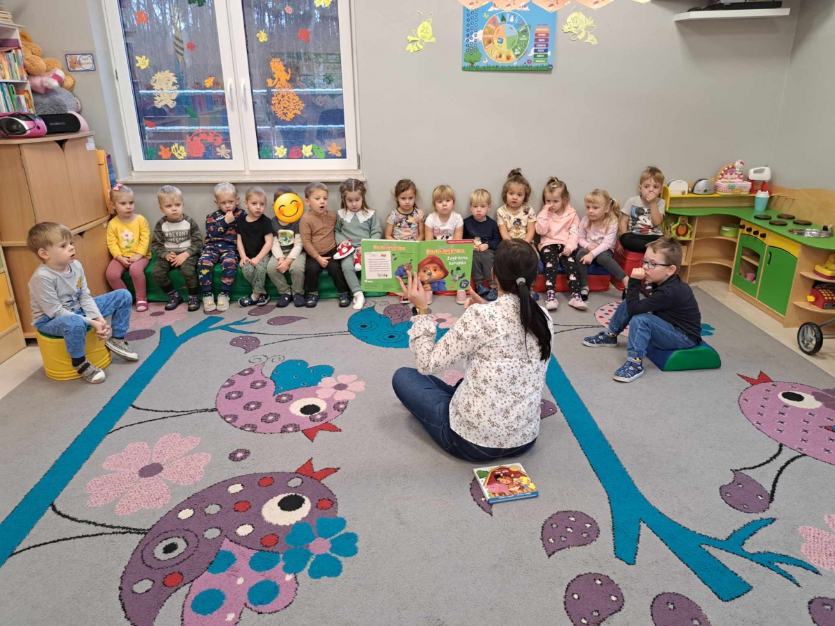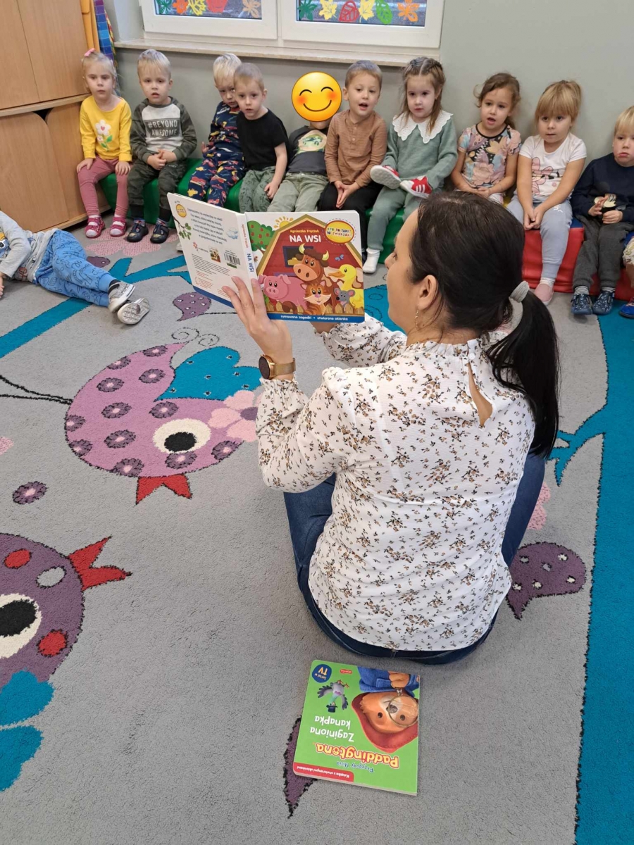 Maluchy – „Pszczółki” z wyjątkową uwagą i skupieniem wysłuchali Przygód Misia Paddingtona pt. „Zaginiona kanapka” oraz bajeczki pt. „Na wsi”, prezentującej zwierzaki znajdujące się na gospodarstwie. Za ukrytymi okienkami schowały się świnka, kotek, mysz, kaczorek. Dzieci błyskawicznie je dostrzegły.