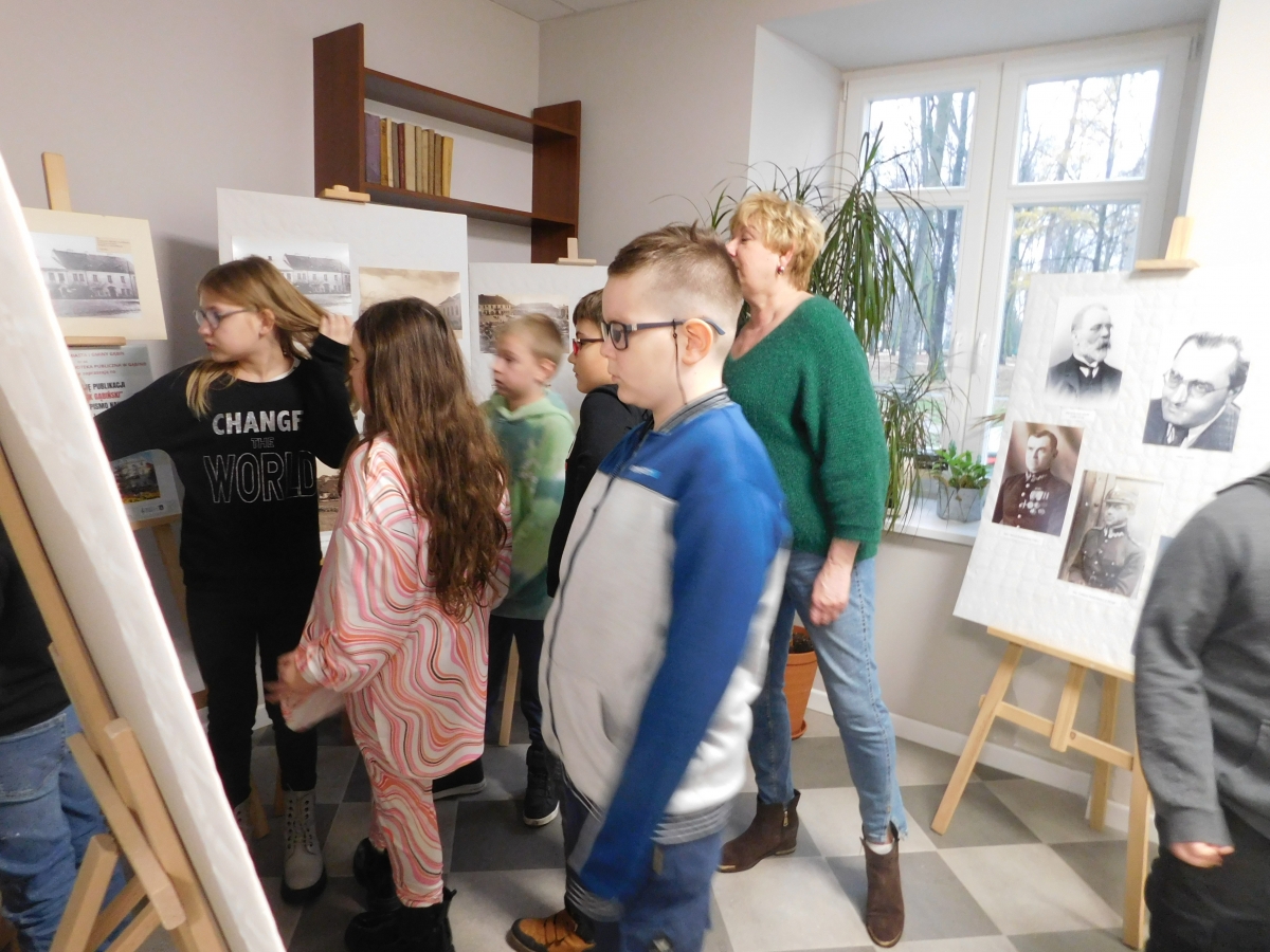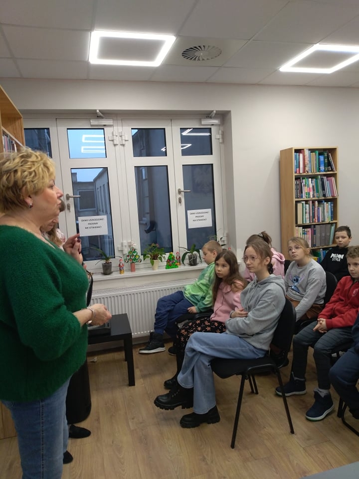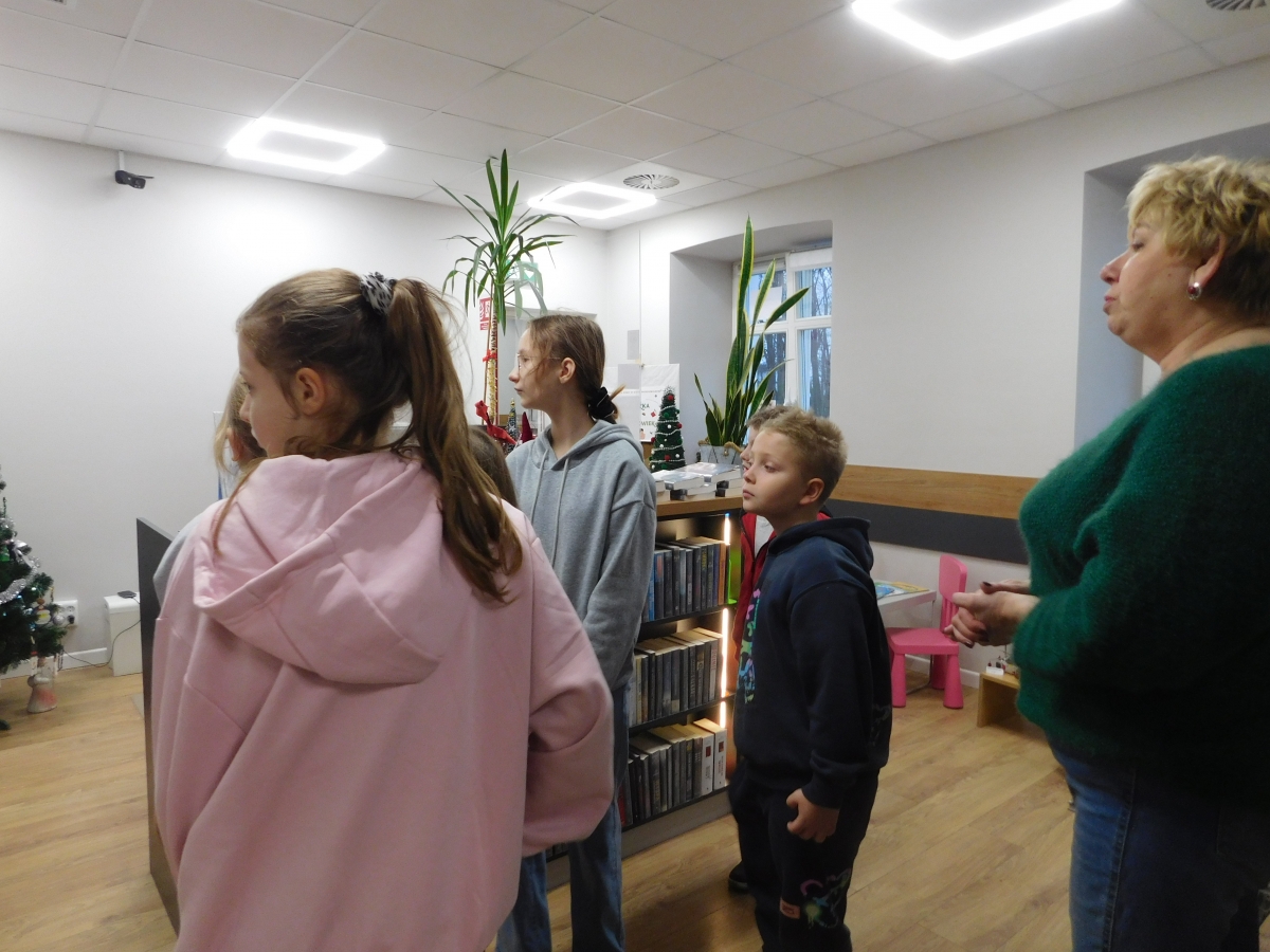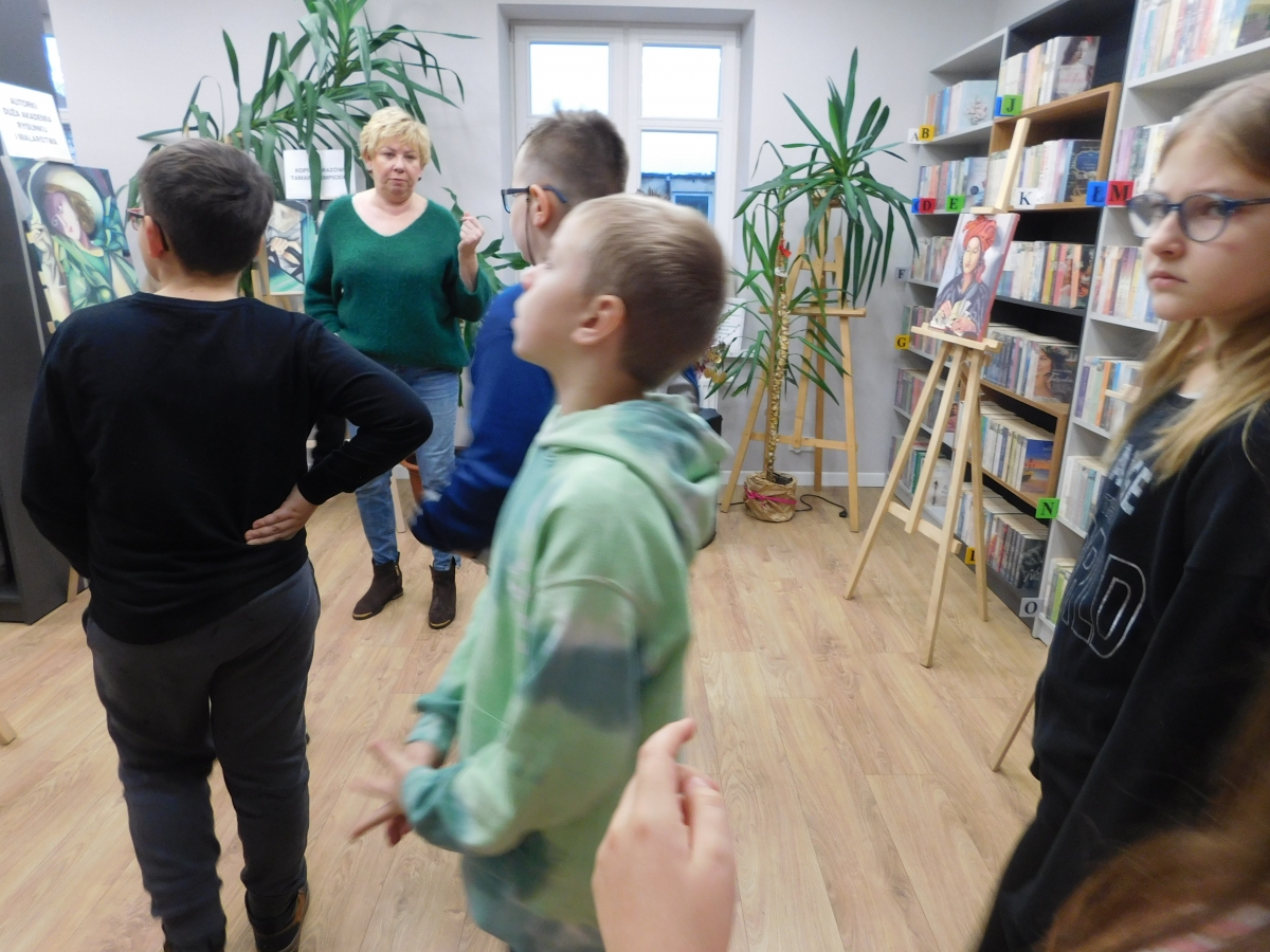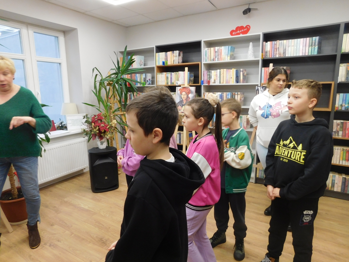 Spotkanie rozpoczęła Pani Ewa Lewandowska- Starszy Kustosz bibliotekarz, witając gości po raz pierwszy na lekcji bibliotecznej. Po krótkim wstępie, dzieląc klasę na trzy grupy, Pani Ewa zabrała pierwszą z nich aby pokazać całą Bibliotekę: wypożyczalnię, czytelnię, kącik dziecięcy, salę wystawową. Dzieci miały możliwość obejrzenia całego księgozbioru, poznały układ książek w poszczególnych pomieszczeniach, obejrzały regały z książkami dla dzieci i młodzieży. Uczniowie zwiedzili wystawy po drodze im towarzyszące. Pani Ewa wspomniała także o konkursach jakie są przygotowywane w naszej Bibliotece, jednocześnie zachęcając do wzięcia w nich udziału.