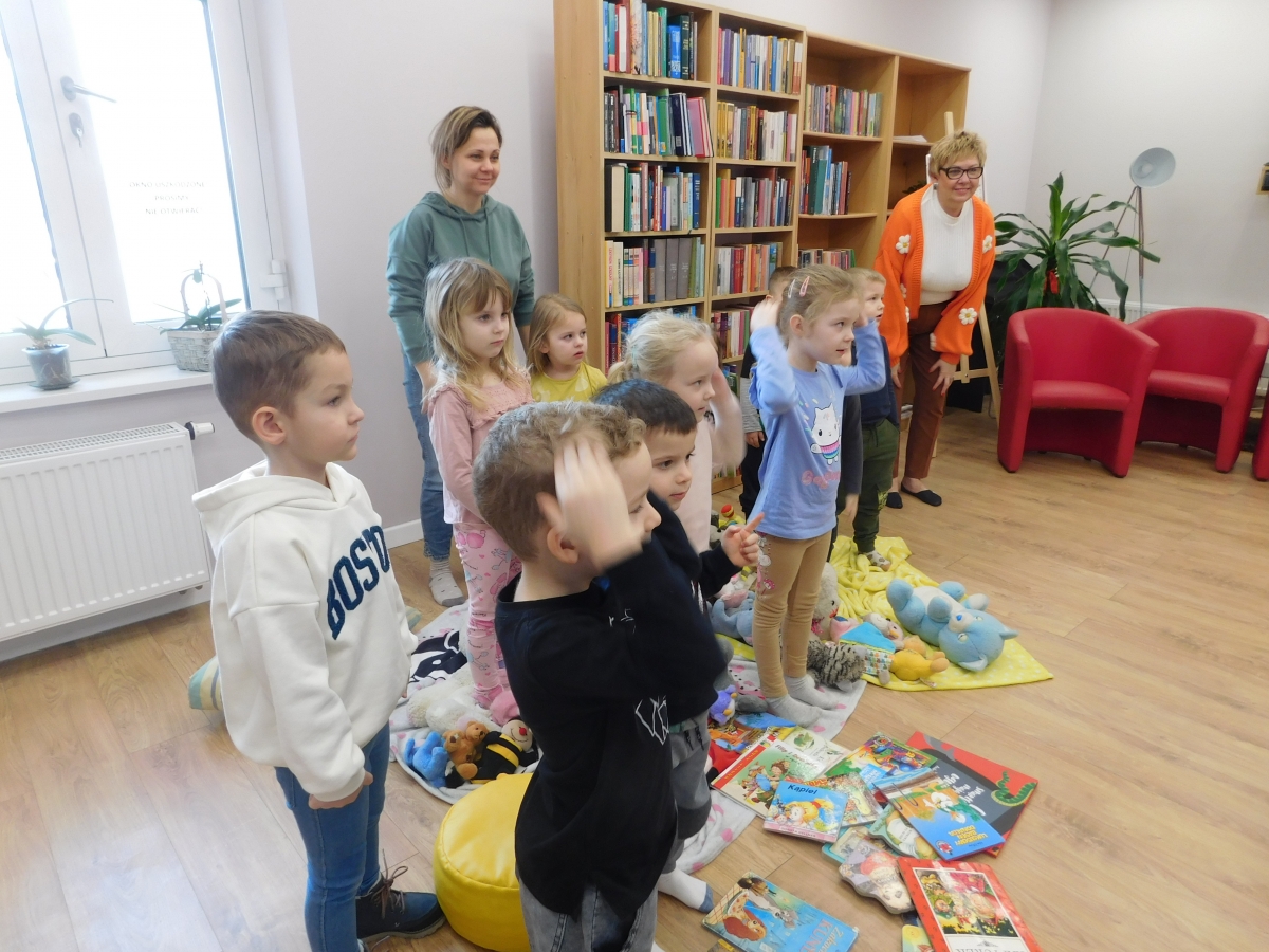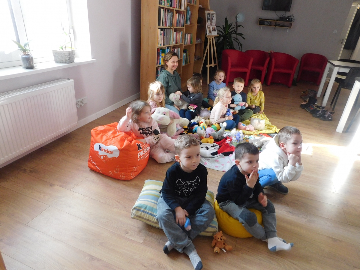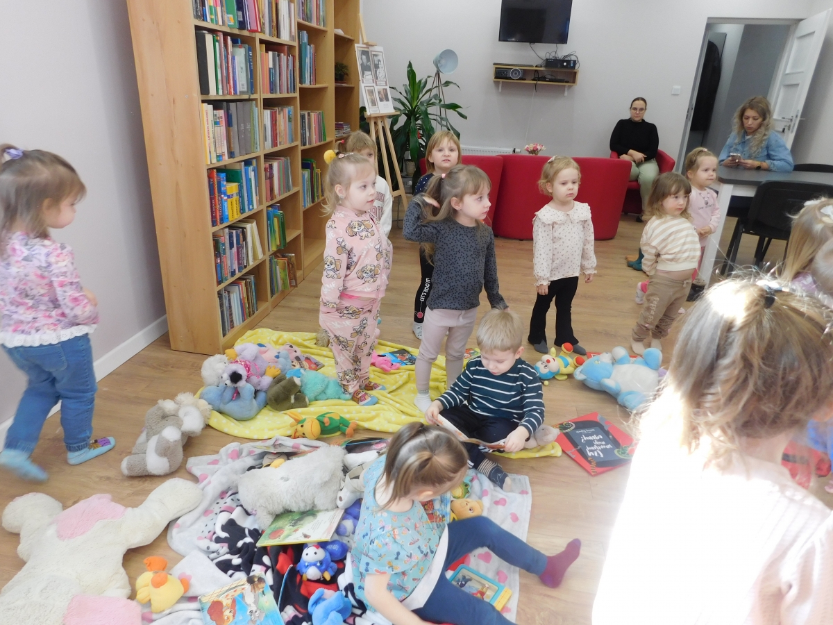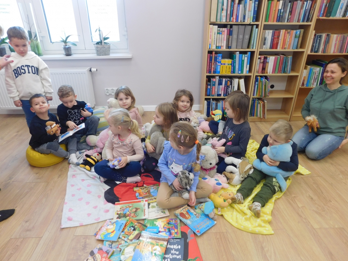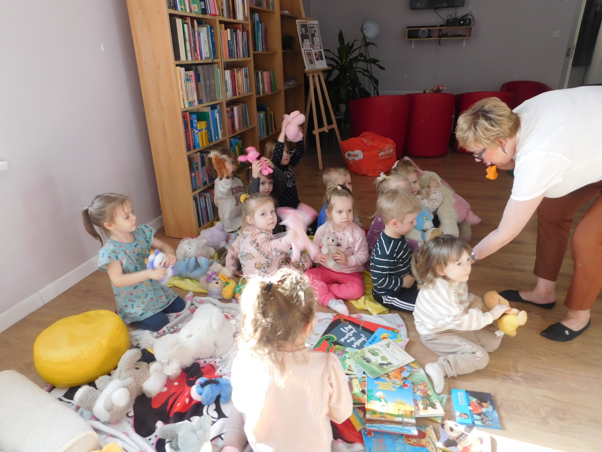 Na początku Pani Ewa Lewandowska przywitała wszystkie dzieci, opowiedziała o bibliotece oraz zaprosiła do wspólnej zabawy. Dodatkowo maluchy dostały maskotki, które miały być ich towarzyszami w trakcie spotkania. Pokazywały im otrzymane na zajęcia książki, a następnie oglądały z nimi bajki.