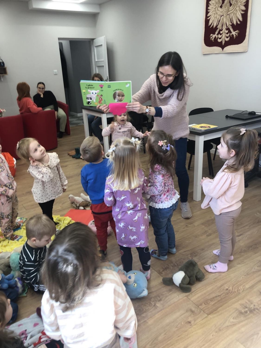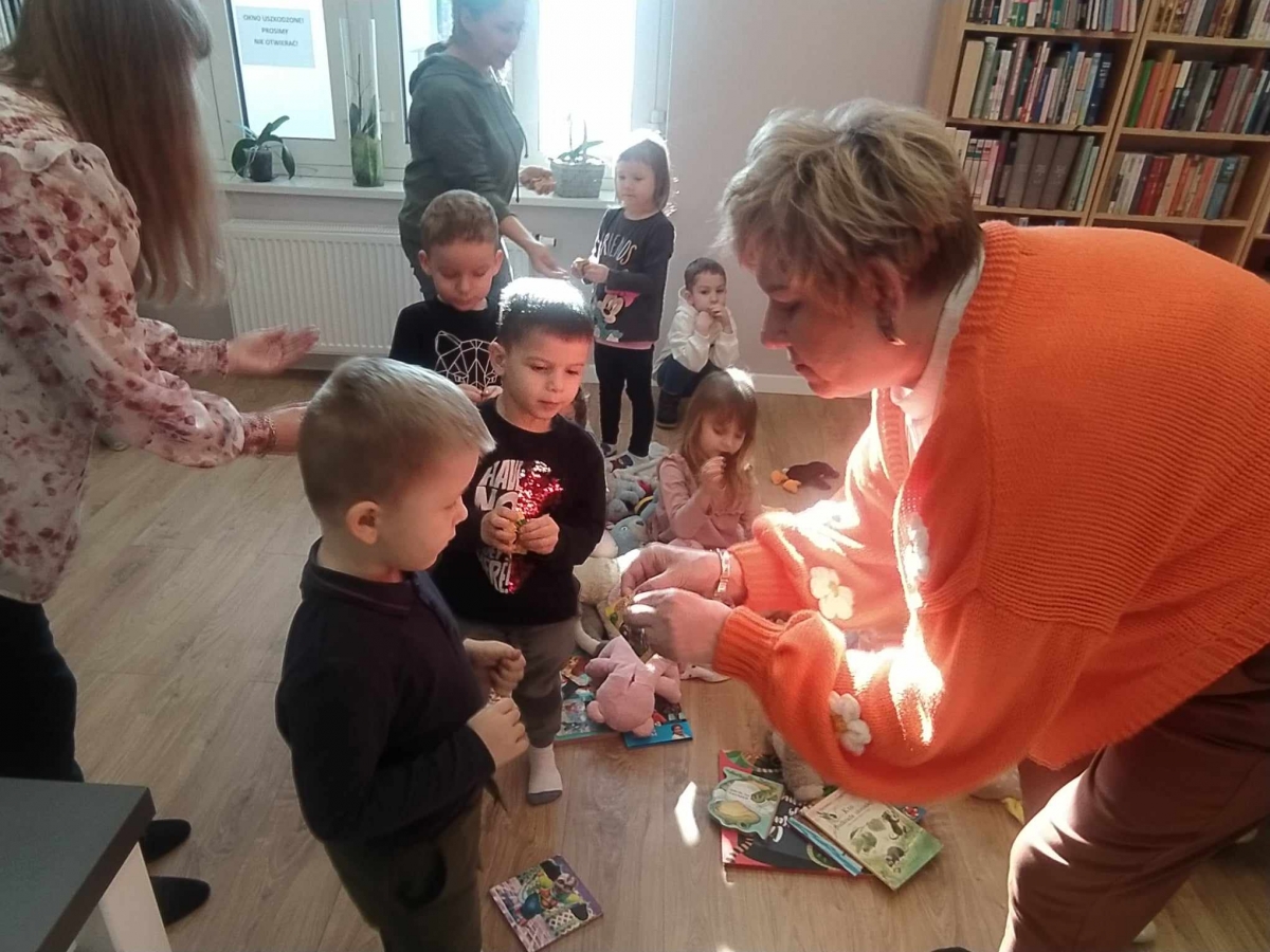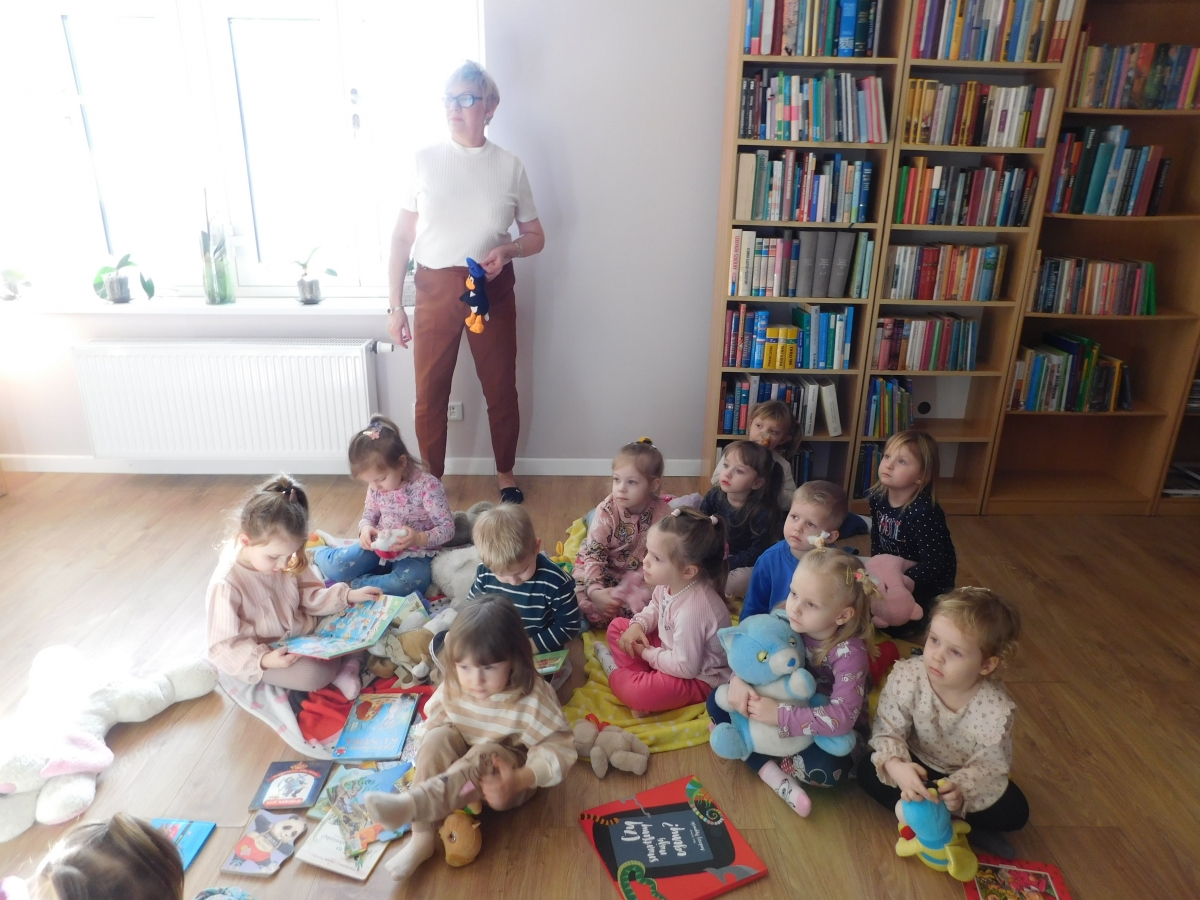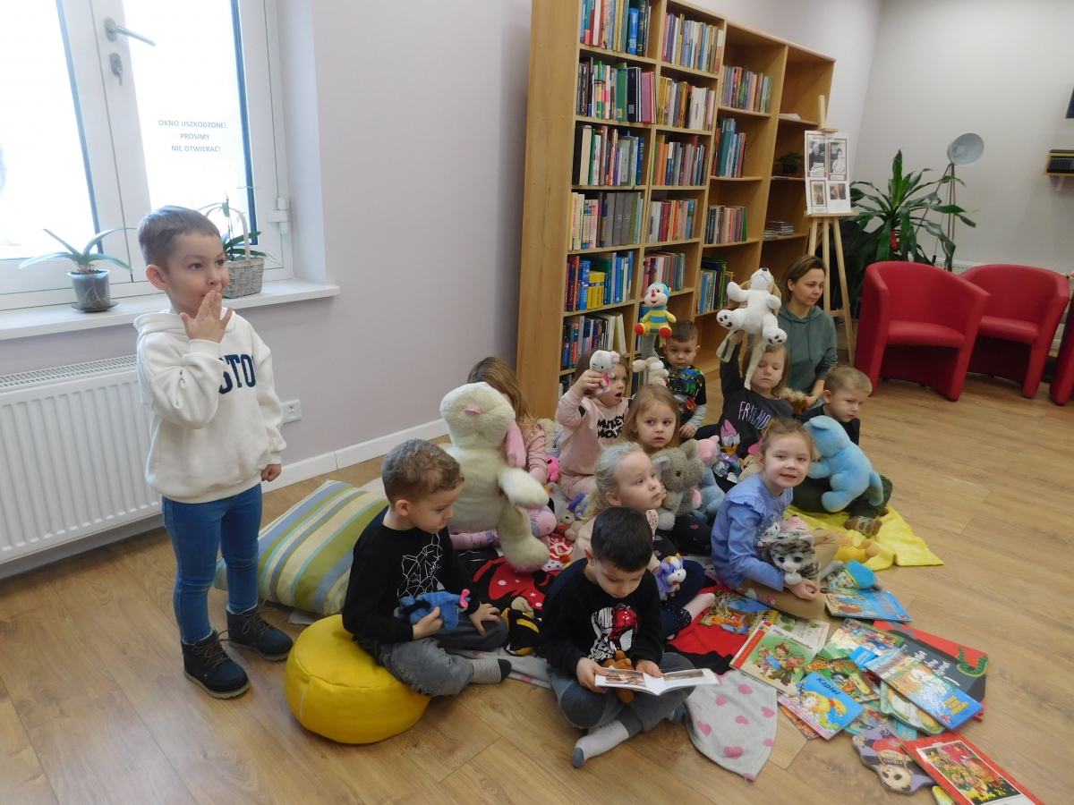 Na początku Pani Ewa Lewandowska przywitała wszystkie dzieci, opowiedziała o bibliotece oraz zaprosiła do wspólnej zabawy. Dodatkowo maluchy dostały maskotki, które miały być ich towarzyszami w trakcie spotkania. Pokazywały im otrzymane na zajęcia książki, a następnie oglądały z nimi bajki.