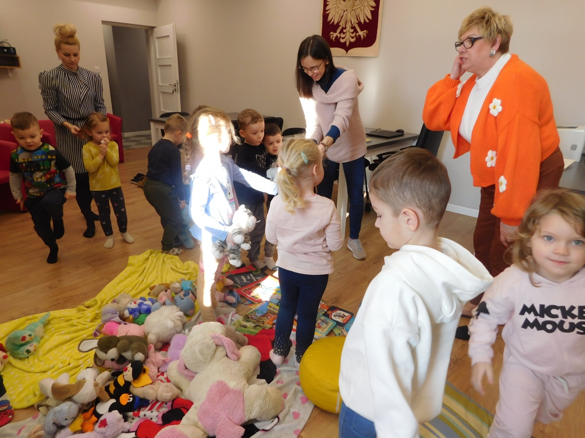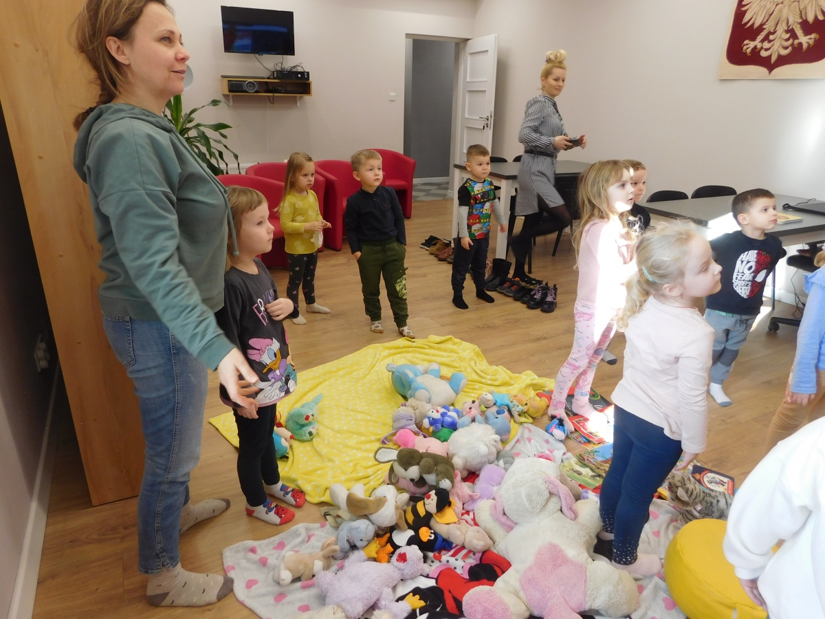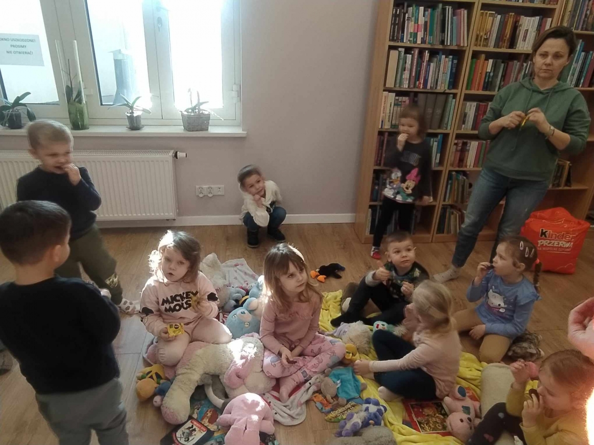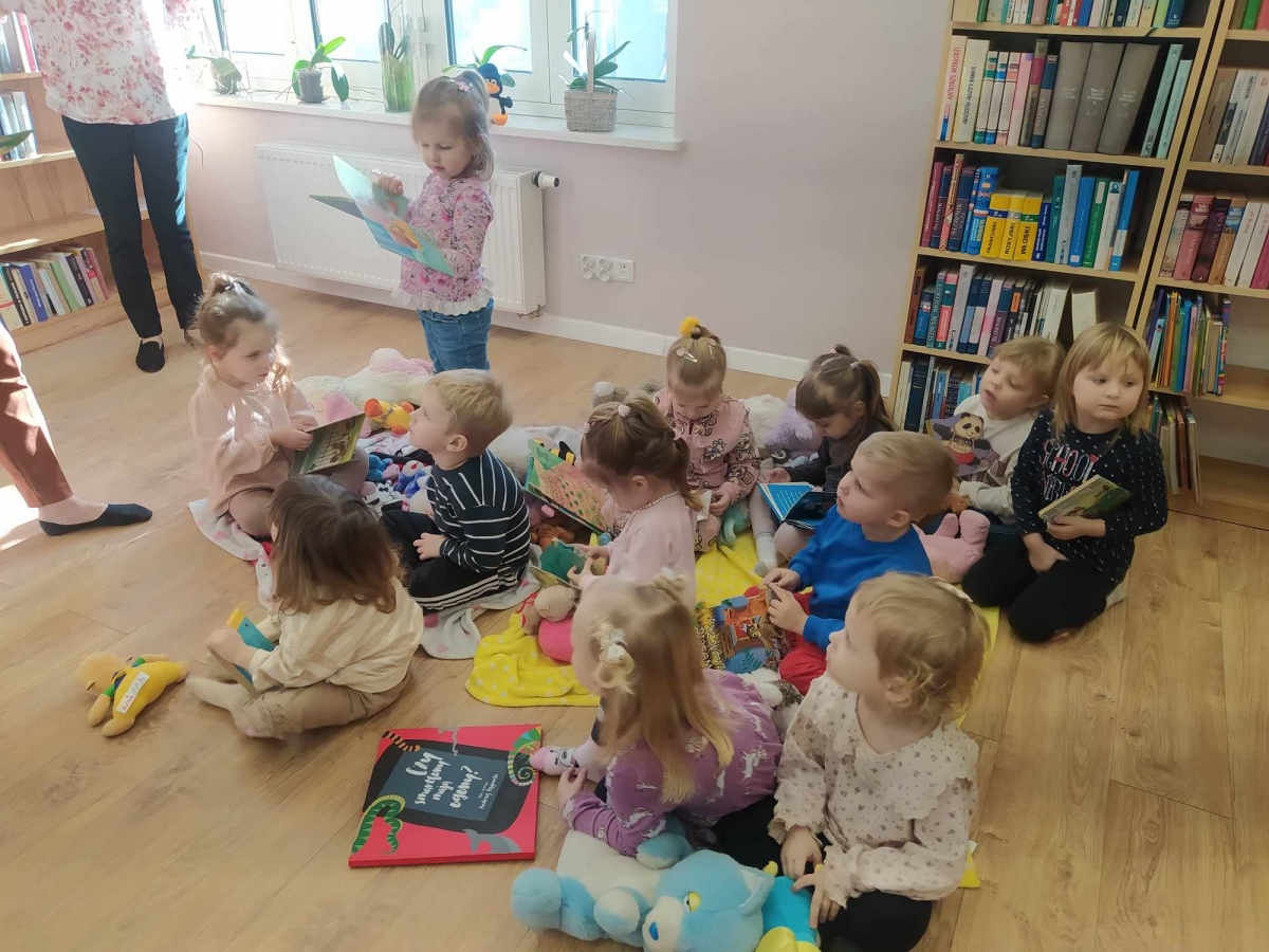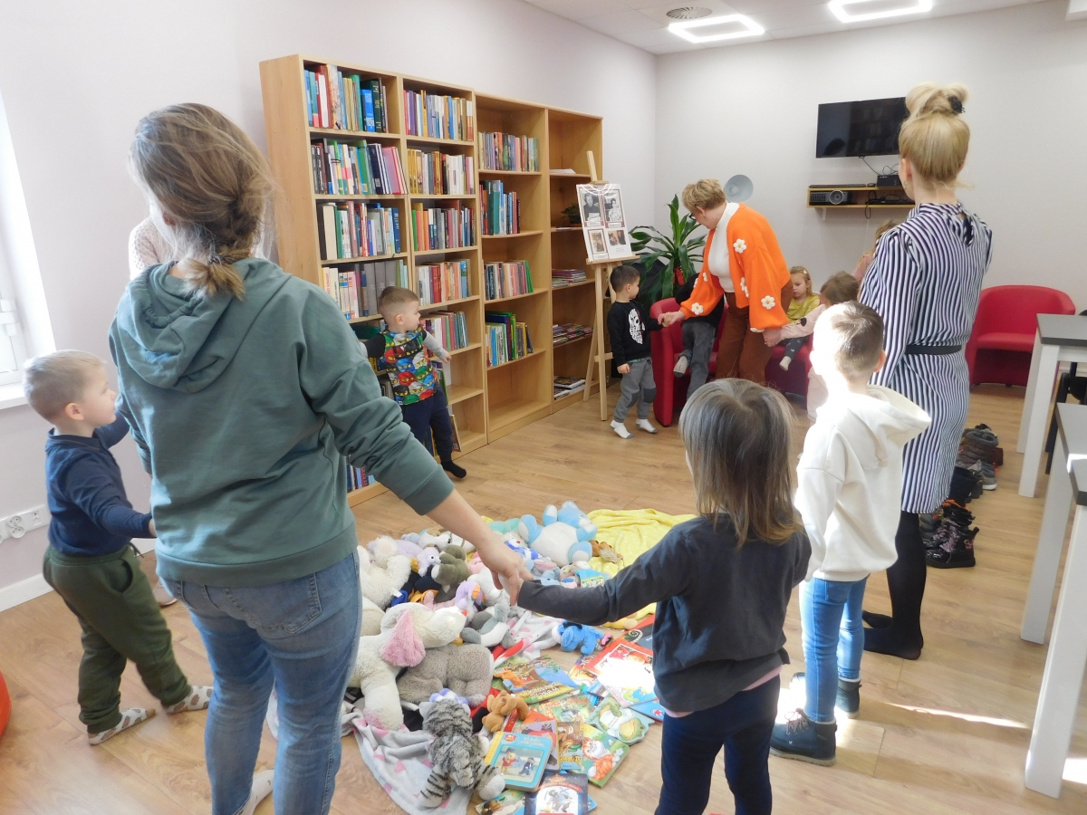 Na początku Pani Ewa Lewandowska przywitała wszystkie dzieci, opowiedziała o bibliotece oraz zaprosiła do wspólnej zabawy. Dodatkowo maluchy dostały maskotki, które miały być ich towarzyszami w trakcie spotkania. Pokazywały im otrzymane na zajęcia książki, a następnie oglądały z nimi bajki.