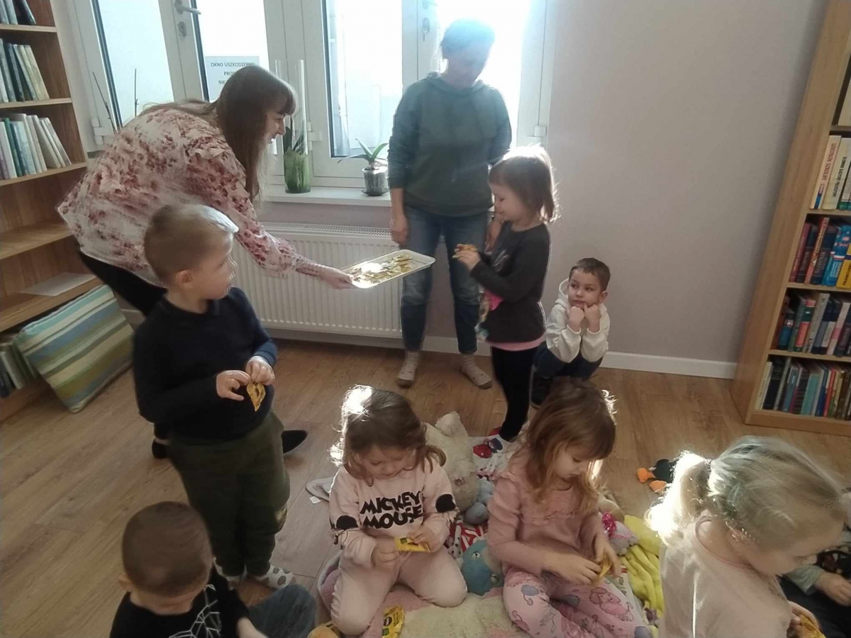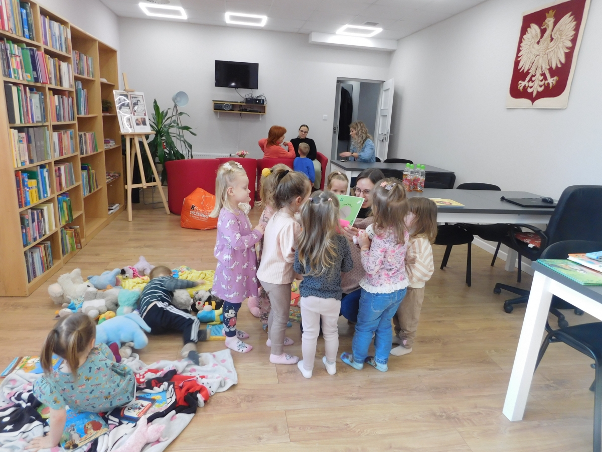 W piątek 16 lutego MGBP w Gąbinie odwiedziły dzieci z Przedszkola Samorządowego w Dobrzykowie. Grupy Biedronek i Smerfów wysłuchały książek o kurczaczku I. Arhhenius, niedźwiadku Olku N. Kawałko-Dzikowskiej oraz bawiły się w kółku.