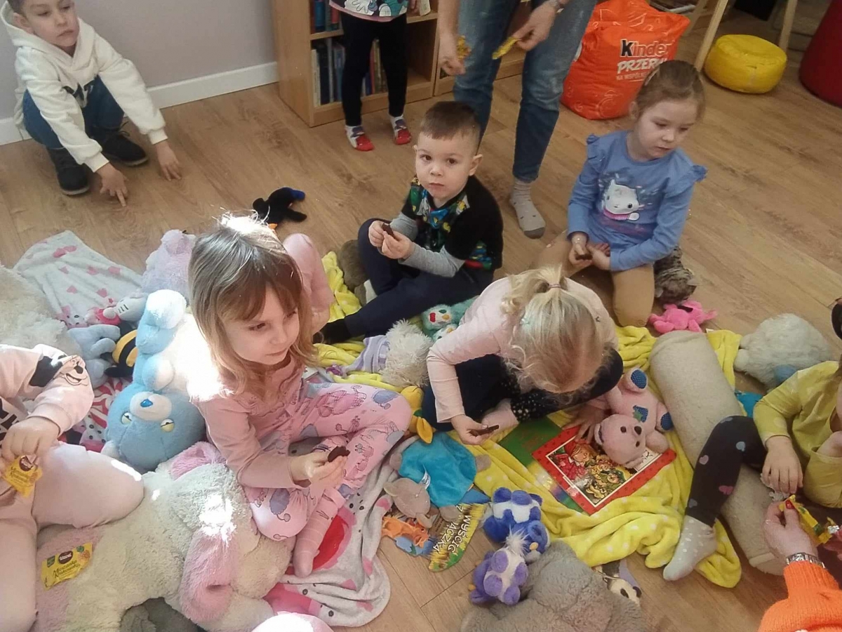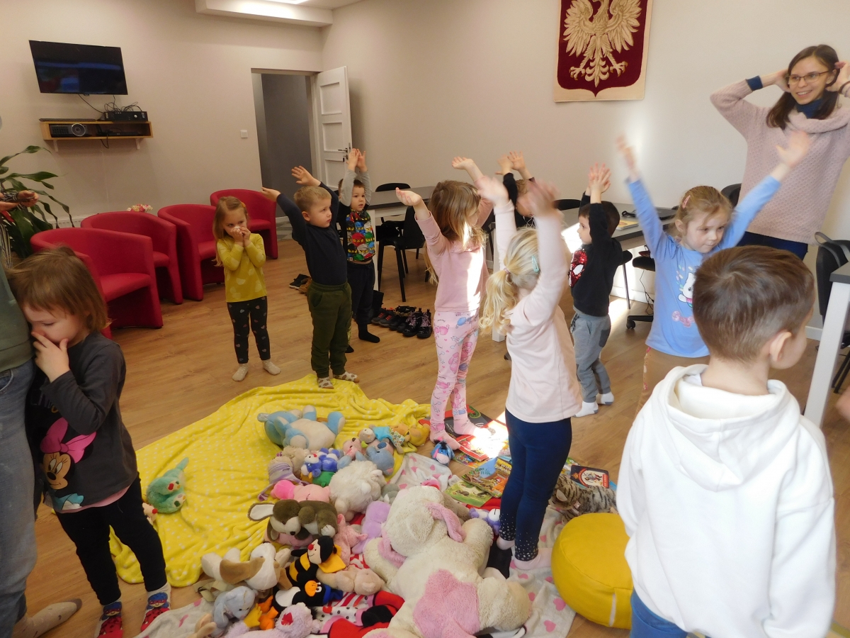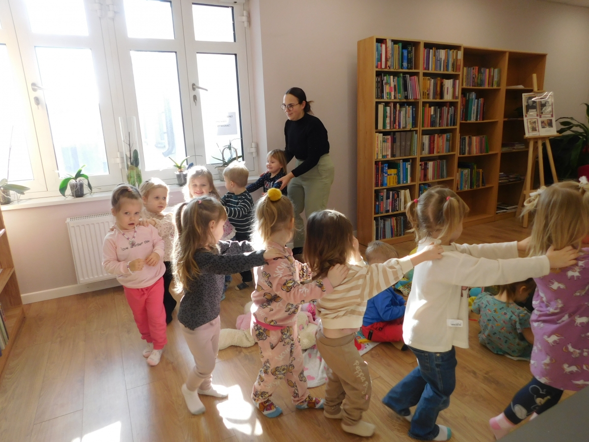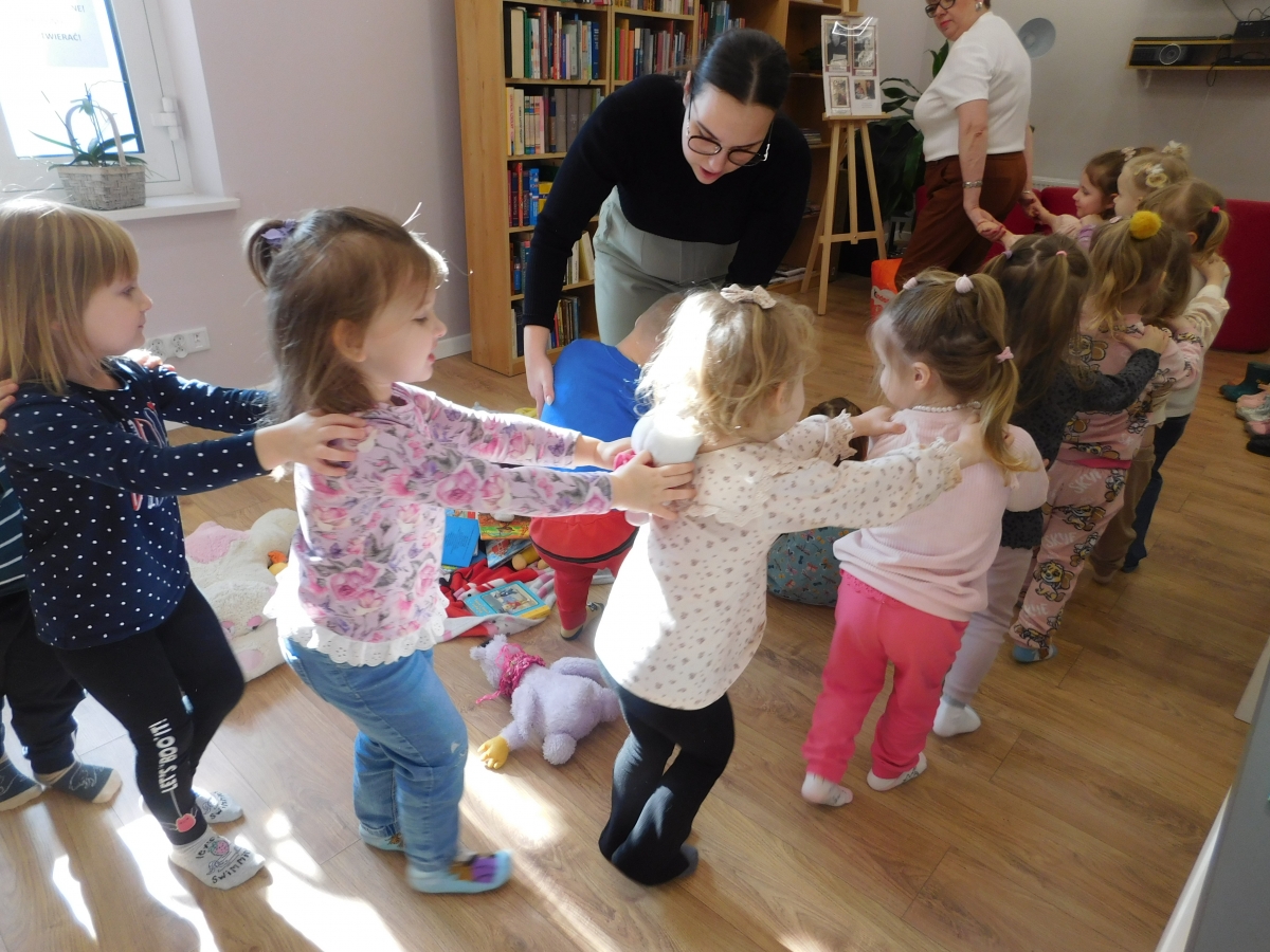 Dodatkowo podczas spotkania nasi mali goście bawili się przy piosence pt. ,,Stary niedźwiedź mocno śpi”, ,,Kółko graniaste” i utworzyły pociąg, którym ,,jeździły” po całej sali. Gdy poruszali się jedno za drugim został im przeczytany wiersz pt. ,,Lokomotywa” Juliana Tuwima. Na dźwięki niektórych słów z utworu żywo reagowali i naśladowali pociąg!