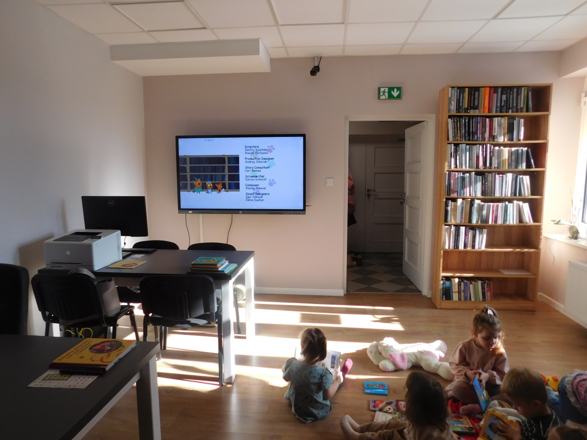 Ponadto na ekranie telewizora zostały zaprezentowane bajki z serii ,,Kot-O-Ciaki” odcinki o bibliotece i labiryncie, piosenka pt. ,,Kilku kumpli weź” z Kubusia Puchatka oraz utwór Babci Gruni pt. ,,Mądra rzeka w bibliotece”. Podczas tej ostatniej dzieci naśladując Panią Bibliotekarkę wykonywały różne ruchy, kołysały się, klaskały i podskakiwały.